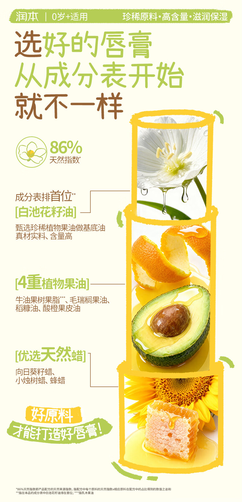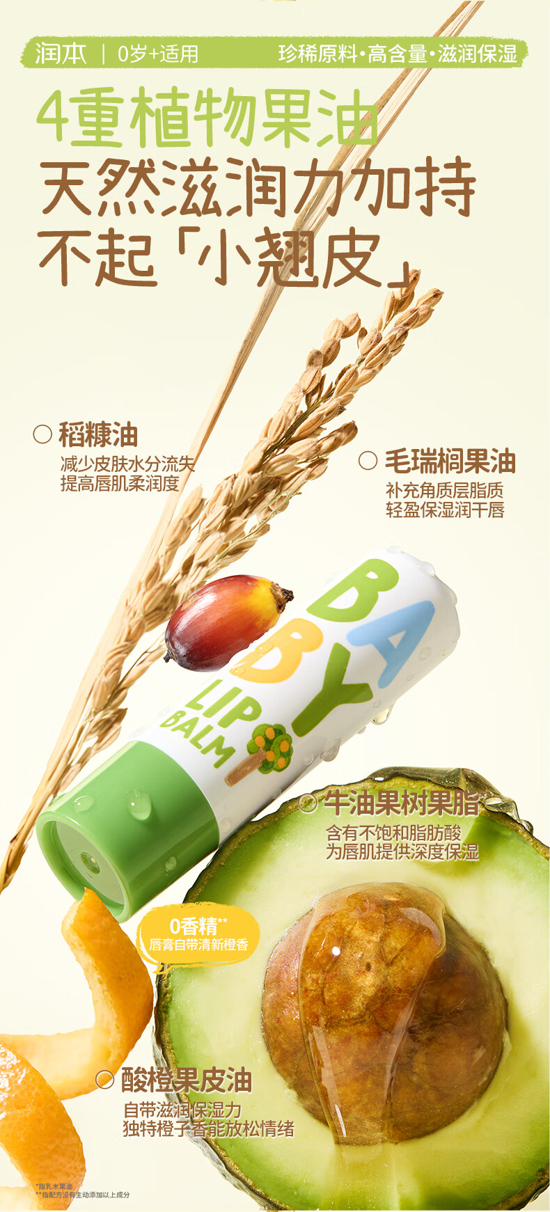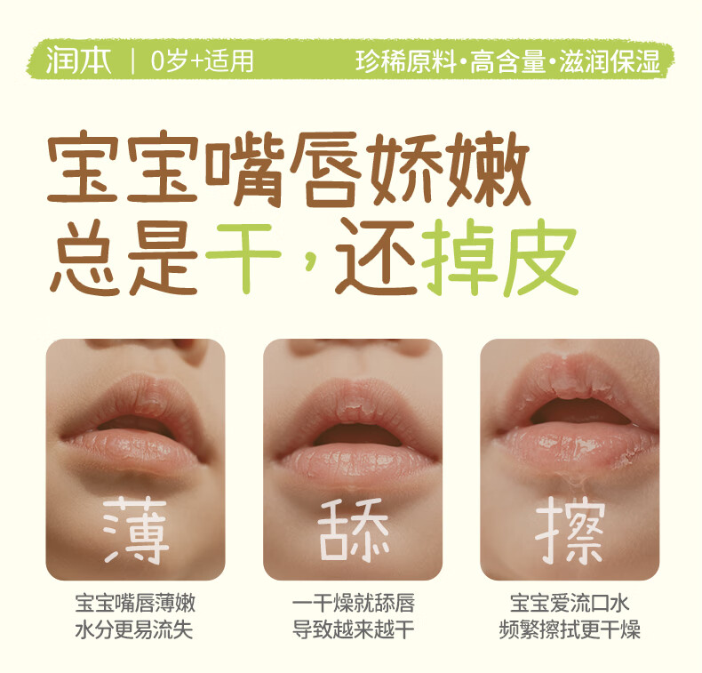 多种天然植萃果油,润护宝宝唇肌;补水保湿改善干燥紧绷不适感;让肌肤柔嫩水润