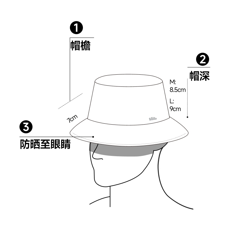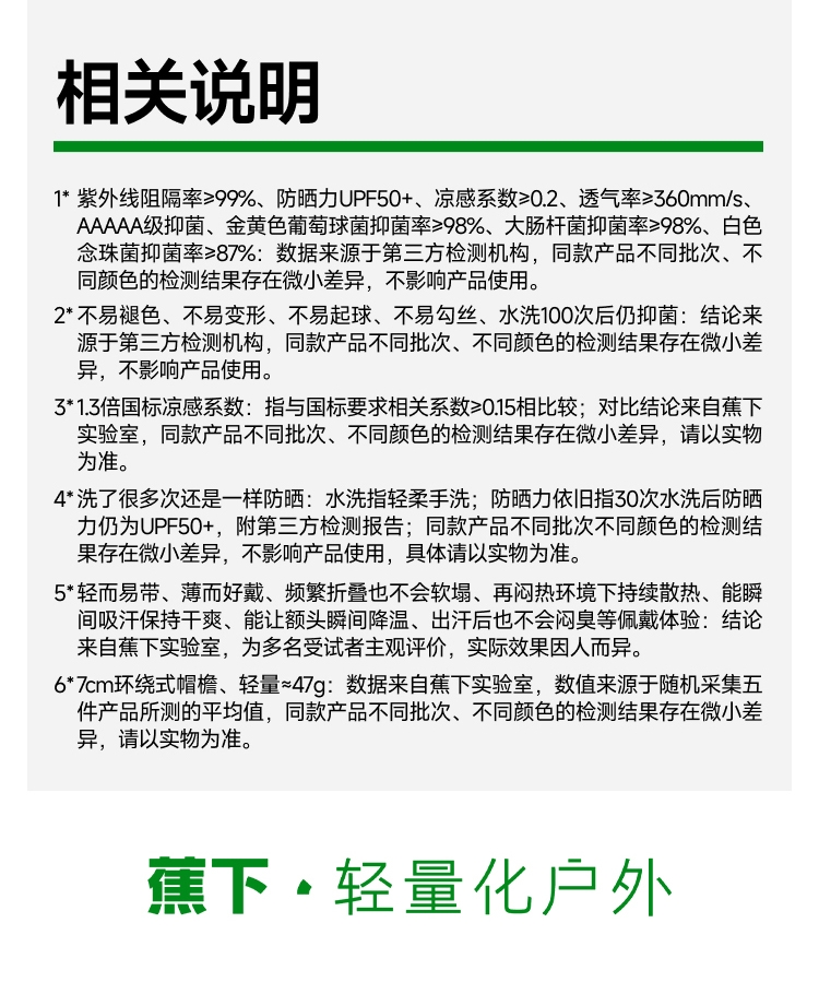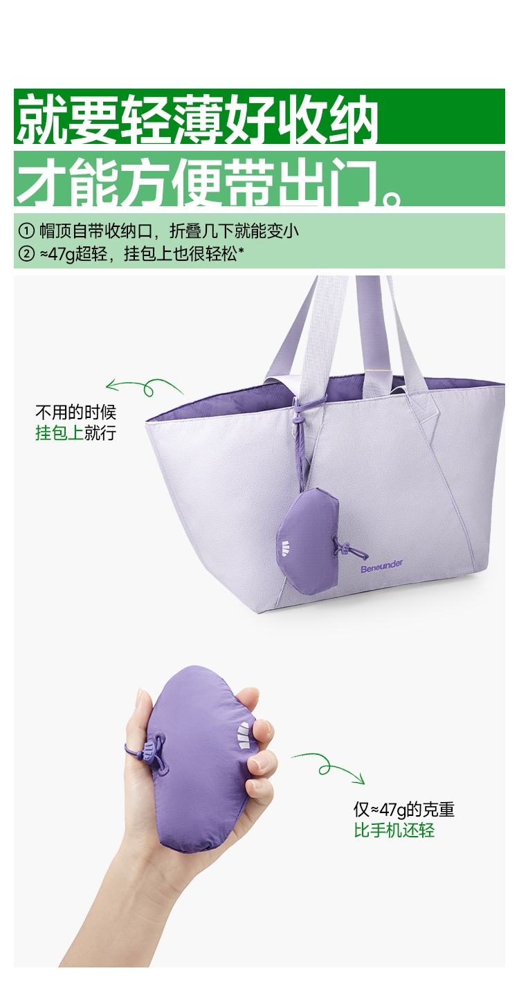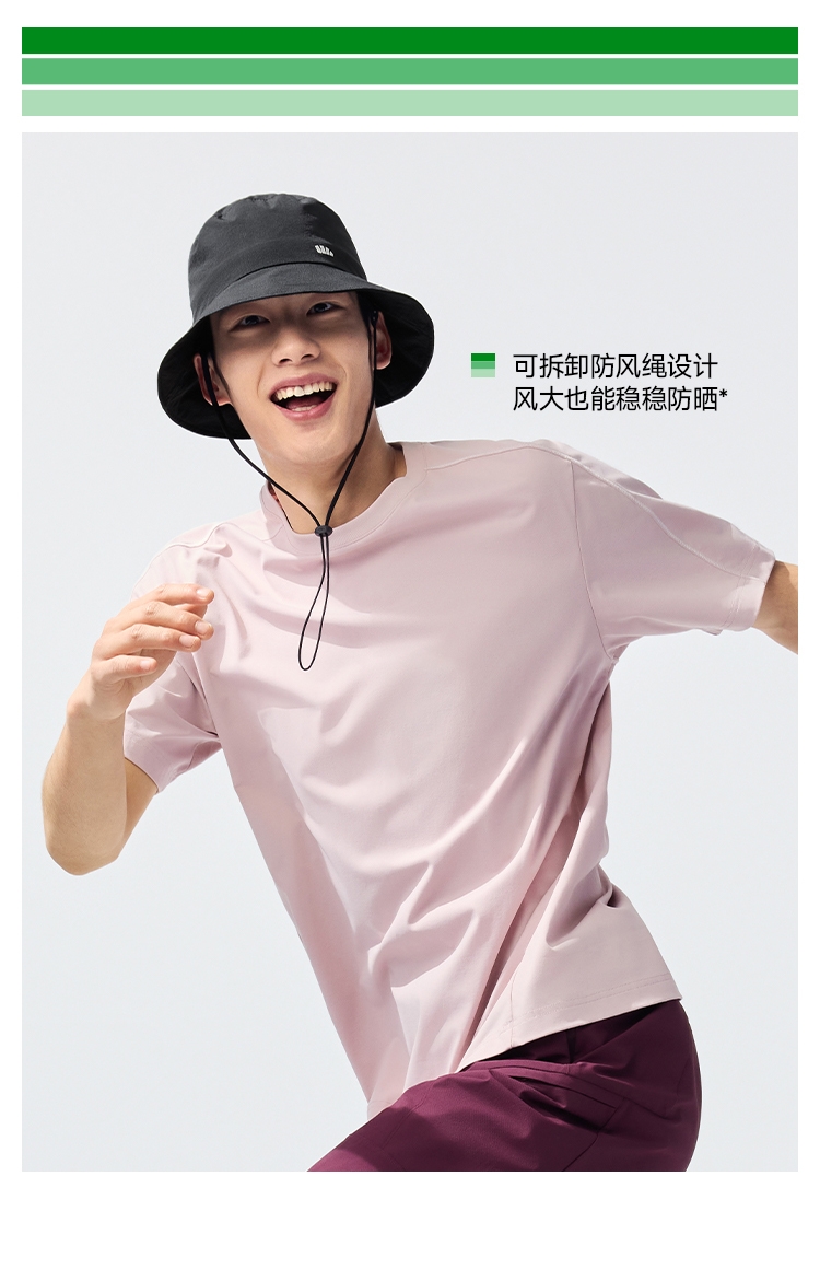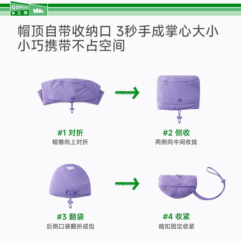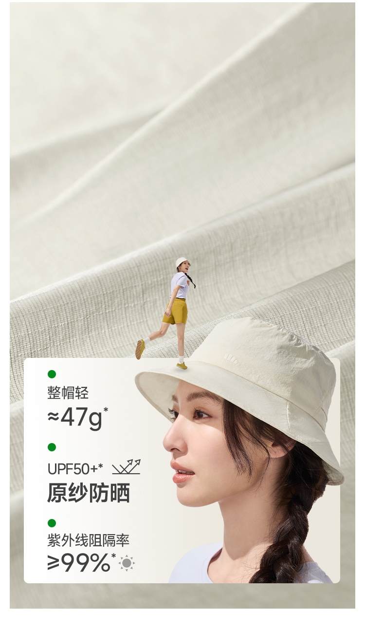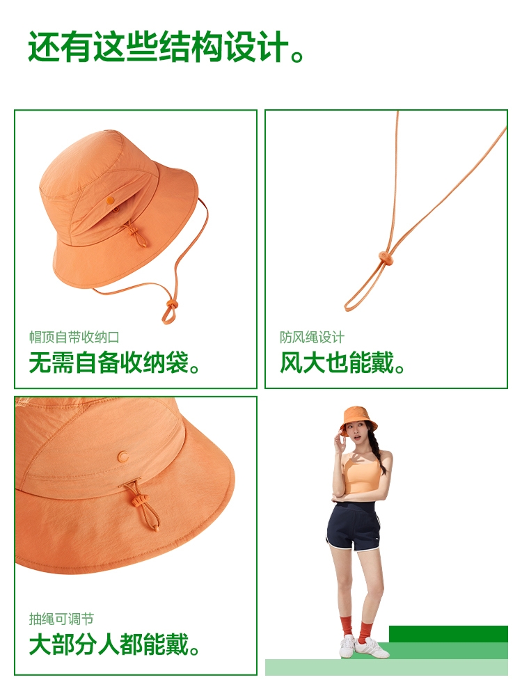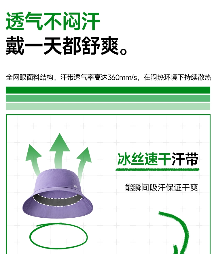 透气率高达360mm/s、持久防晒不闷热;帽顶自带收纳口、3秒收成掌心大小、小巧携带不占空间;UPF50+、环绕式全脸防晒、紫外线阻隔率>99%