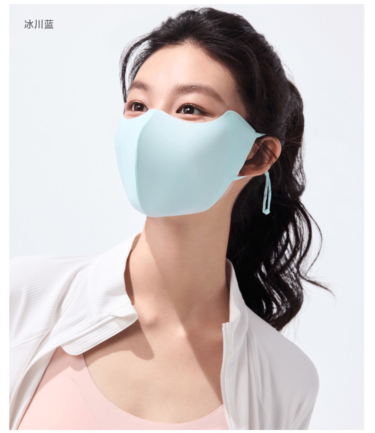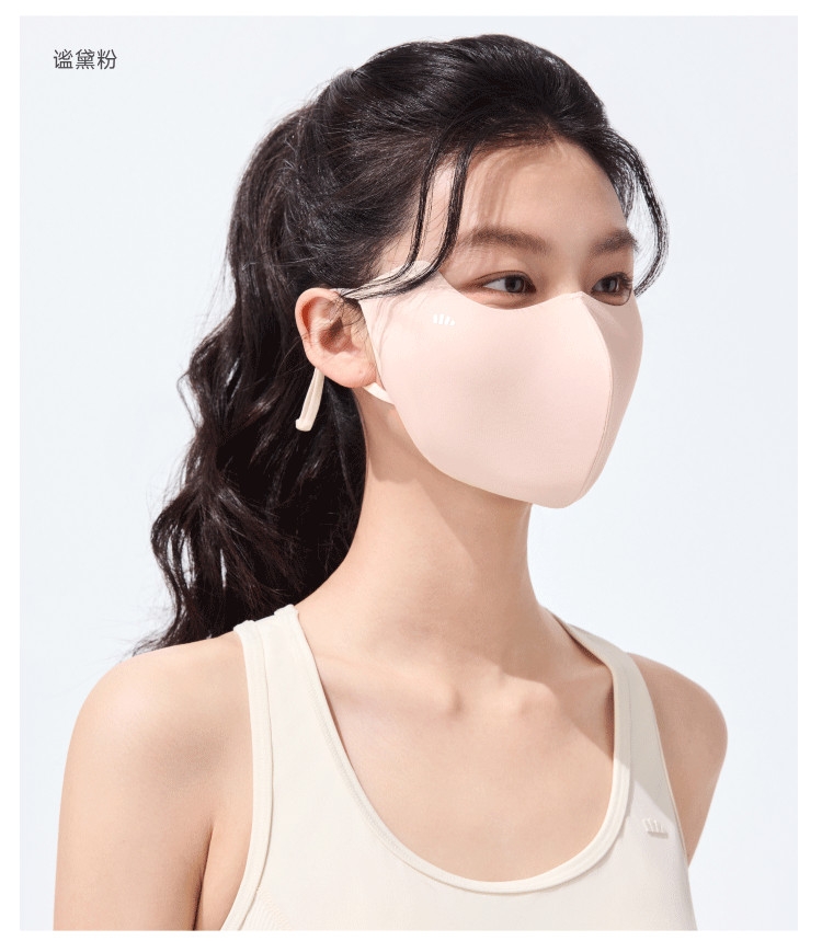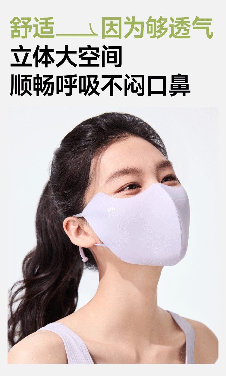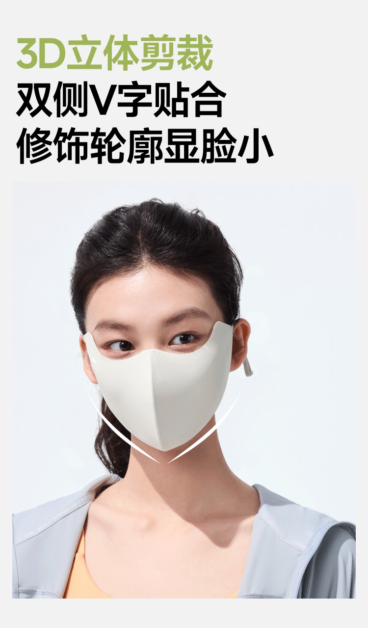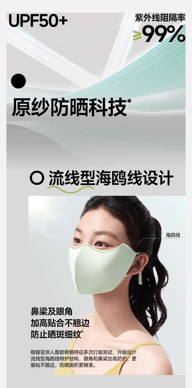 高倍防晒护眼角、热感速降、戴全天更凉快;立体支撑不易蹭口红、大口呼吸不糊嘴;高倍原纱防晒加高护眼角、防止晒斑细纹