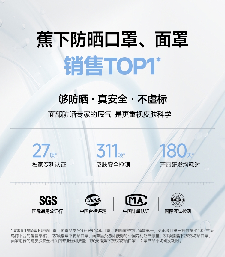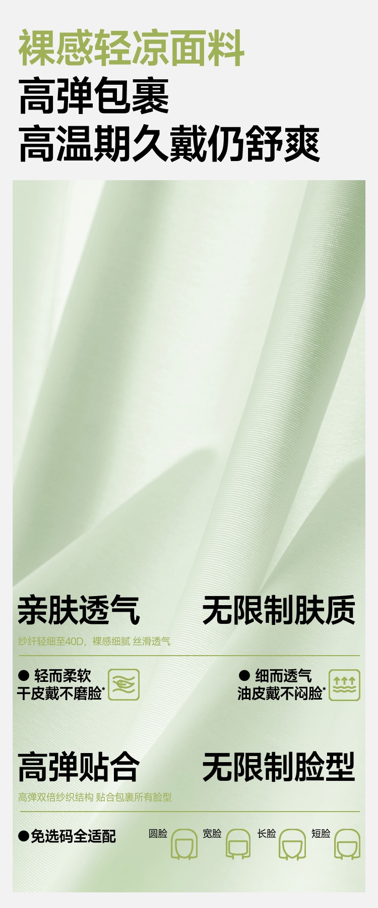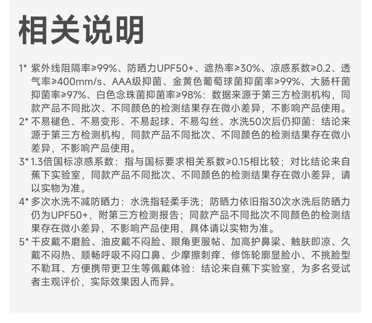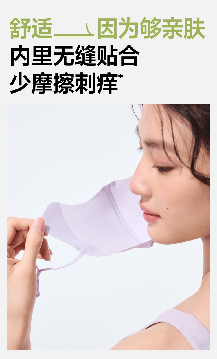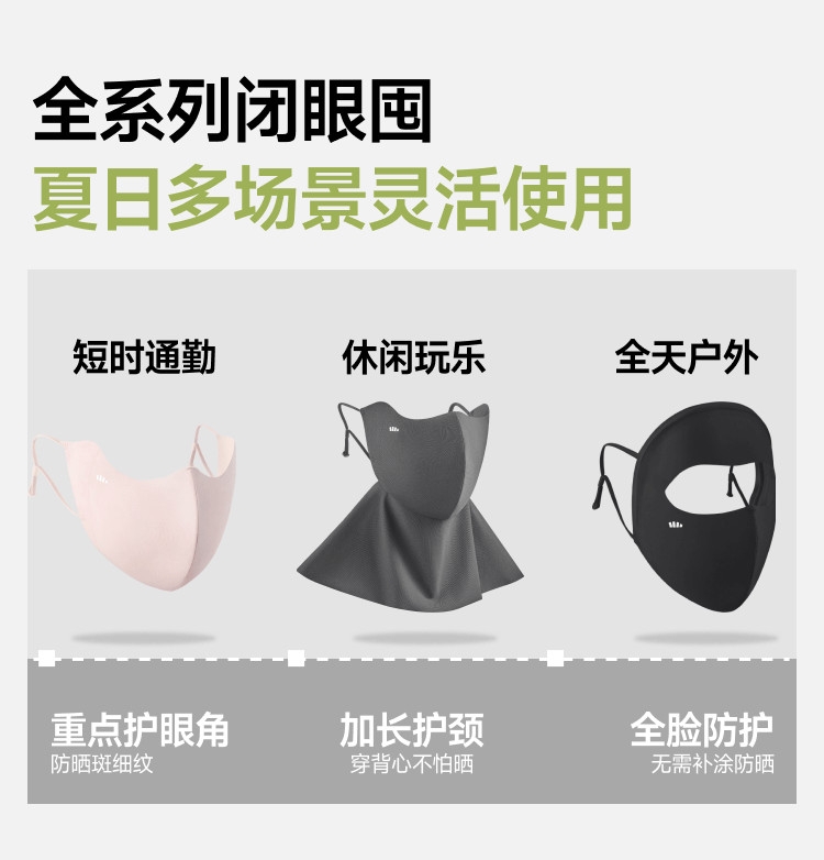 高倍防晒护眼角、热感速降、戴全天更凉快;立体支撑不易蹭口红、大口呼吸不糊嘴;高倍原纱防晒加高护眼角、防止晒斑细纹