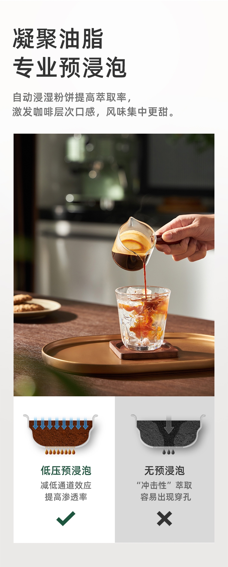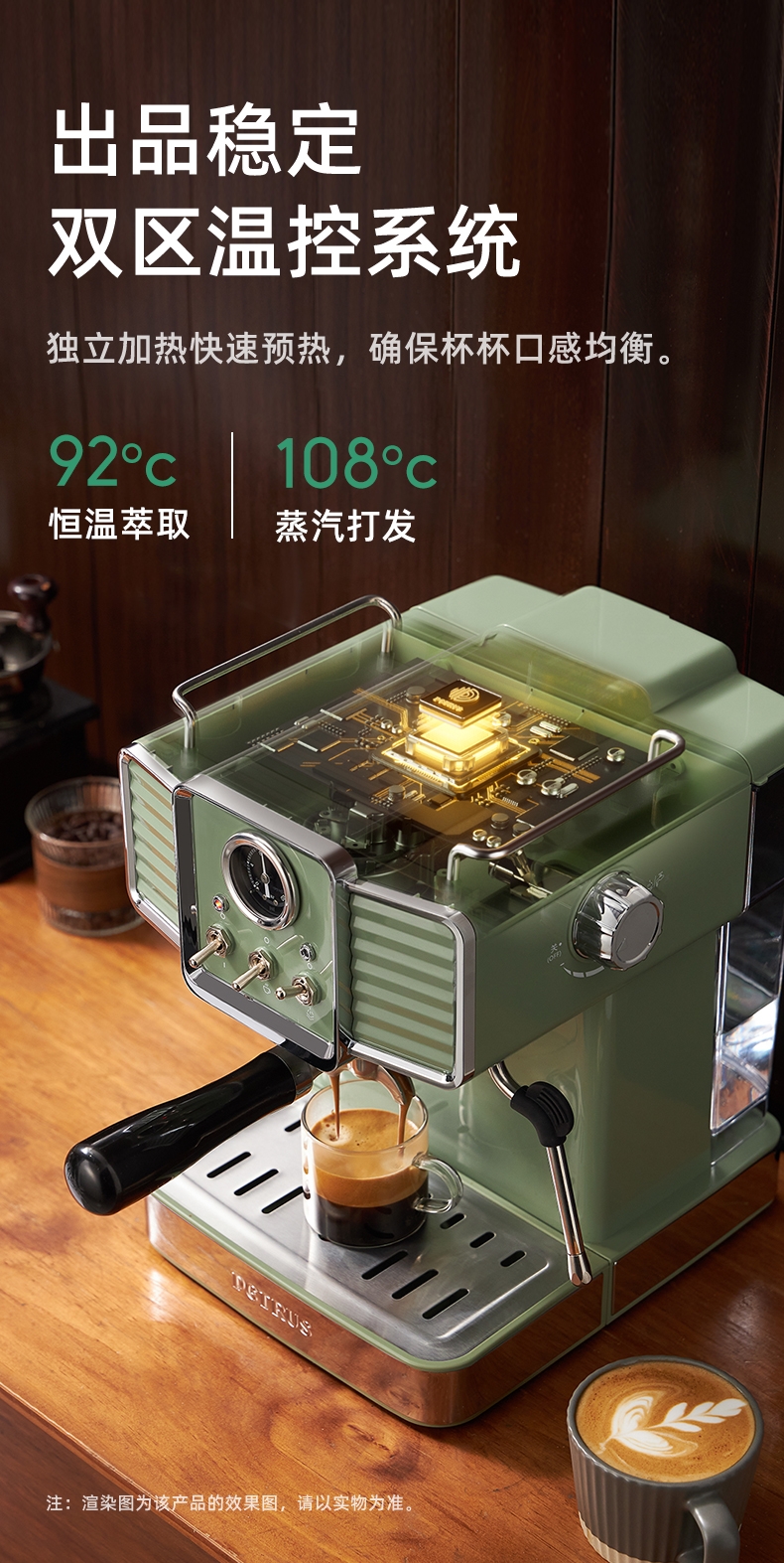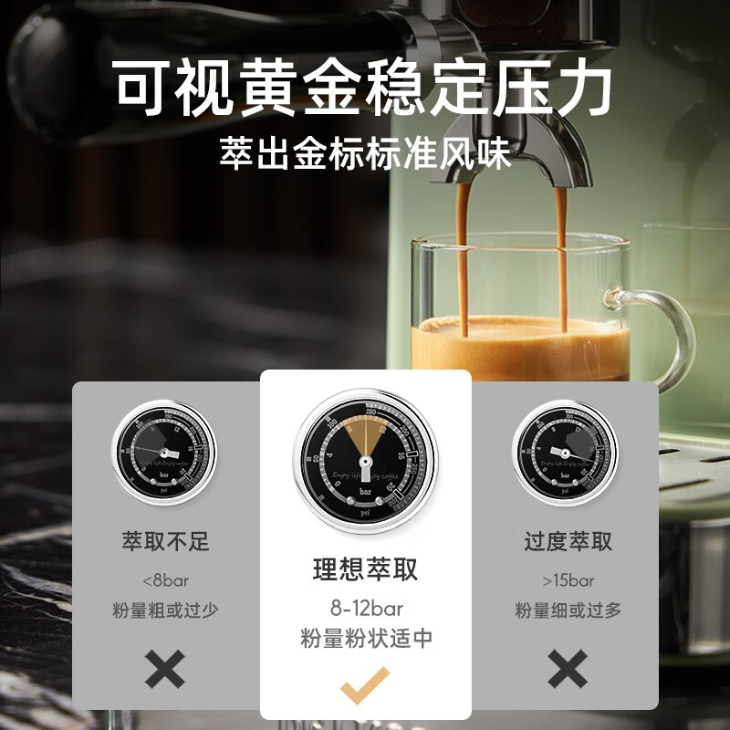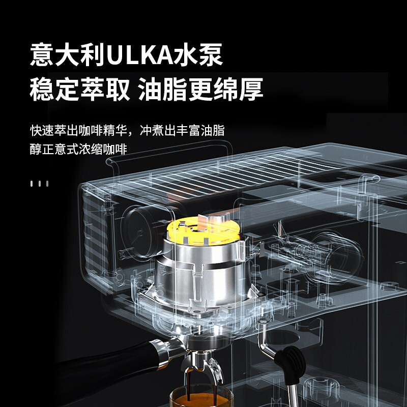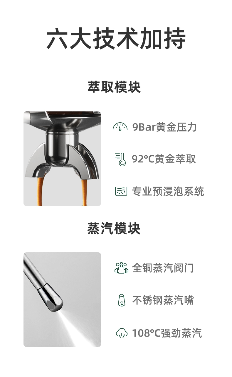 意大利进口UKLA泵,精确控制9bar黄金压力;全铜蒸汽打发系统,不锈钢冲煮,商用级手柄;内置双驱温控器,独立水温系统,精准萃取