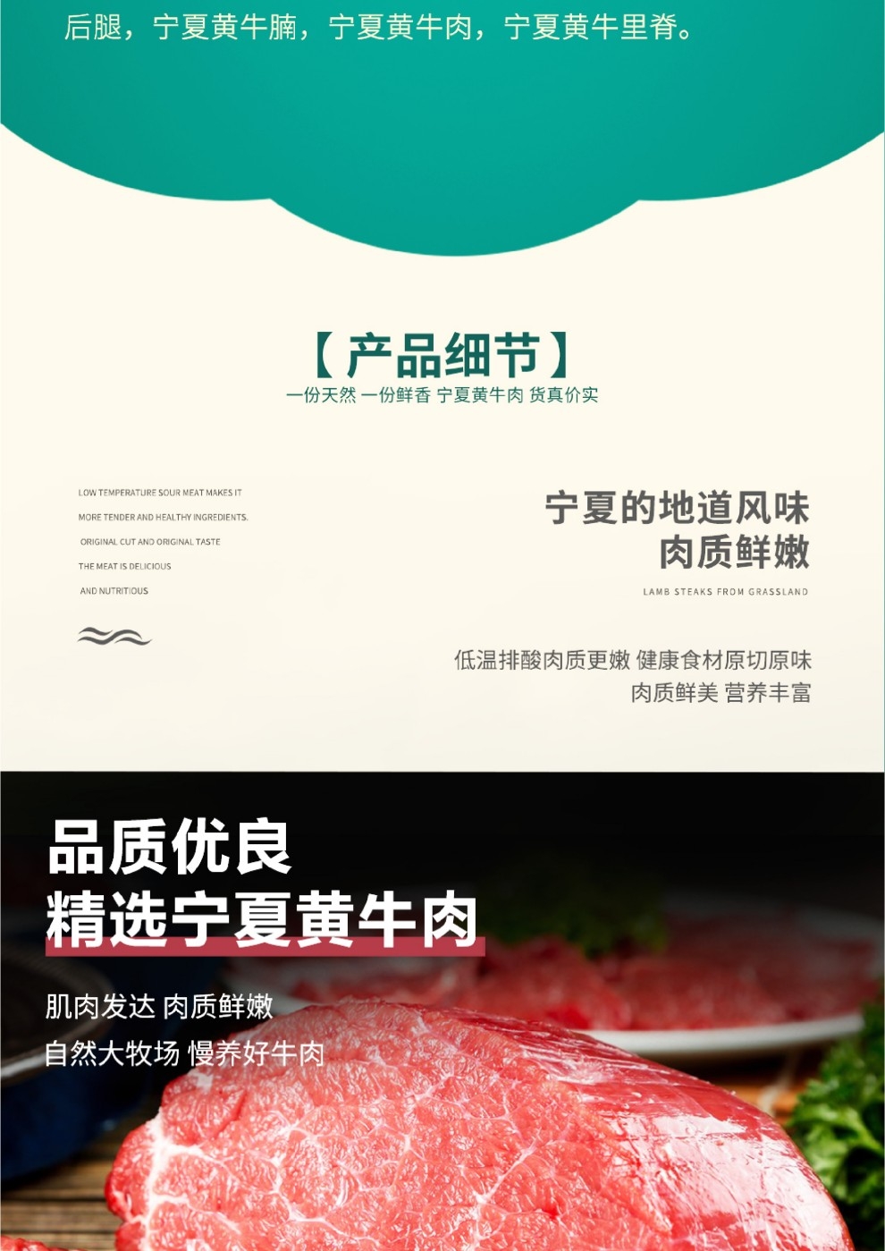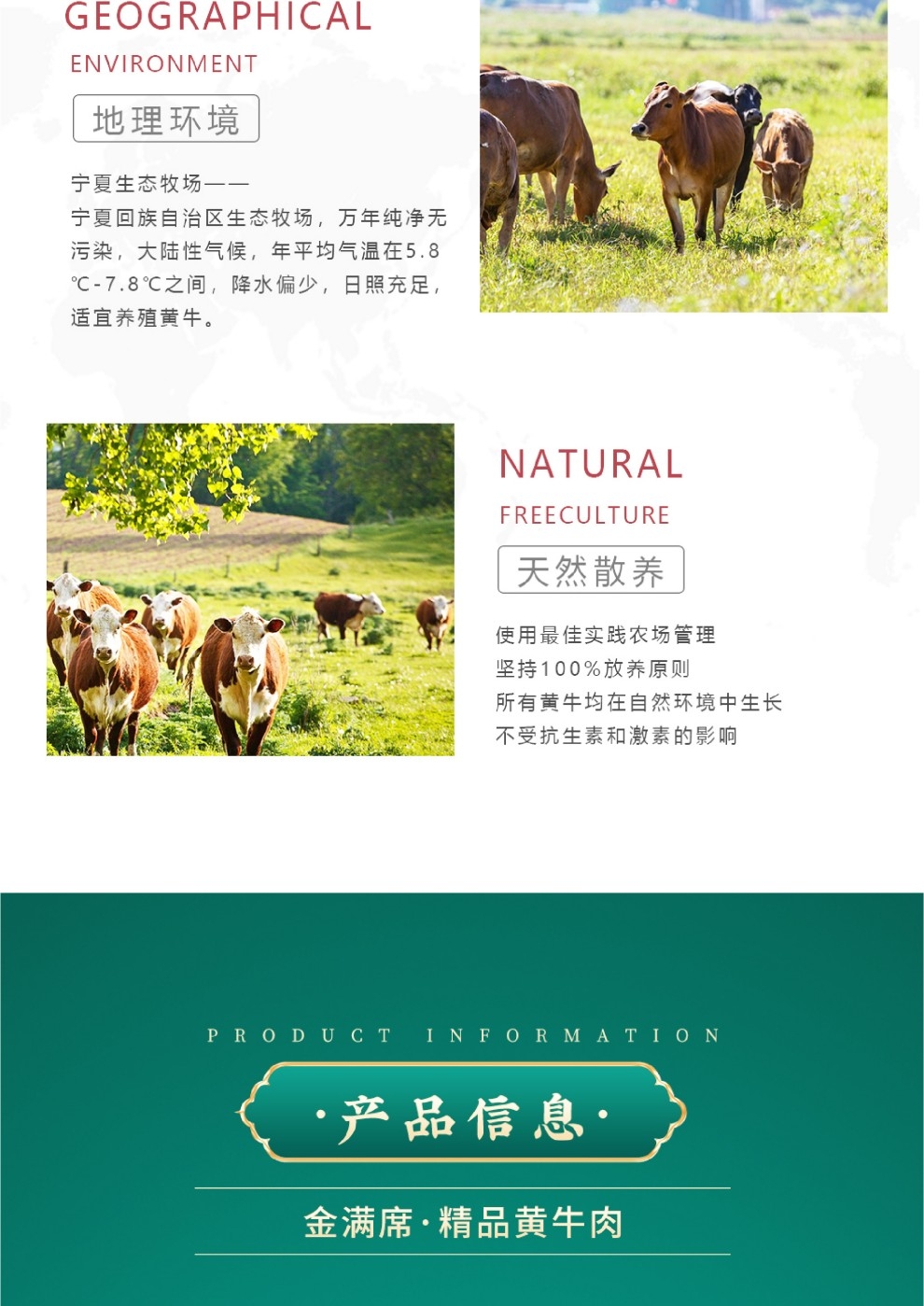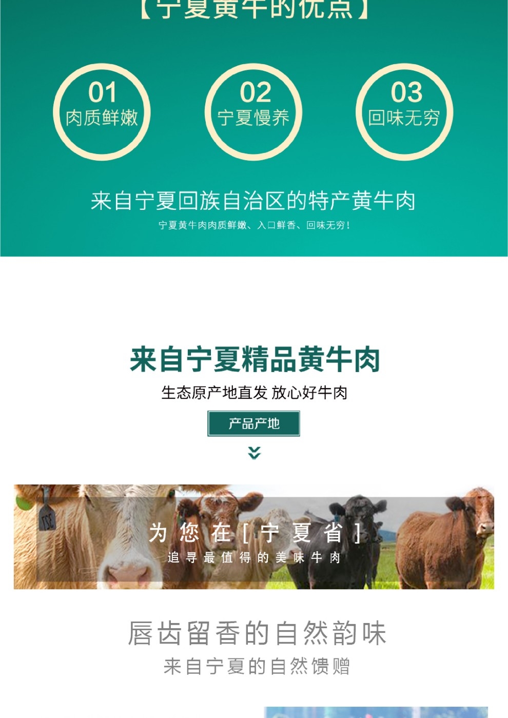 生态原产地直发 放心好牛肉;天然散养 坚持100%散养原则;肉质鲜嫩 口感鲜美 嚼劲十足