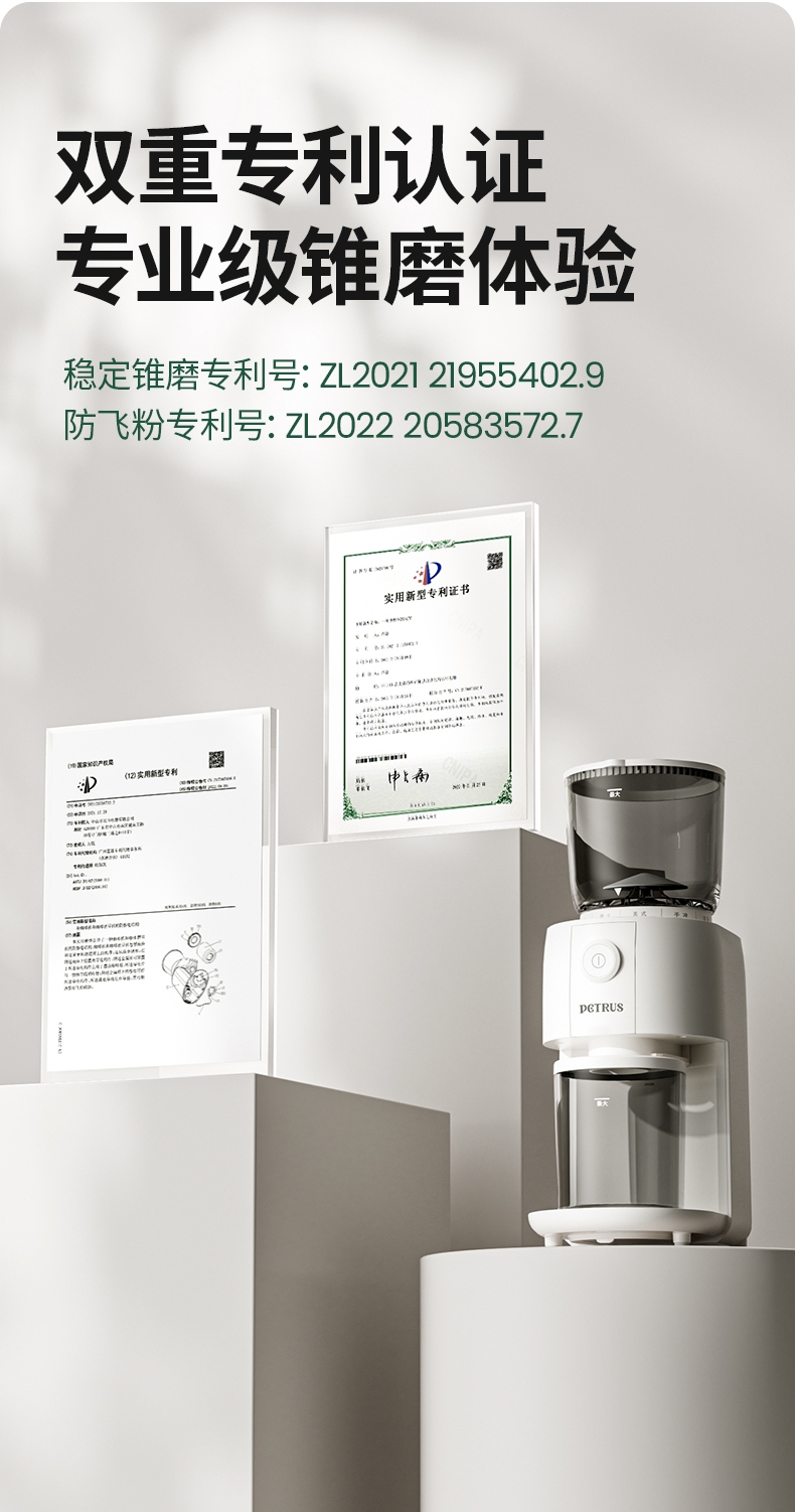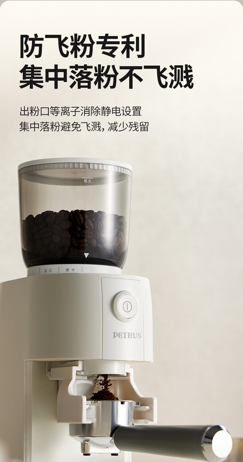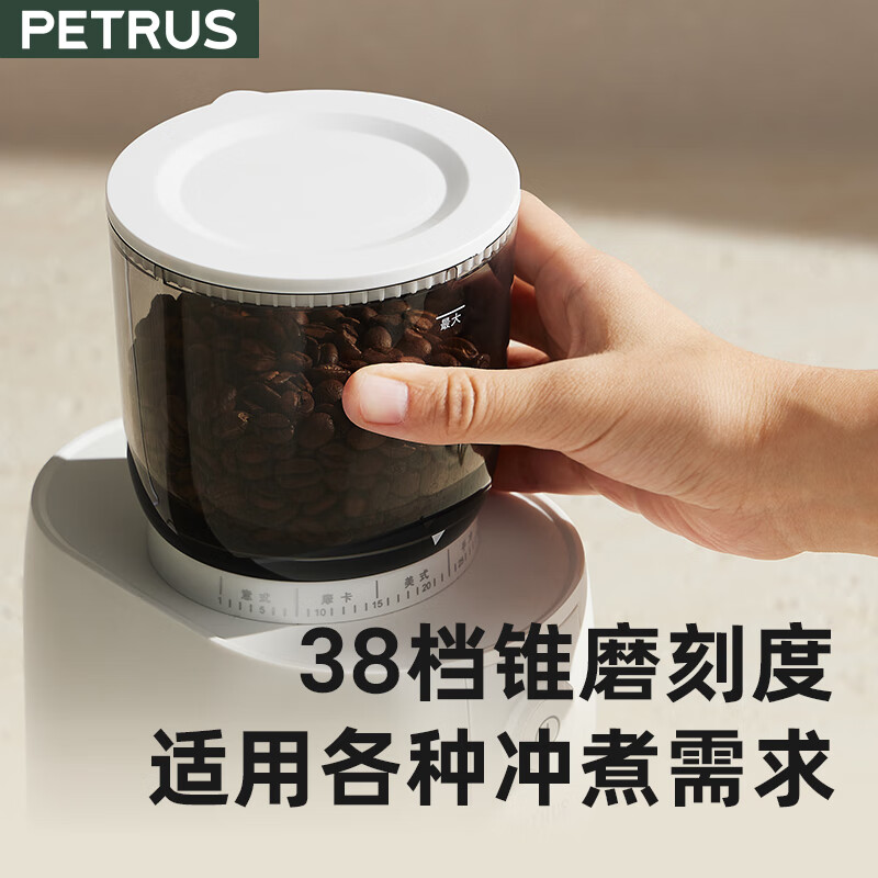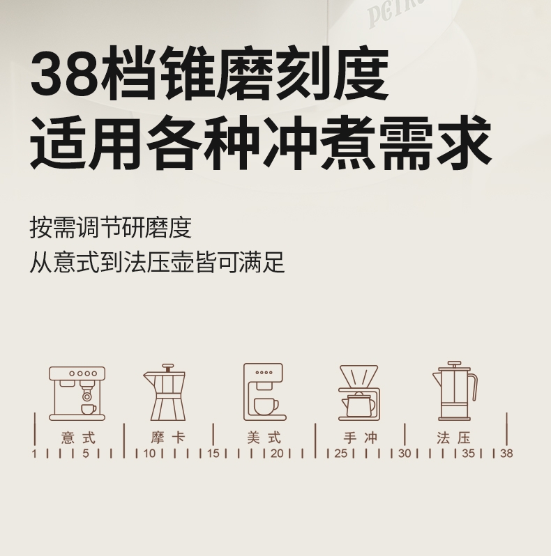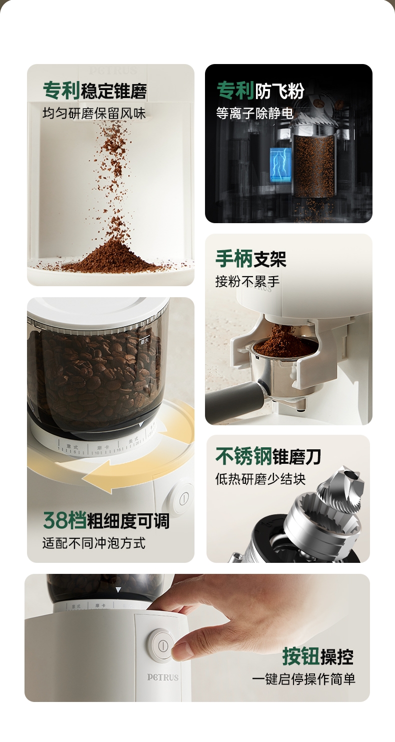 稳定不锈钢锥磨专利,研磨均匀细腻少结块;防飞粉专利,等离子消除出粉静电;38档粗细度可调,适配不同冲泡方式