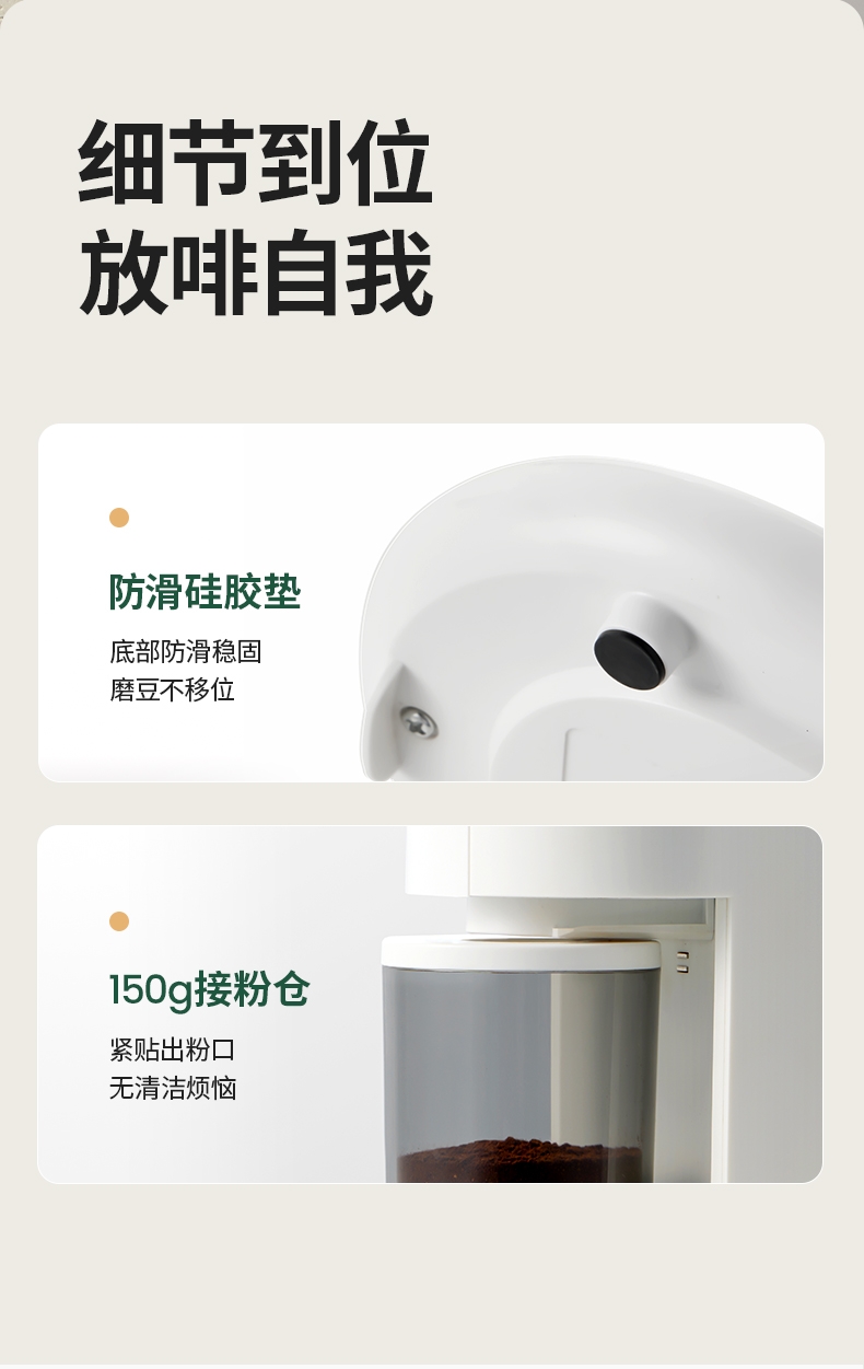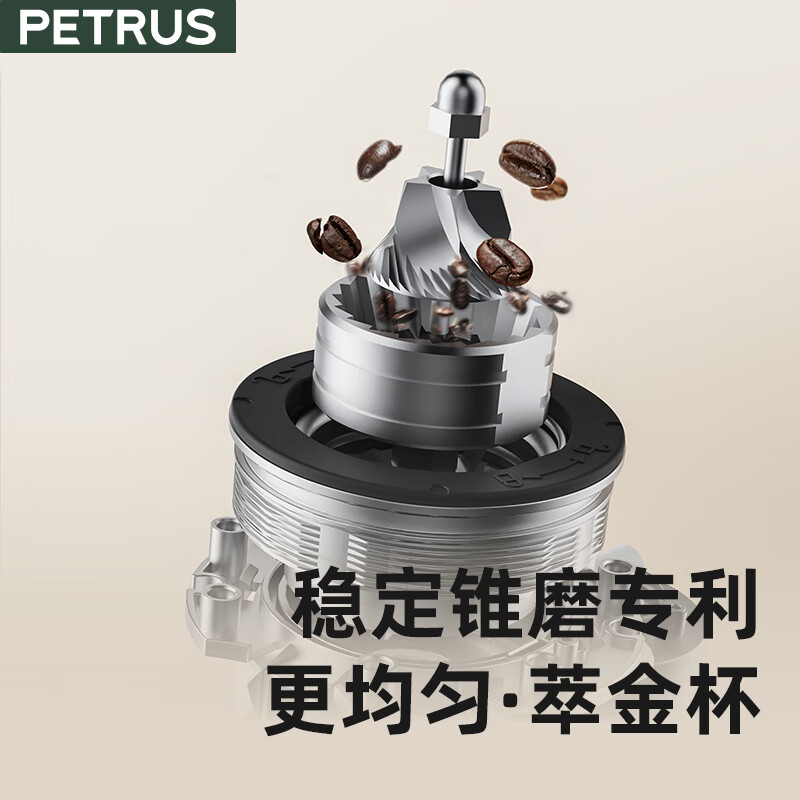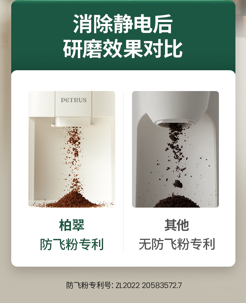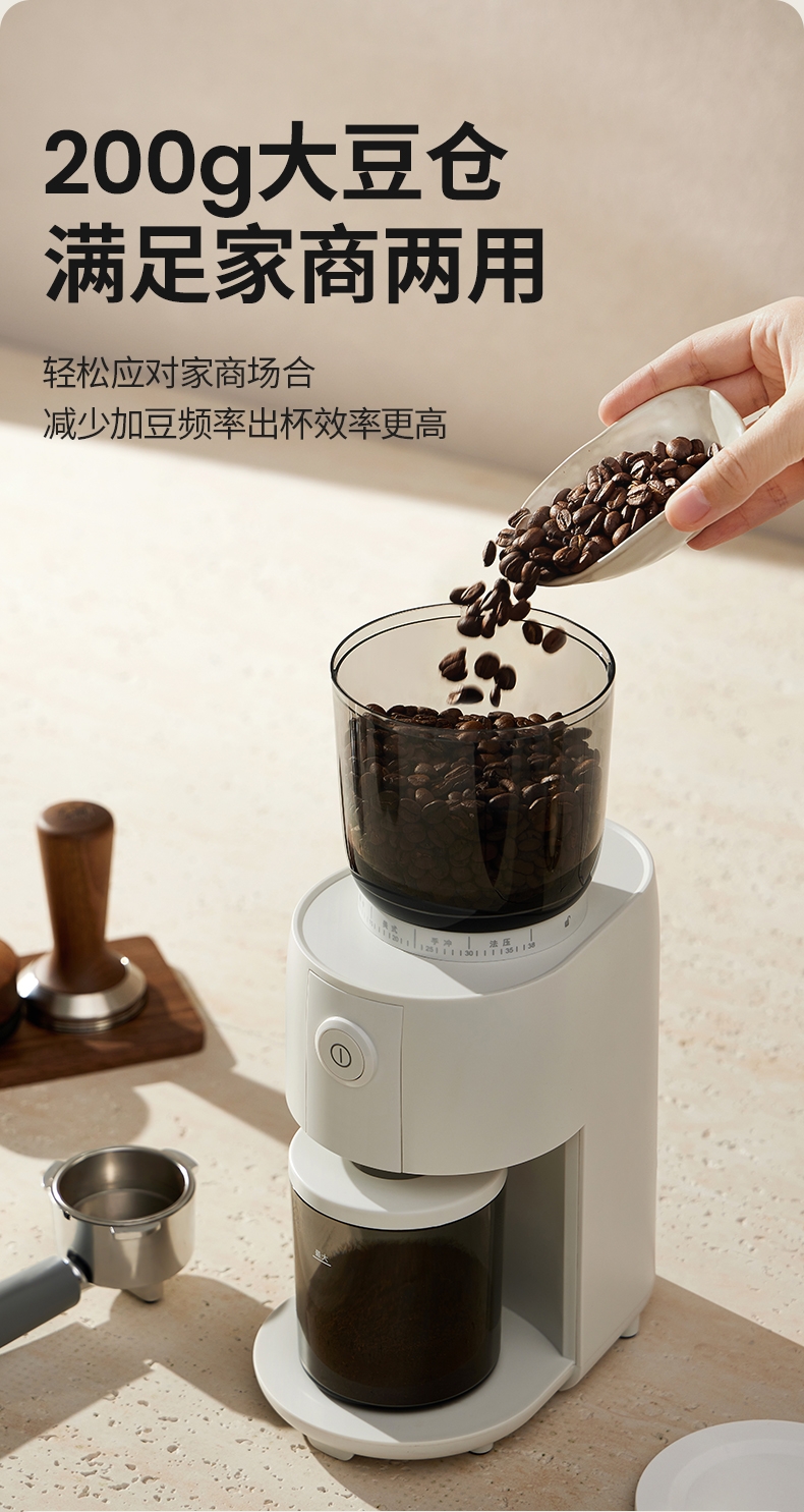 稳定不锈钢锥磨专利,研磨均匀细腻少结块;防飞粉专利,等离子消除出粉静电;38档粗细度可调,适配不同冲泡方式