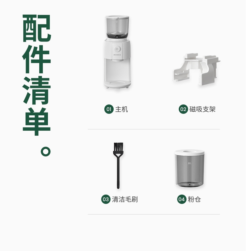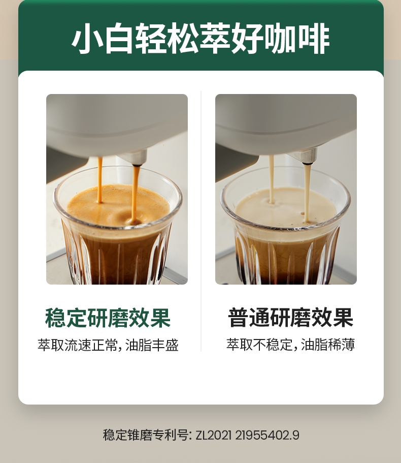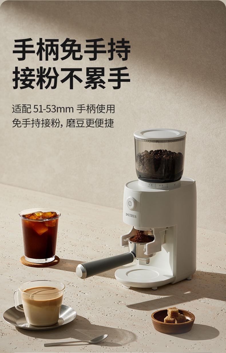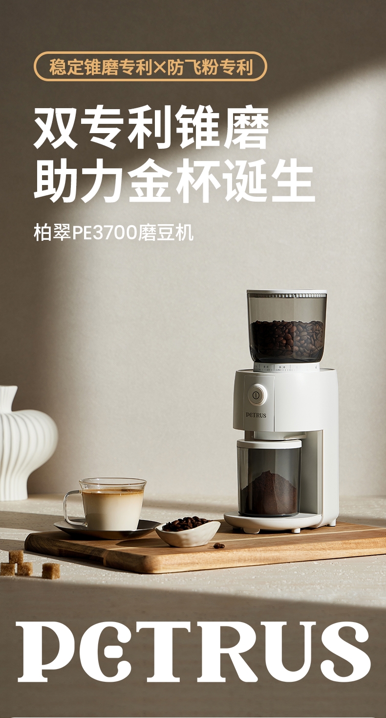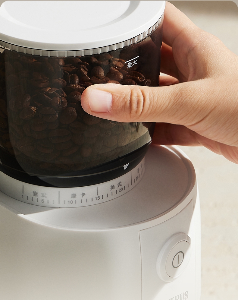 稳定不锈钢锥磨专利,研磨均匀细腻少结块;防飞粉专利,等离子消除出粉静电;38档粗细度可调,适配不同冲泡方式