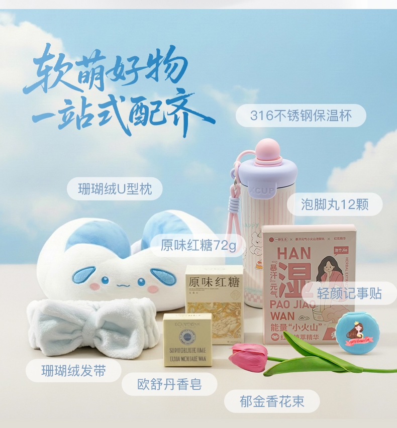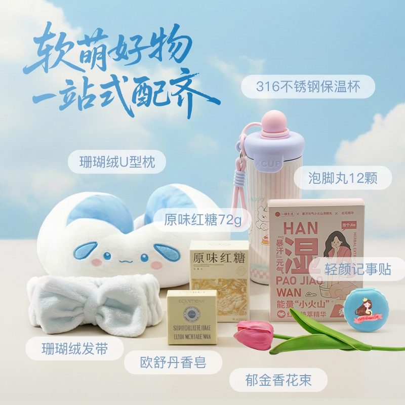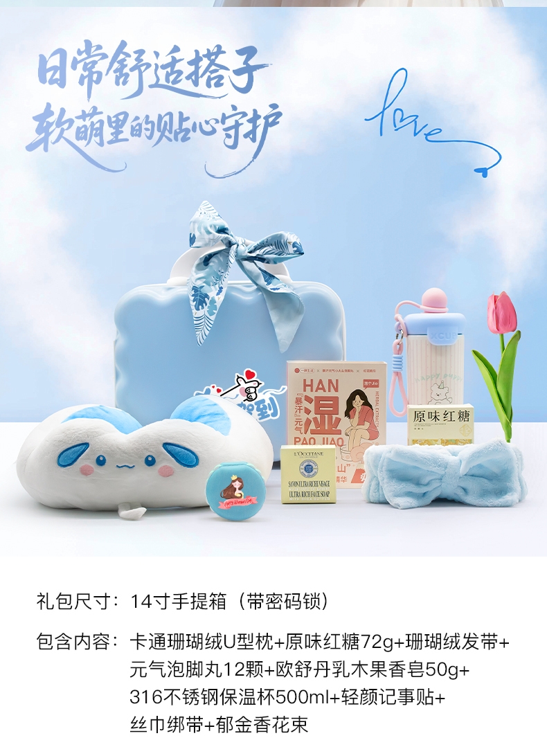 配置清单:卡通珊瑚绒U型枕+欧舒丹乳木果香皂50g+珊瑚绒发带+轻颜记事贴+316不锈钢保温杯500ml+原味红糖72g+元气泡脚丸12颗+郁金香花束+丝巾绑带(颜色随机)