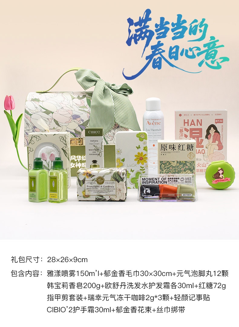 配置清单:雅漾喷雾150ml+瑞幸元气冻干咖啡2g*3颗+元气泡脚丸12颗+原味红糖72g+指甲剪套装+轻颜记事贴+郁金香毛巾30*30cm+欧舒丹洗发水护发素各30ml+CIBIO2护手霜35ml+韩宝莉香皂200g+郁金香花束+丝巾绑带(颜色随机)