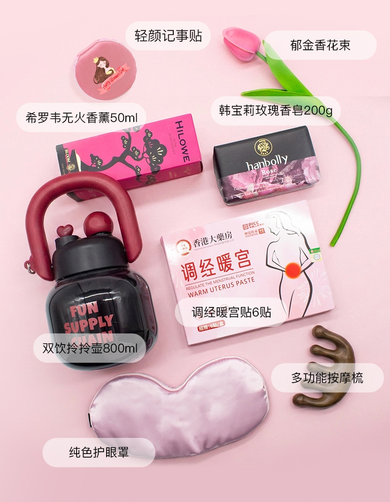 配置清单:双饮拎拎壶水杯800ml+藤枝无香薰50ml+多功能按摩梳+轻颜记事贴+调经暖宫贴6贴+韩宝莉玫瑰香皂200g+纯色眼罩+郁金香花束