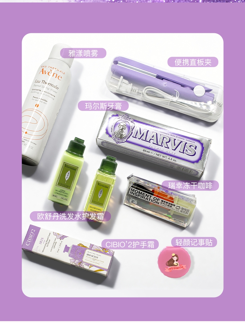 配置清单:雅漾喷雾150ml+欧舒丹洗发水护发素各30ml+迷你便携直发小夹板+CIBIO2护手霜35ml+瑞幸元气冻干咖啡2g*3颗+玛尔斯牙膏85ml+轻颜记事贴