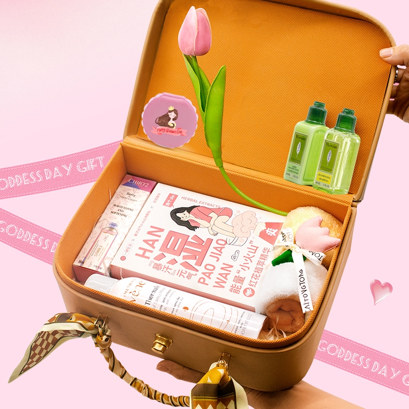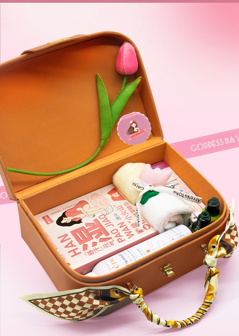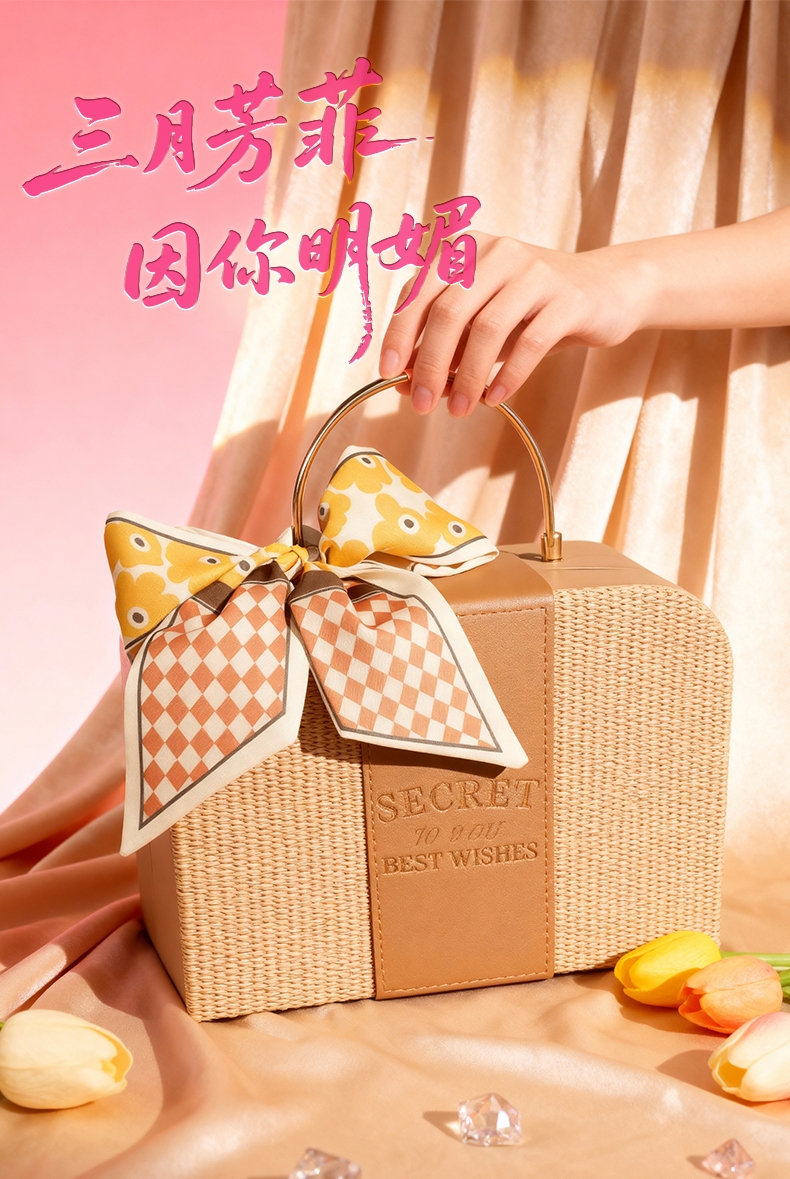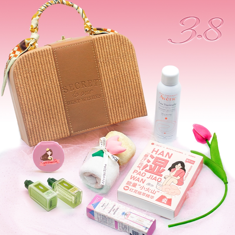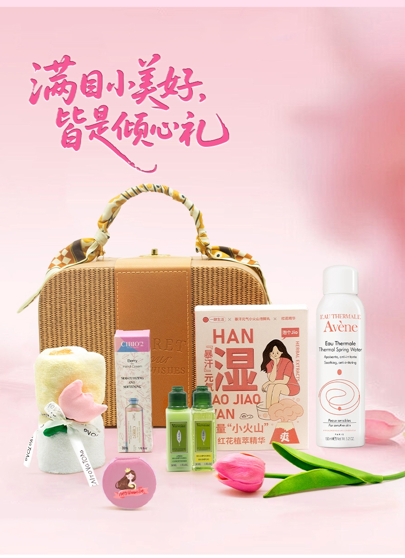 暖棕藤编礼盒,复古质感,春日氛围感拉满;欧舒丹洗护 + 雅漾喷雾,实用护肤配齐;丝巾点缀设计,送礼自留尽显温柔气质