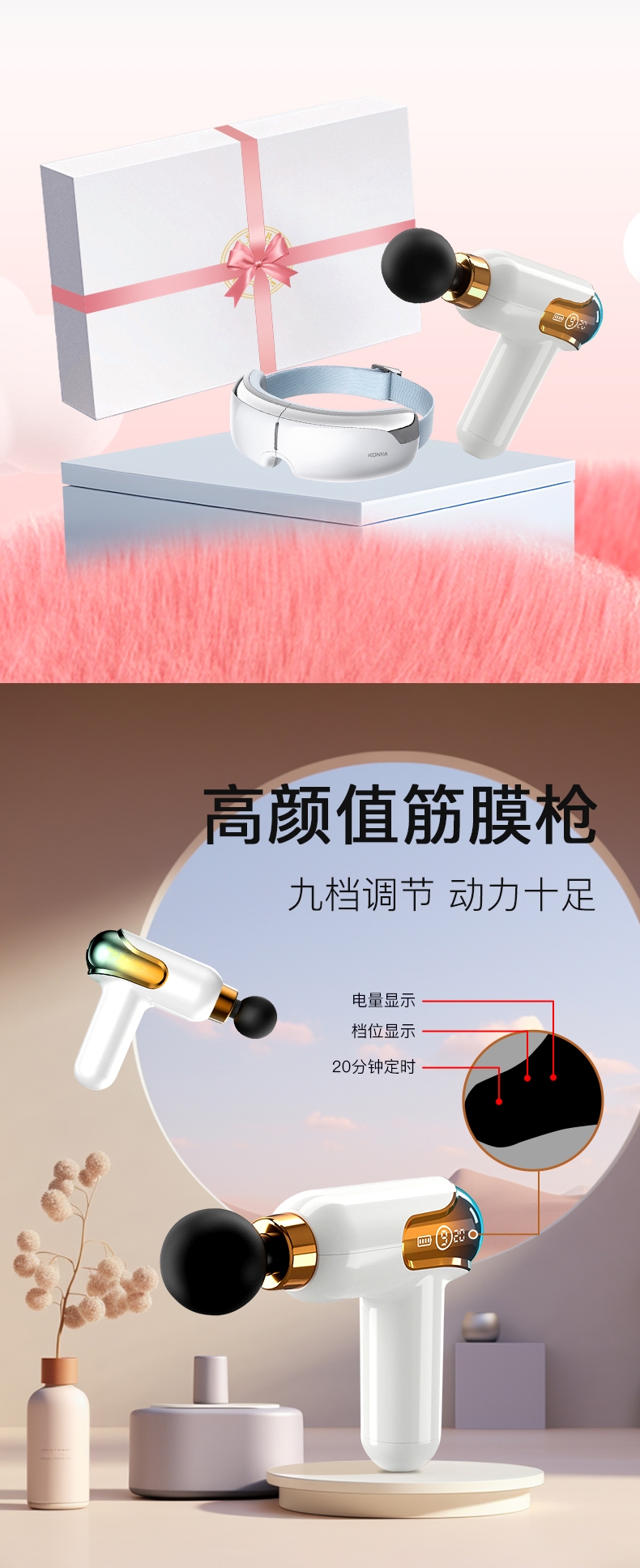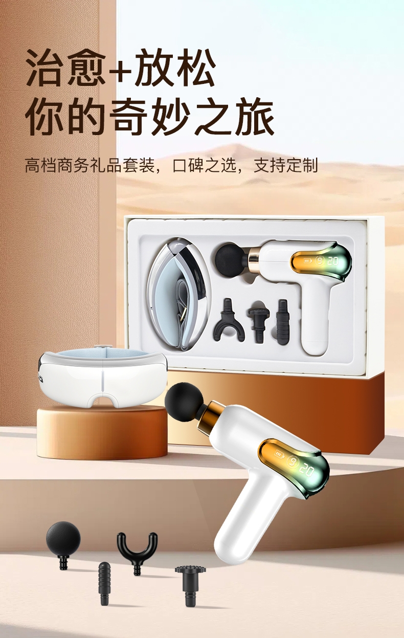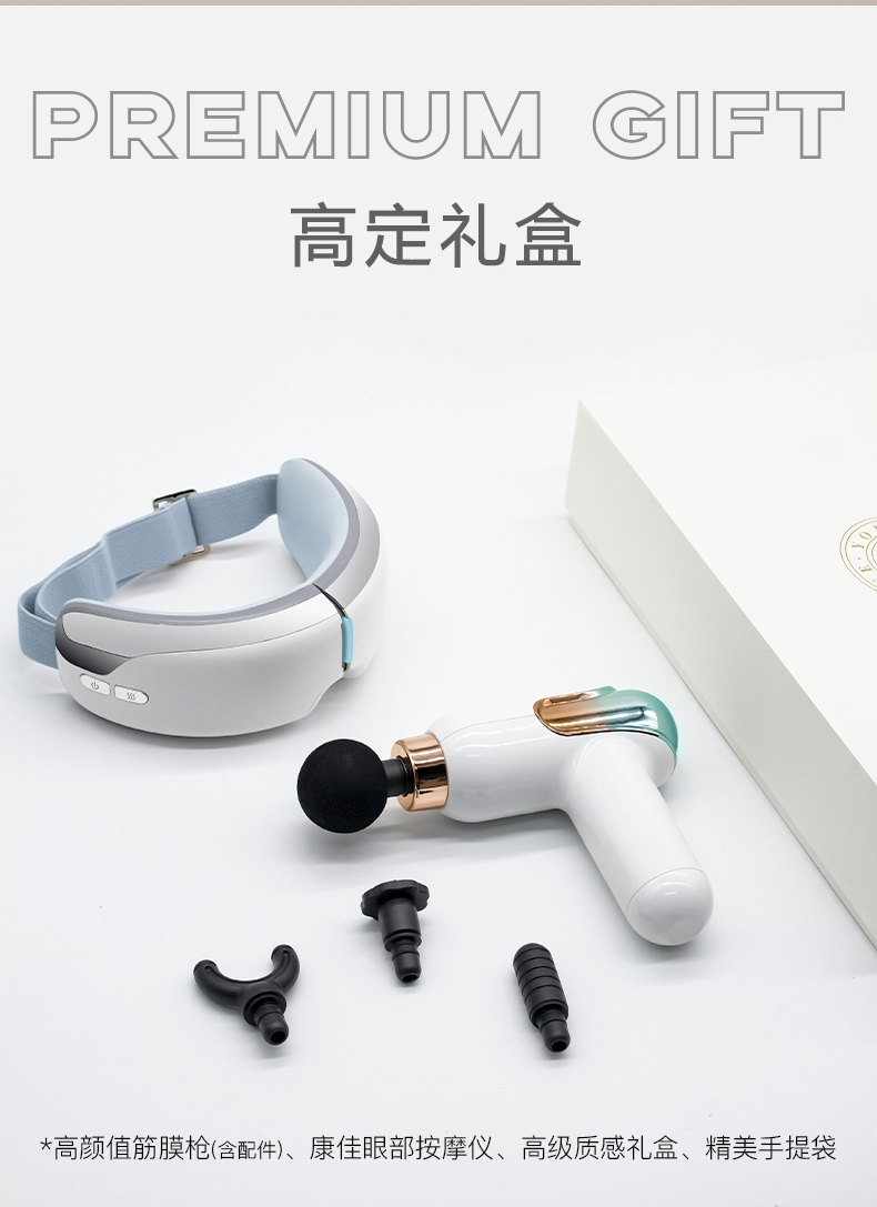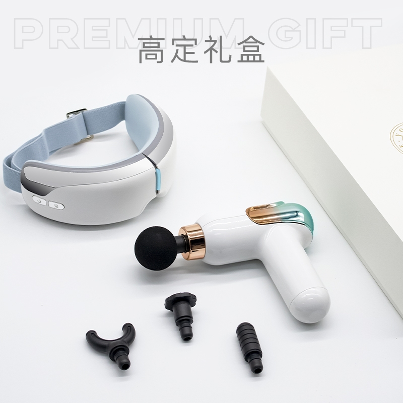 筋膜枪 + 眼部按摩仪,双重舒压,焕能必备;轻奢礼盒设计,送礼自用尽显贴心;智能按摩组合,随时随地放松身心
