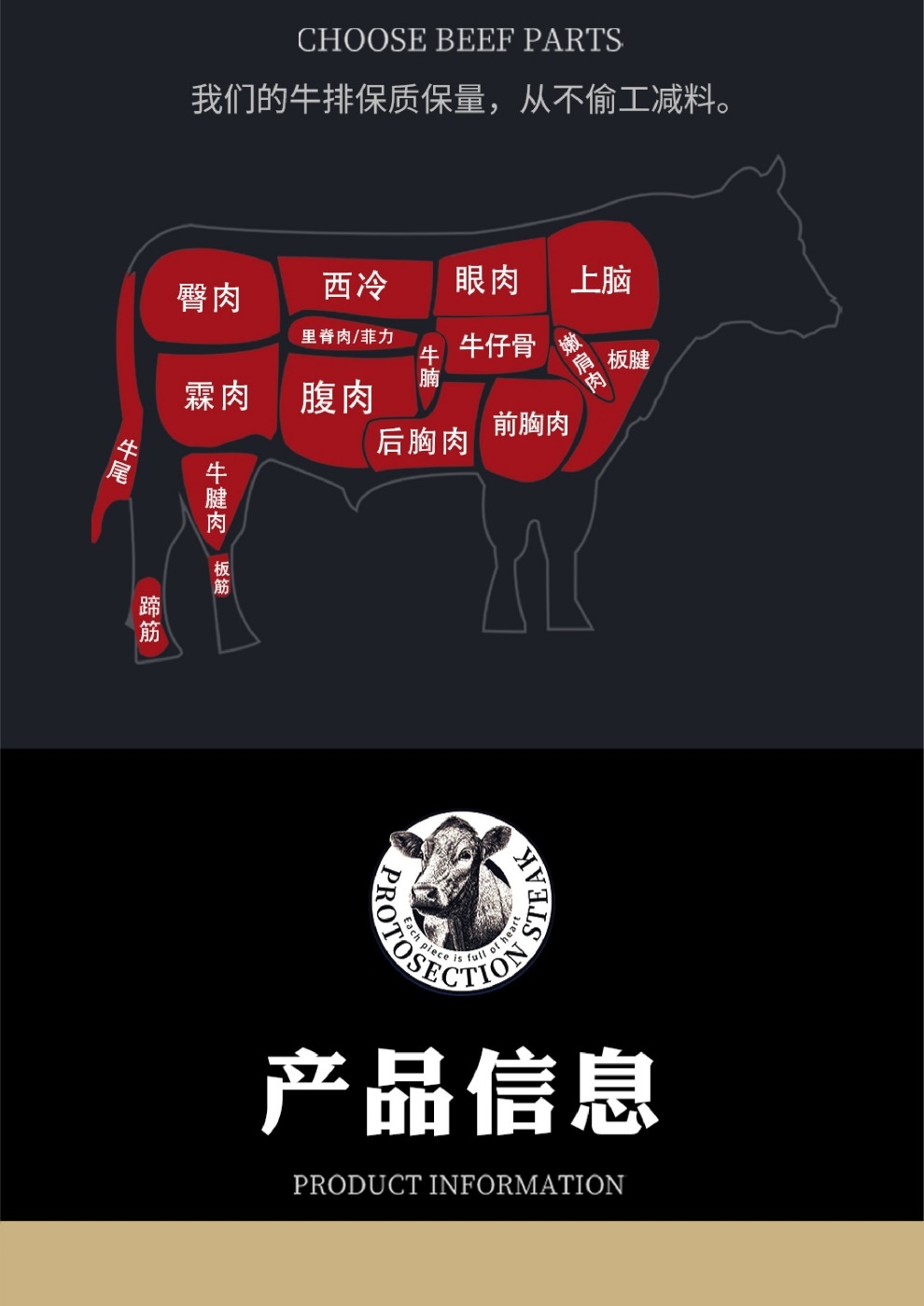 生态原产地直发 放心好牛肉;天然散养 坚持100%散养原则;肉质鲜嫩 口感鲜美 嚼劲十足