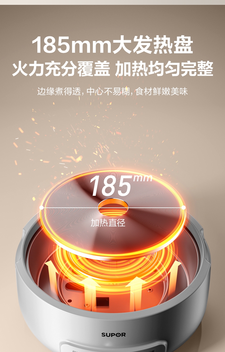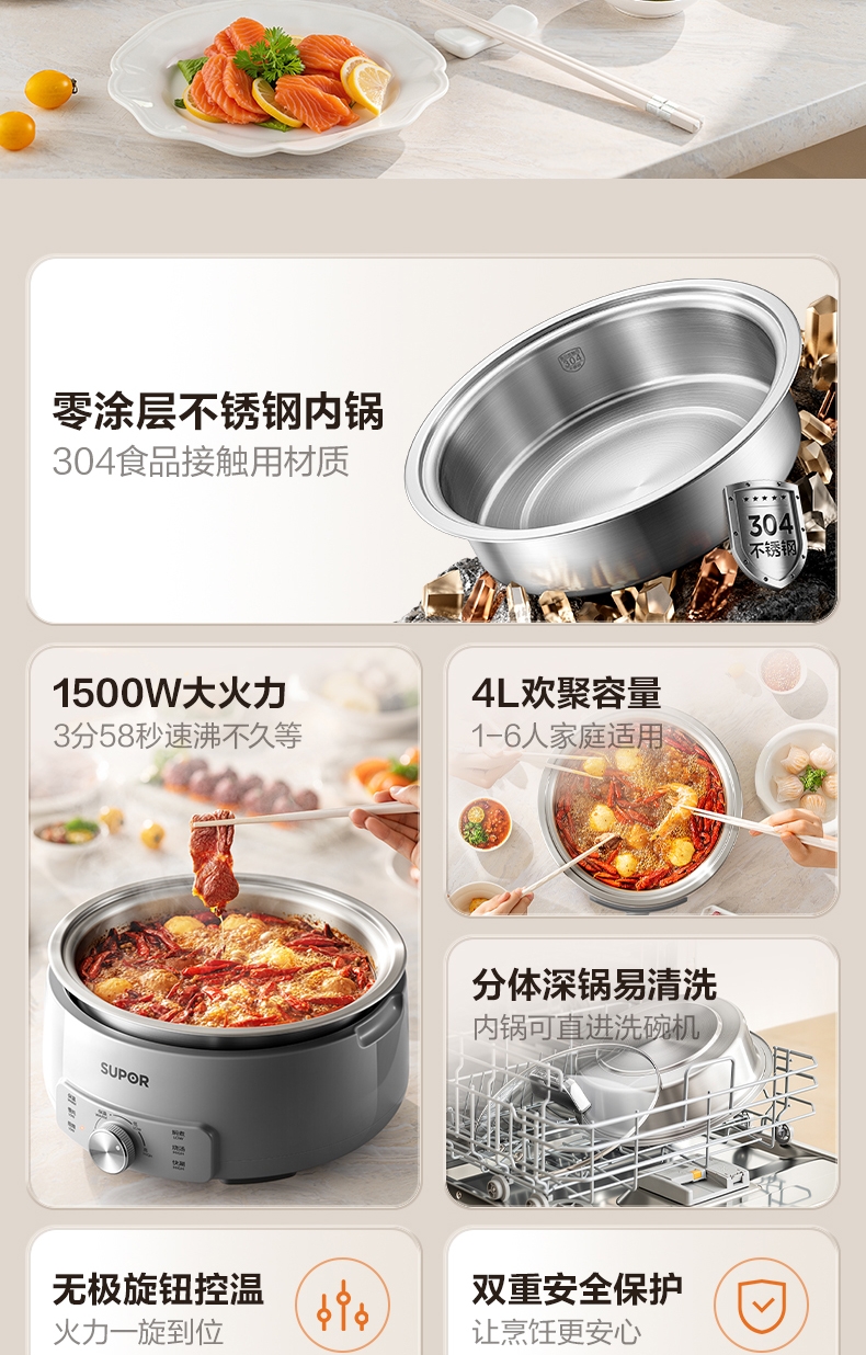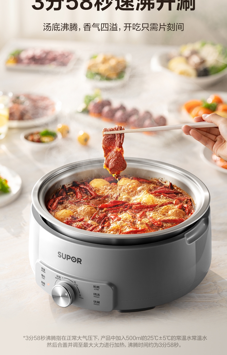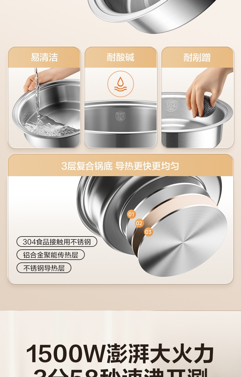 0层不锈钢内锅 健康本味 安心开涮;1500W 大火力 3 分 58 秒速沸不久等;185mm 大发热盘 火力充分覆盖 加热均匀