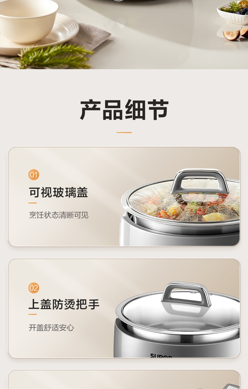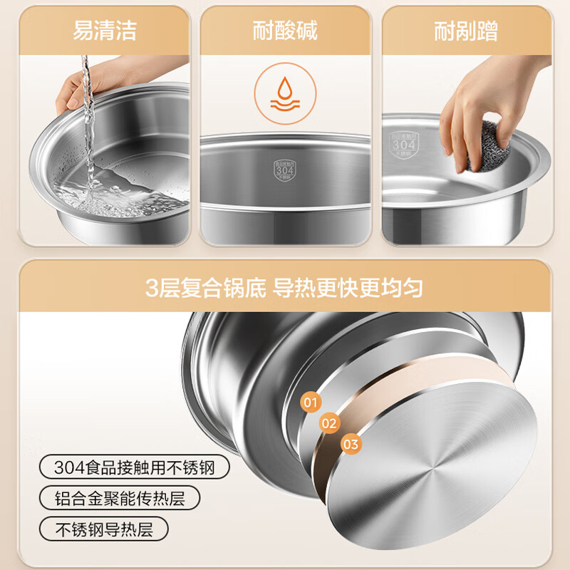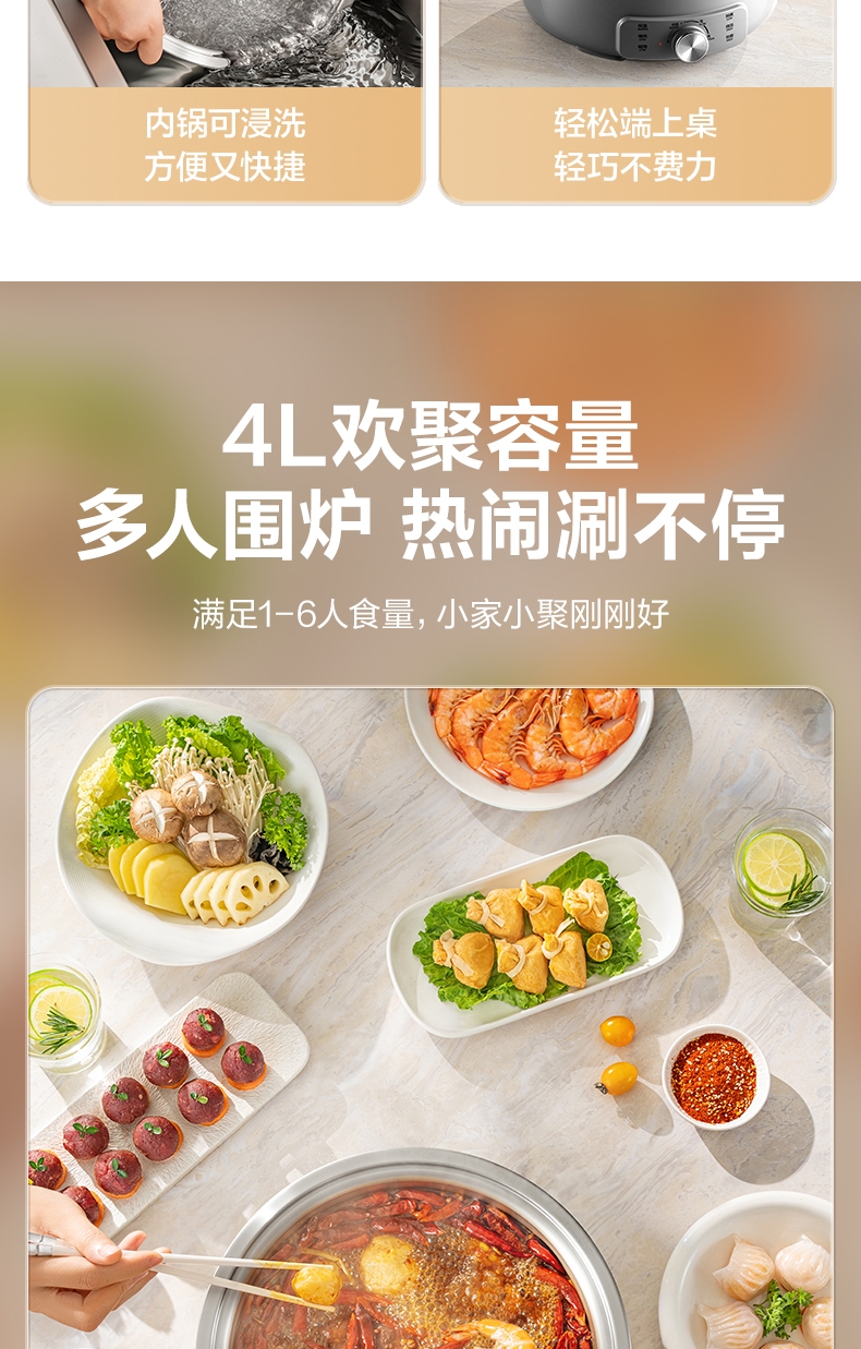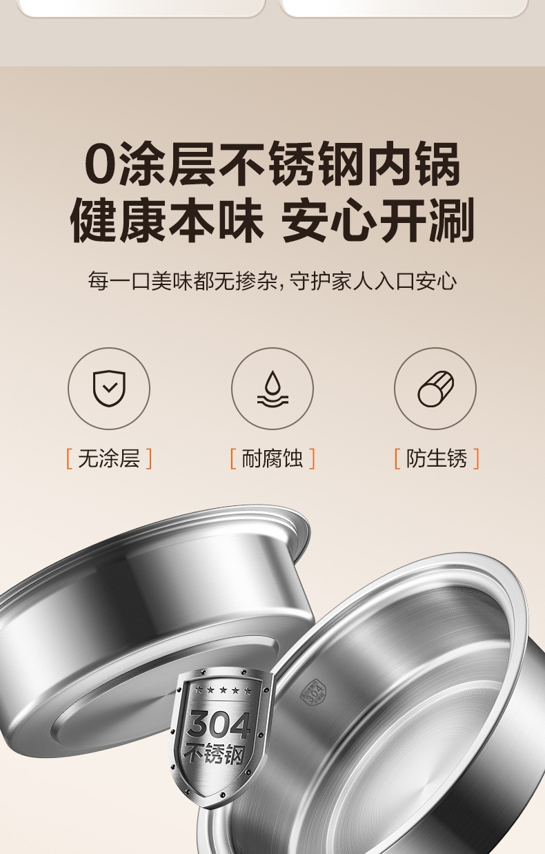 0层不锈钢内锅 健康本味 安心开涮;1500W 大火力 3 分 58 秒速沸不久等;185mm 大发热盘 火力充分覆盖 加热均匀