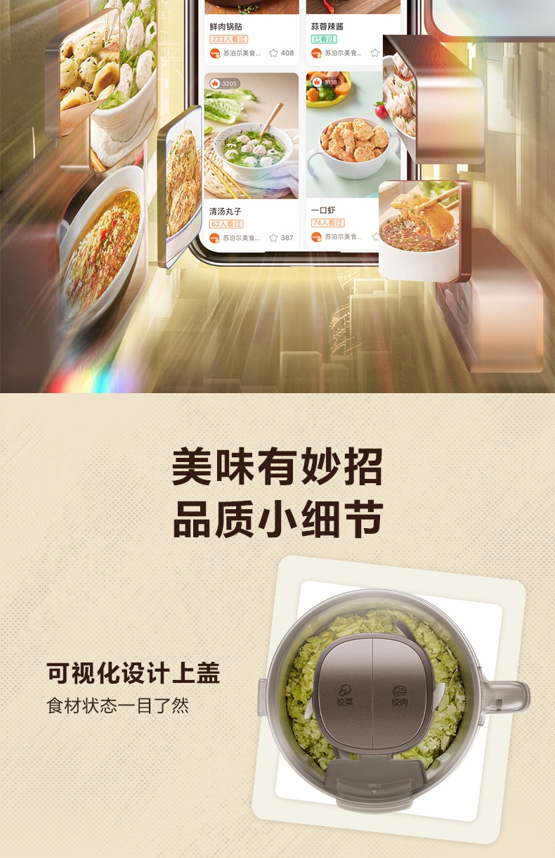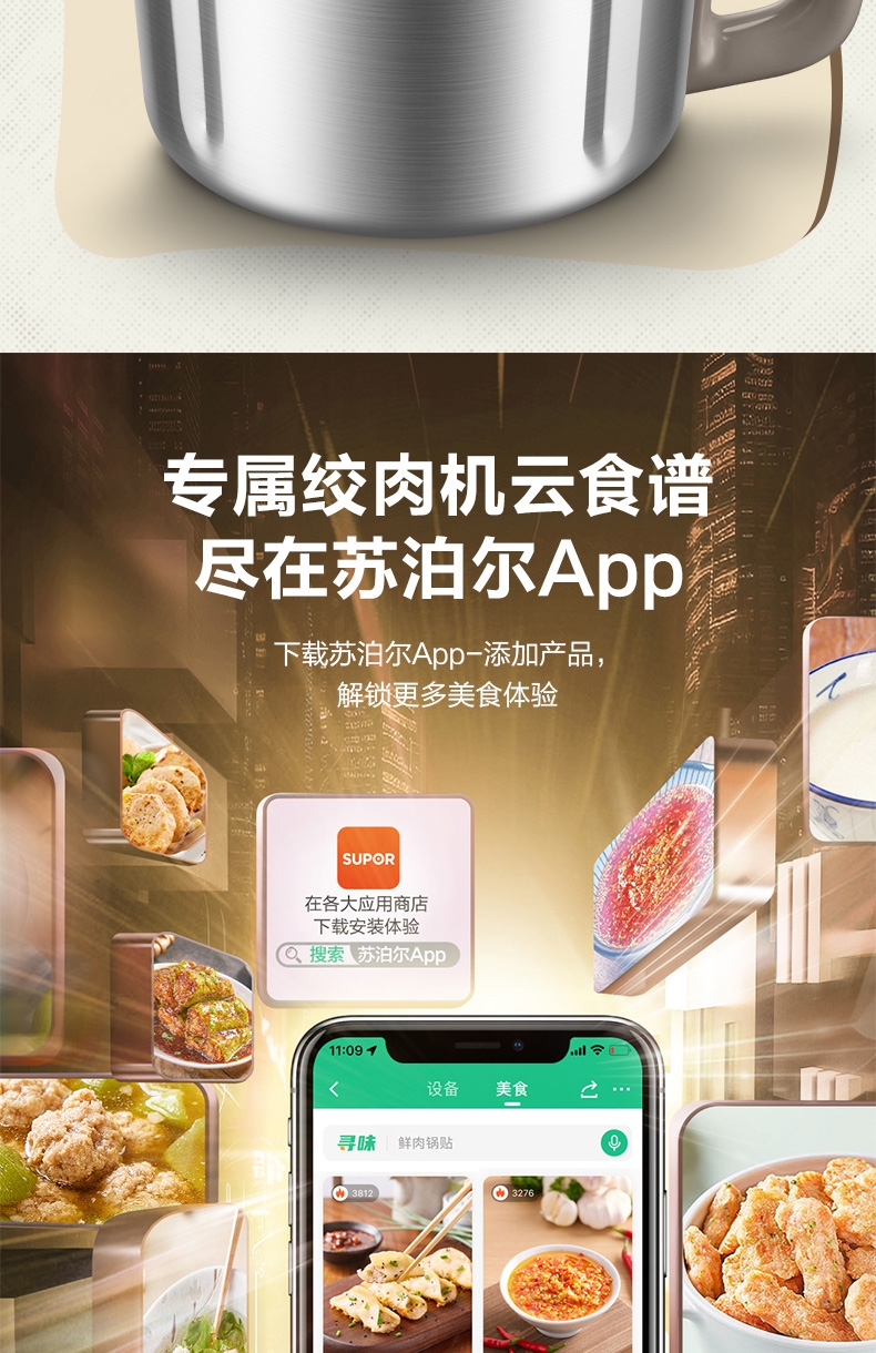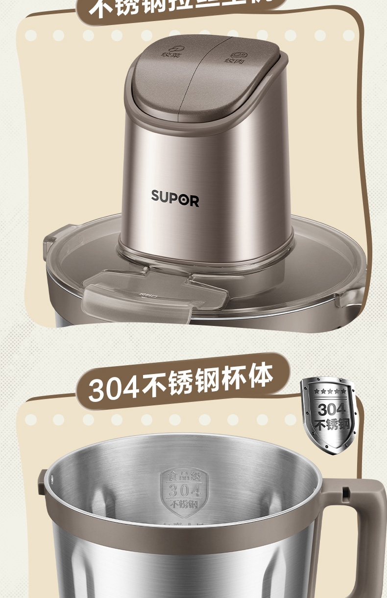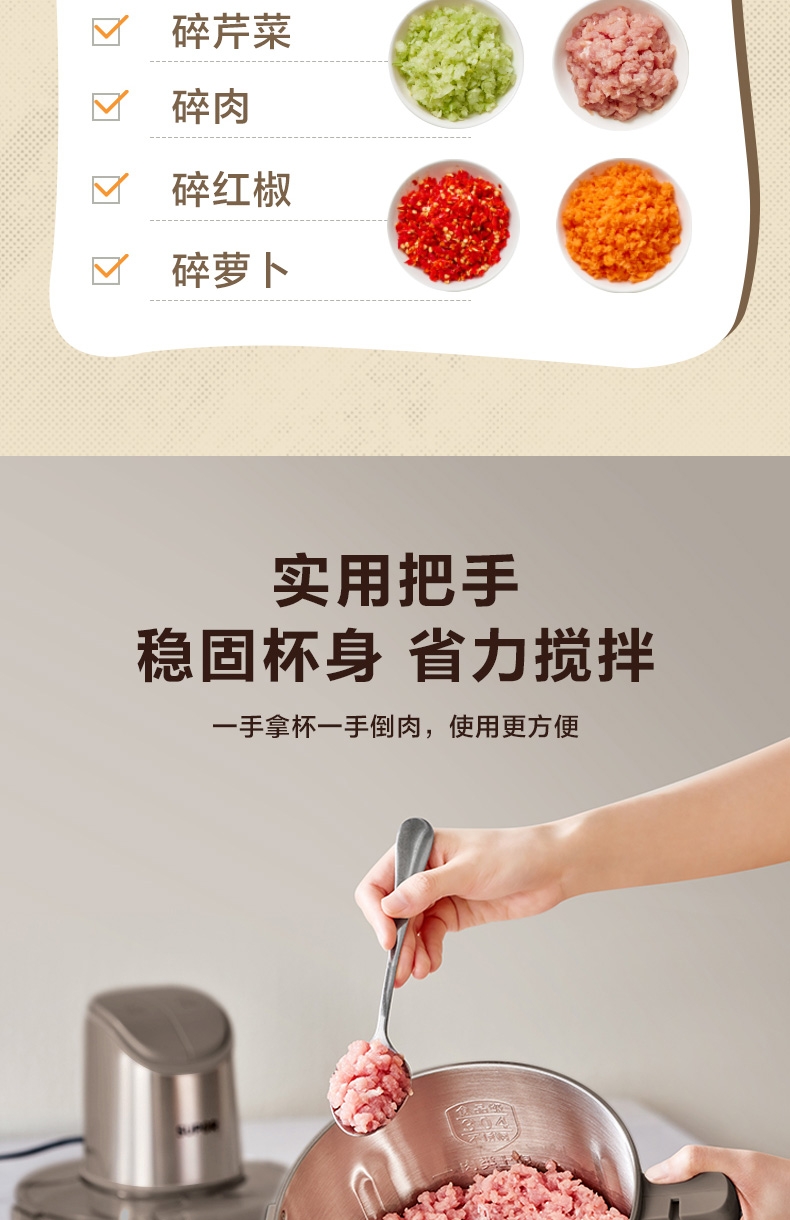 4L超大容量 ;全钢机身,304不锈钢大碗;双档调控,增设调料口