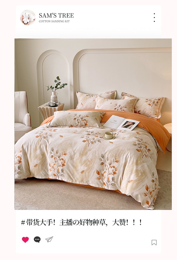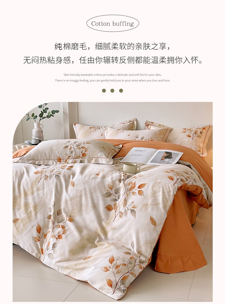 甄选纯棉磨毛面料手感细腻,柔软舒适,活性印染不易褪;磨毛工艺处理,使套件表面多一层短绒毛,不仅透气吸湿;健康印染,无荧光增白剂,无致癌芳香胺,睡眠更加安心