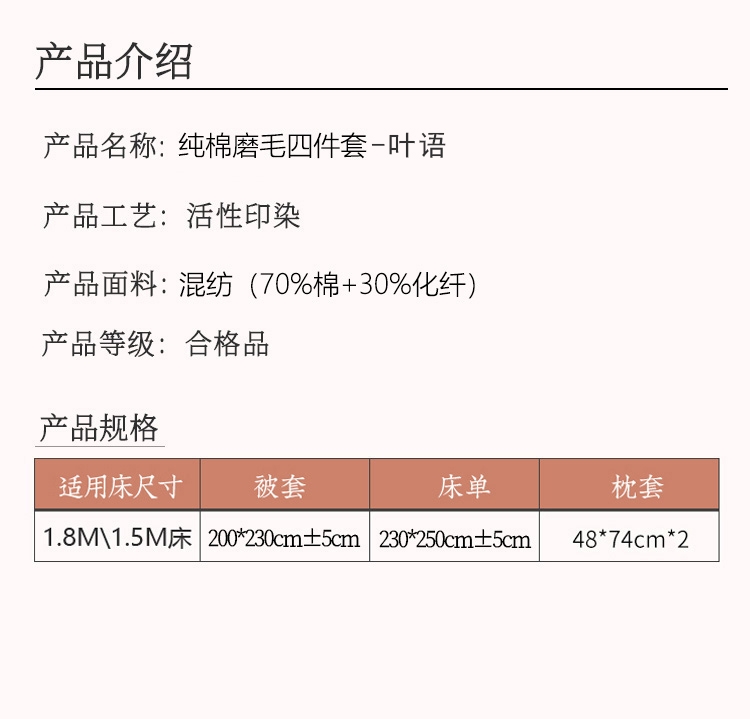 配置清单:规格: 床单:230*250cm±5cm 被罩:200*230cm 枕套:48*74cmx2 面料:混纺(70%棉+30%化纤)