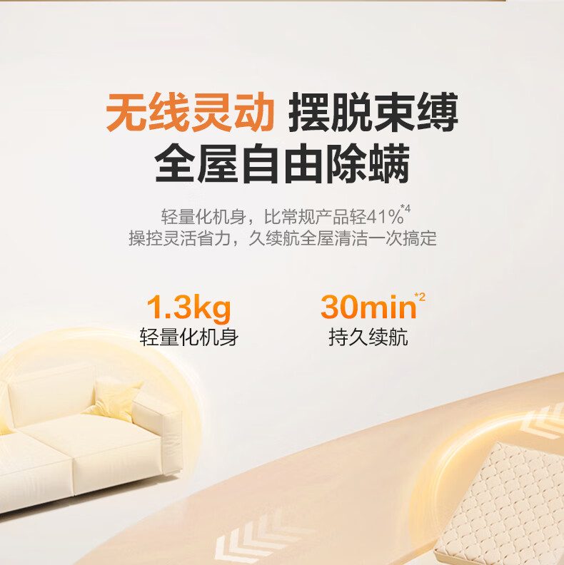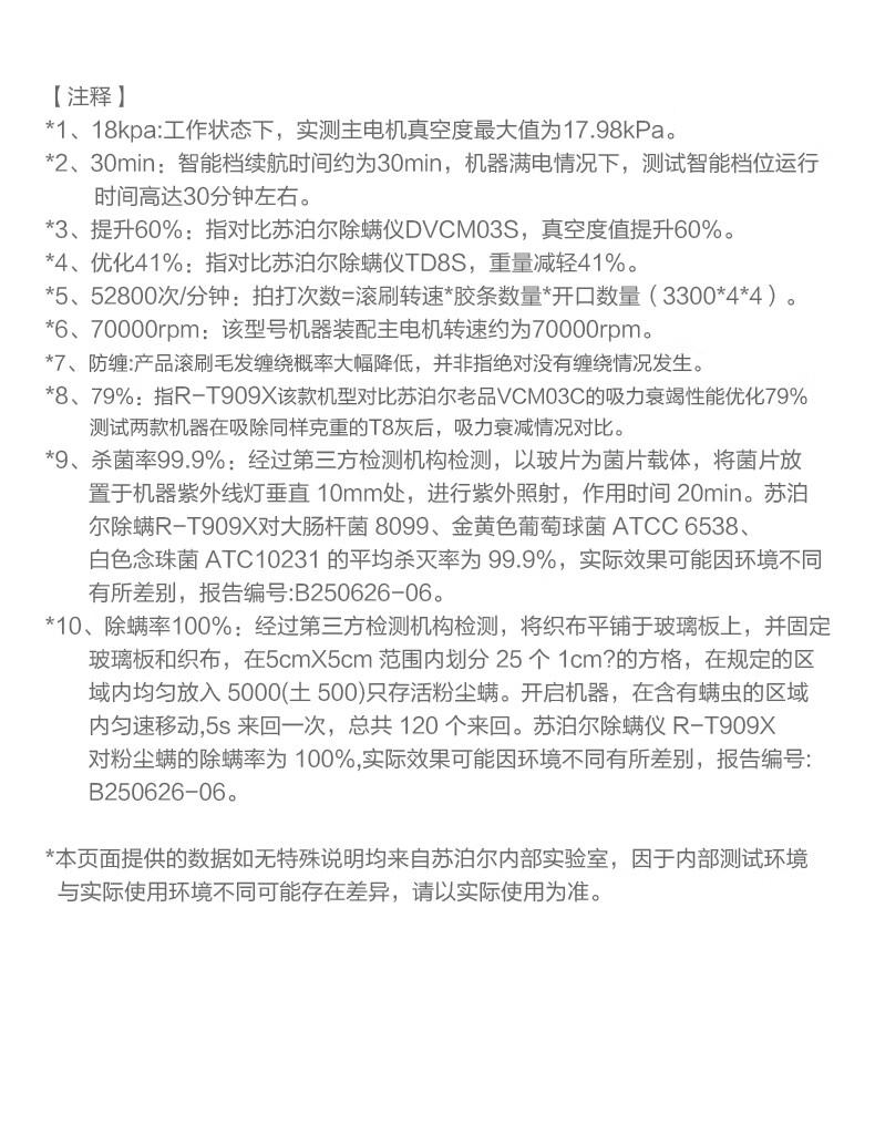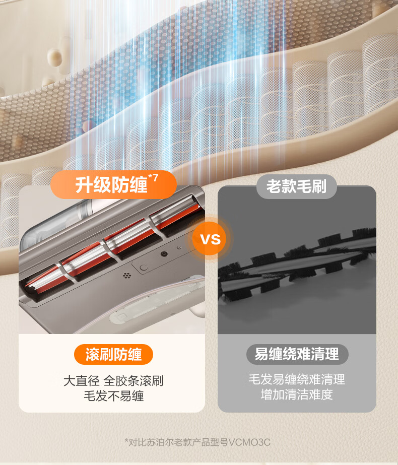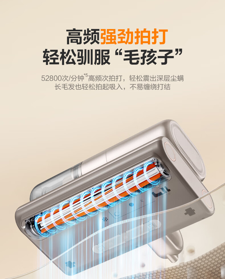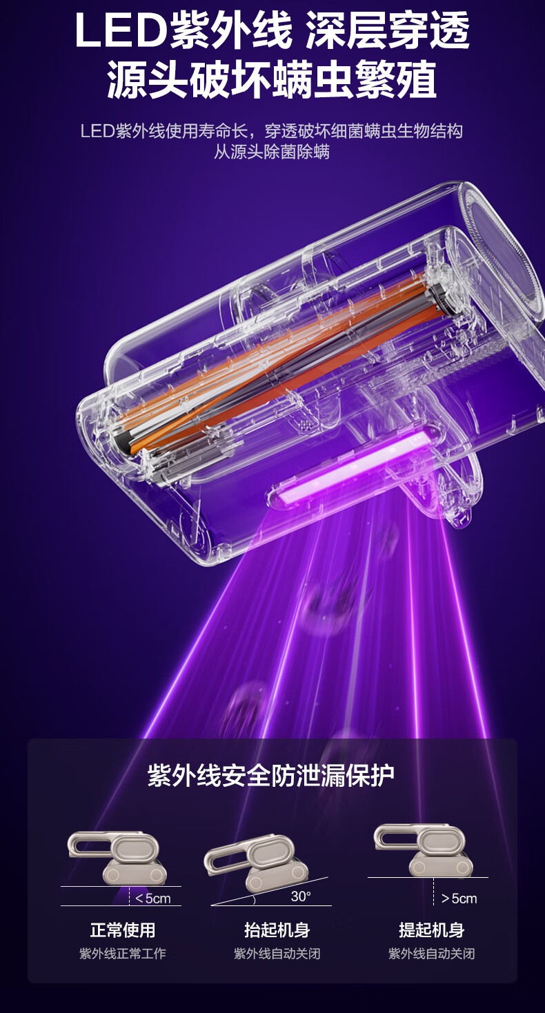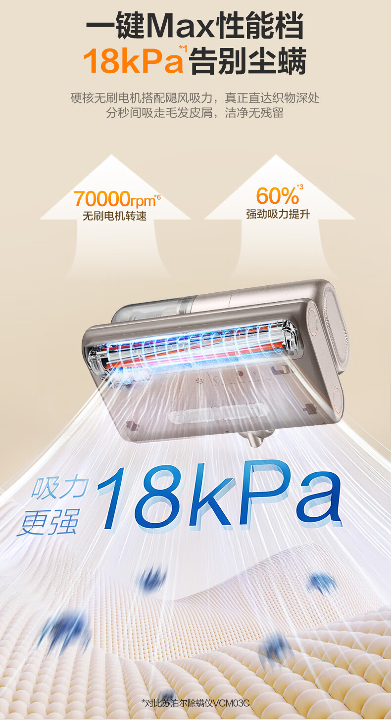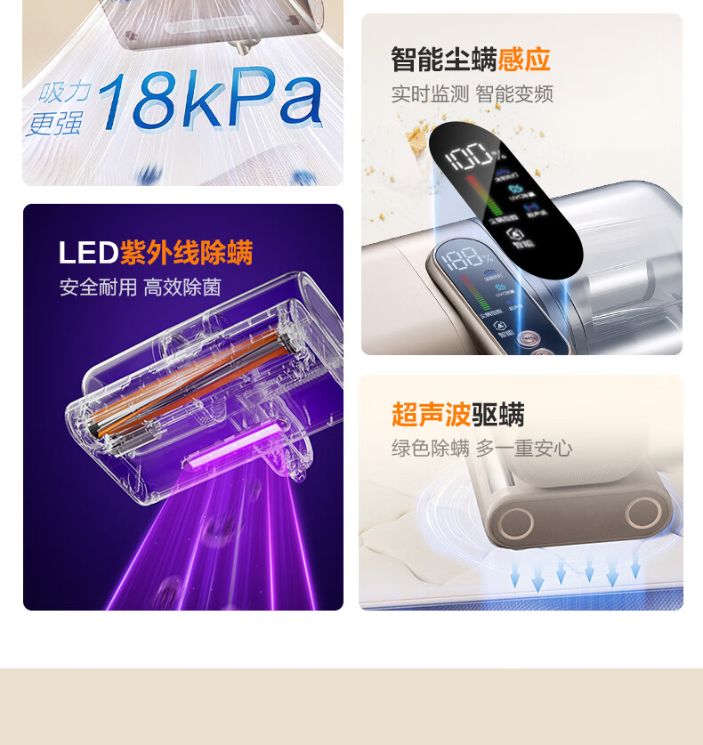 18kPa ,最大吸力;全新防缠全胶滚刷;尘螨感应,紫外线杀菌超声波抑螨
