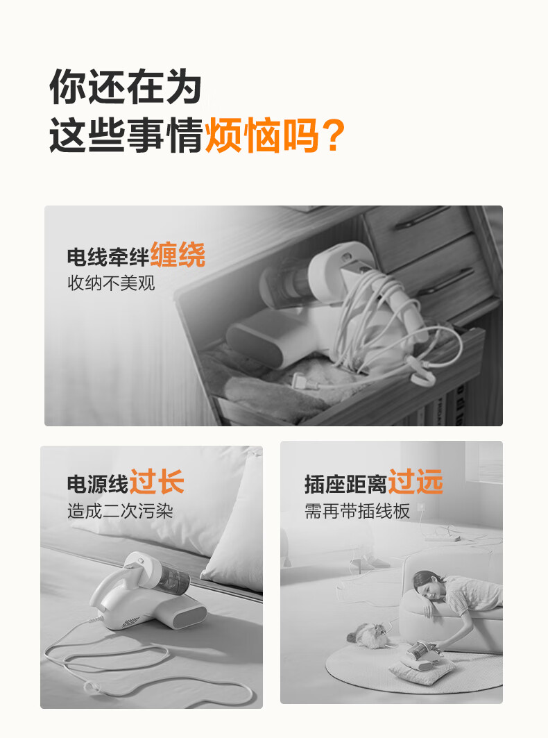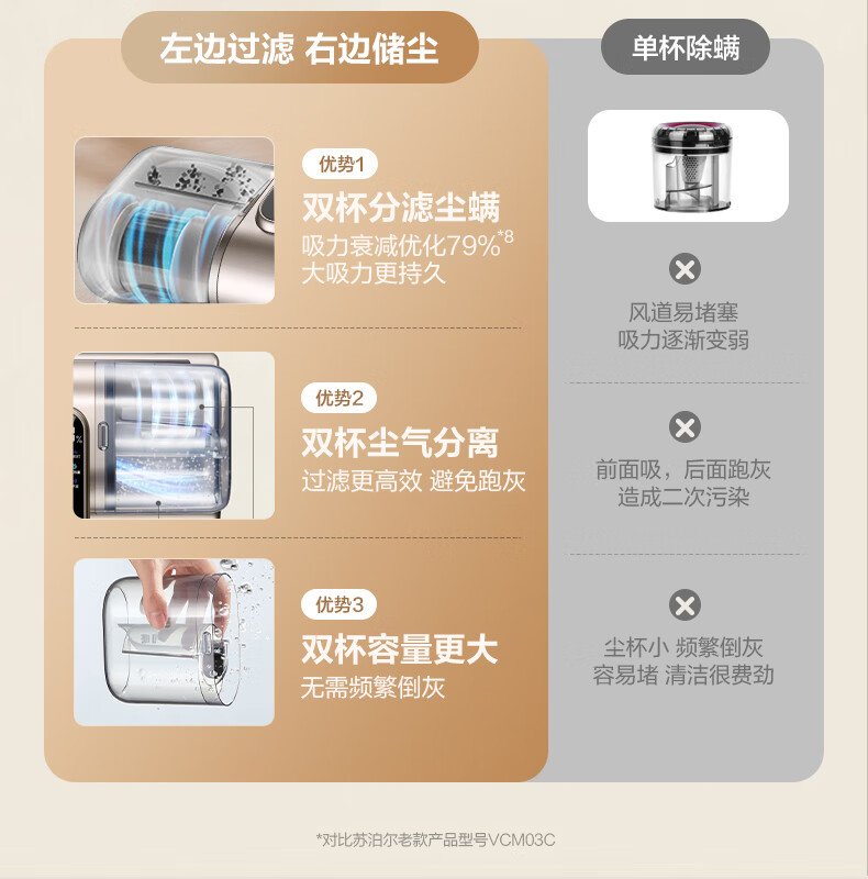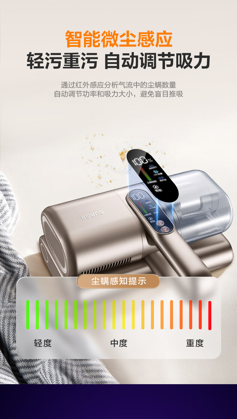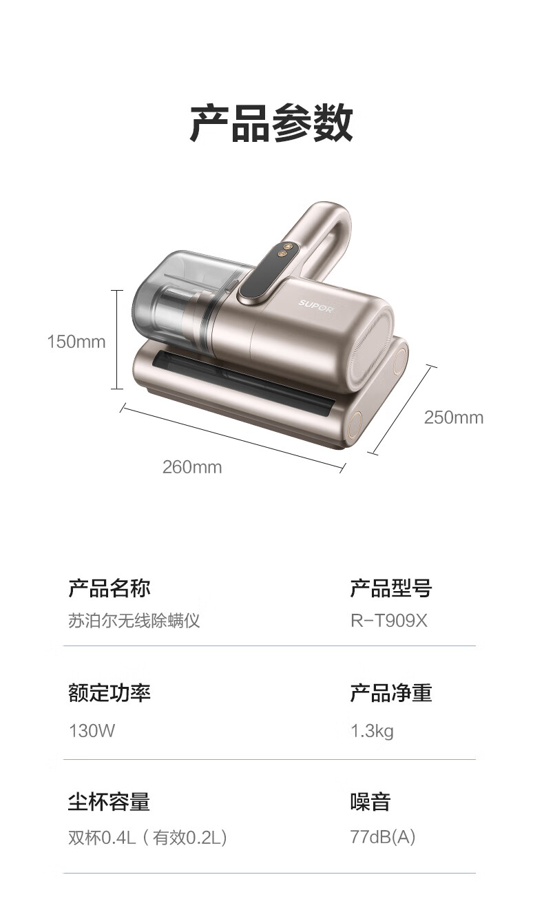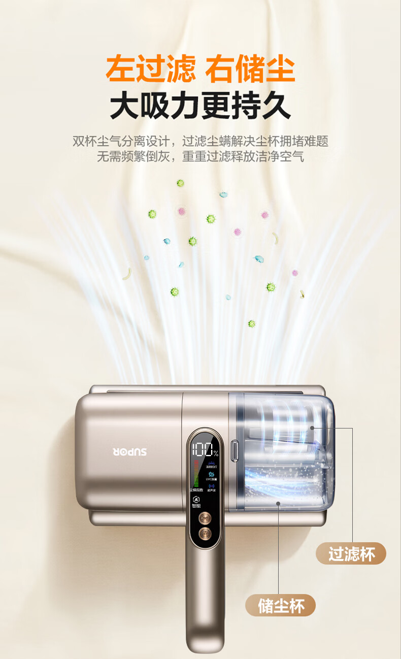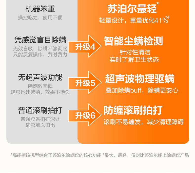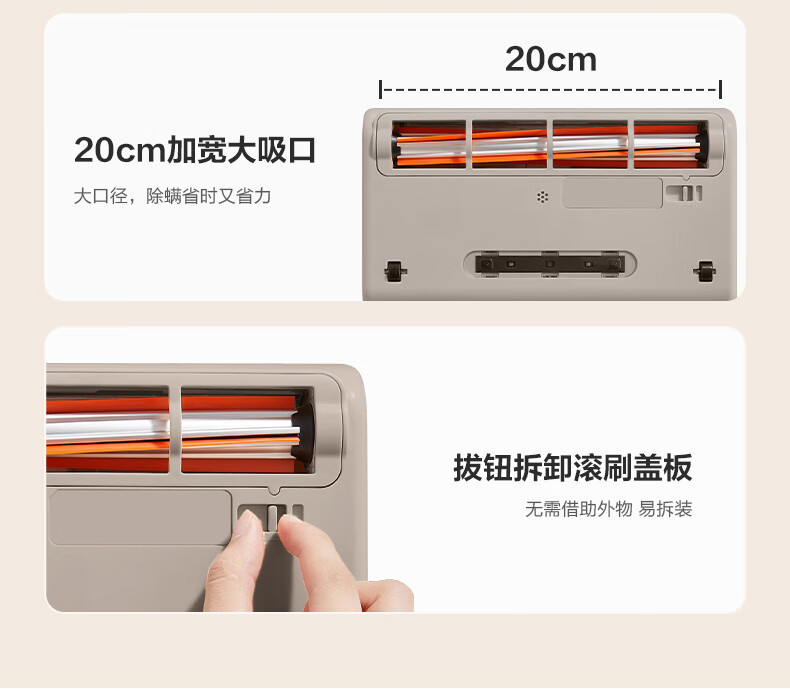 18kPa ,最大吸力;全新防缠全胶滚刷;尘螨感应,紫外线杀菌超声波抑螨