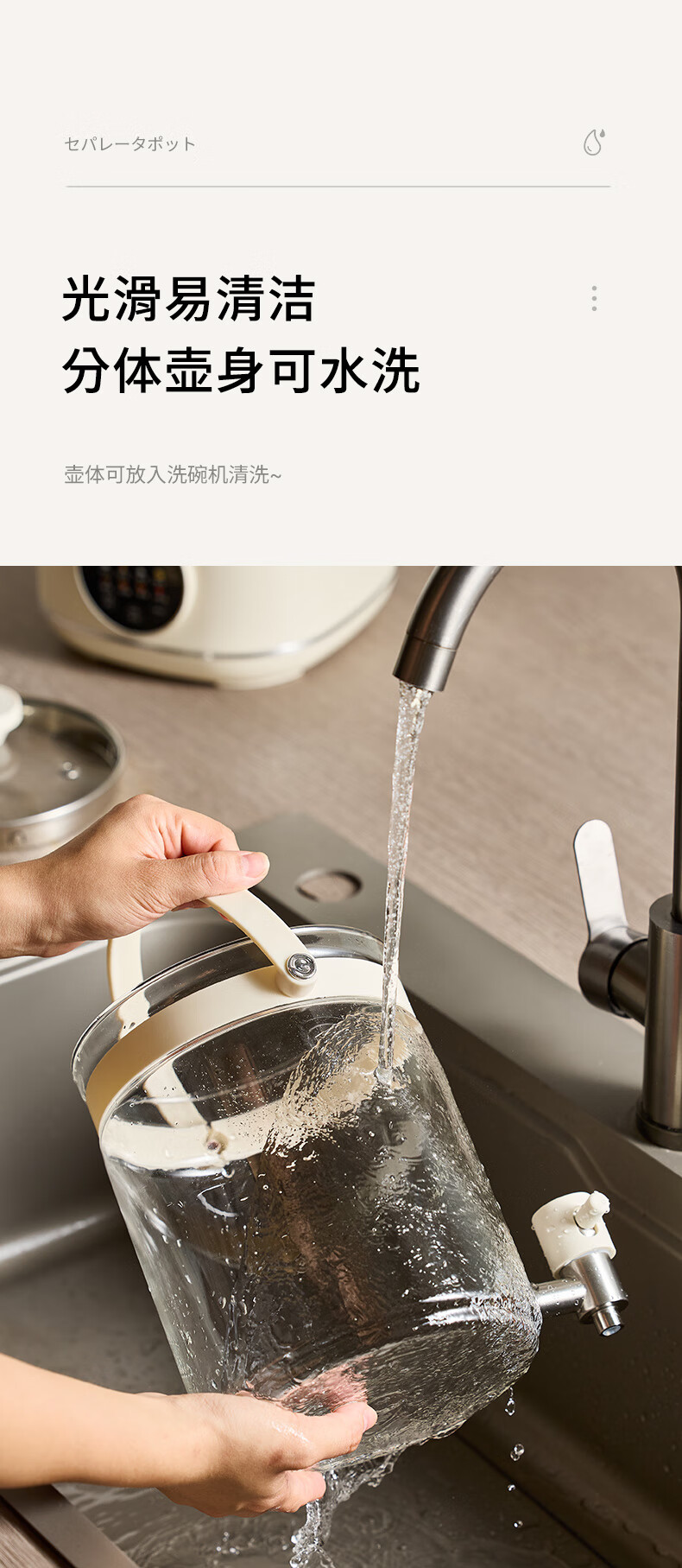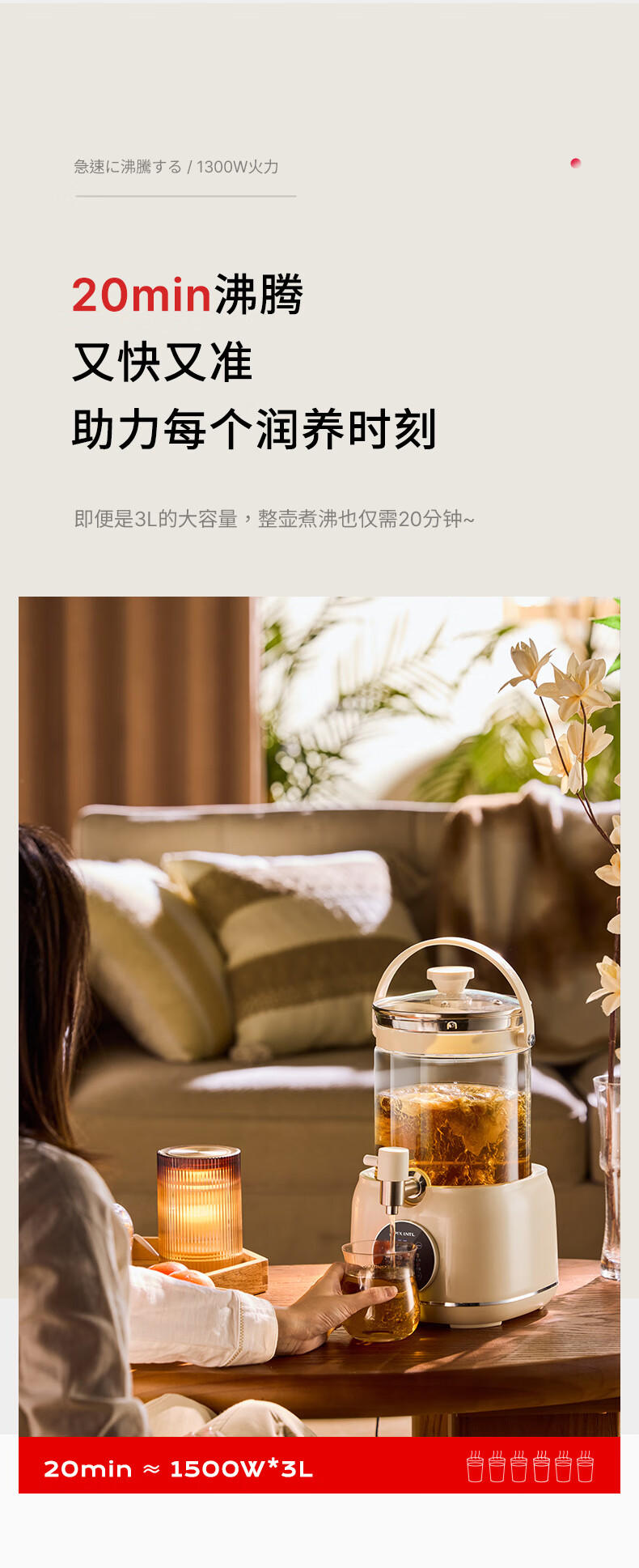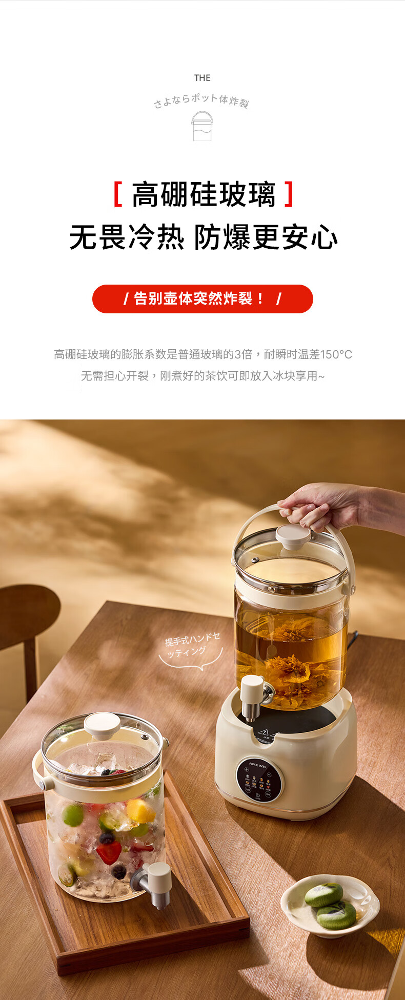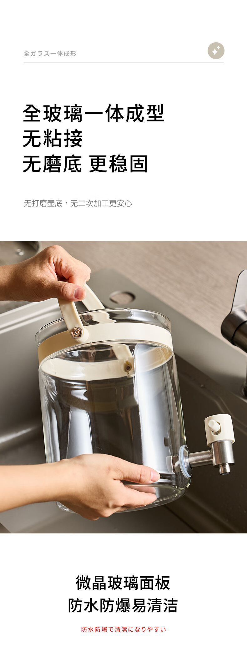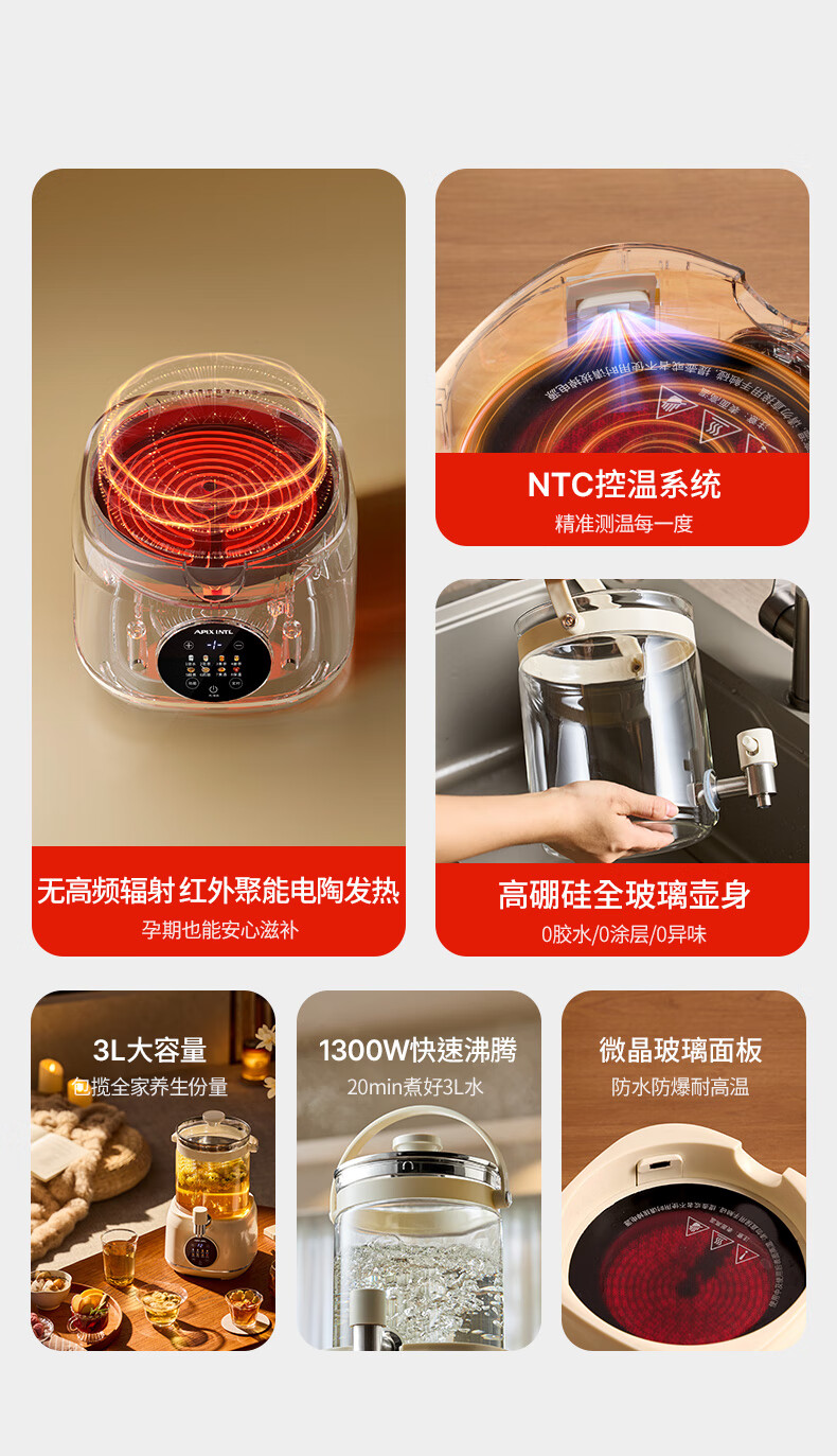 3L大容量,水龙头设计,轻松接水;微晶玻璃面板,防水防爆耐高温易清洗,1300W功率;加厚全高硼硅玻璃机身,0硅胶0涂层