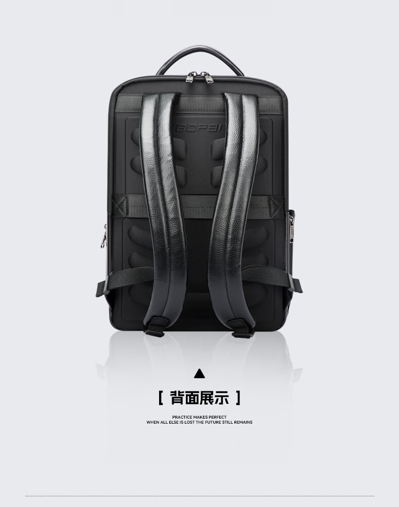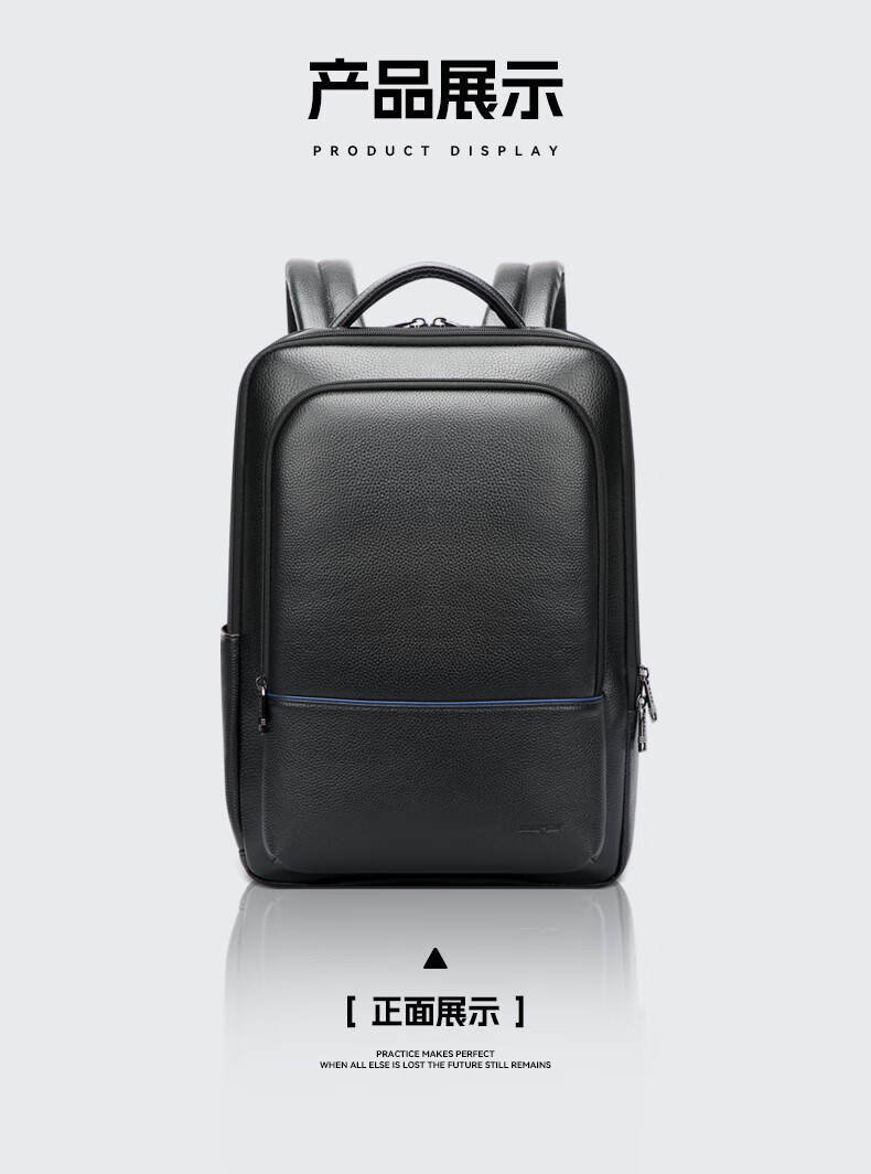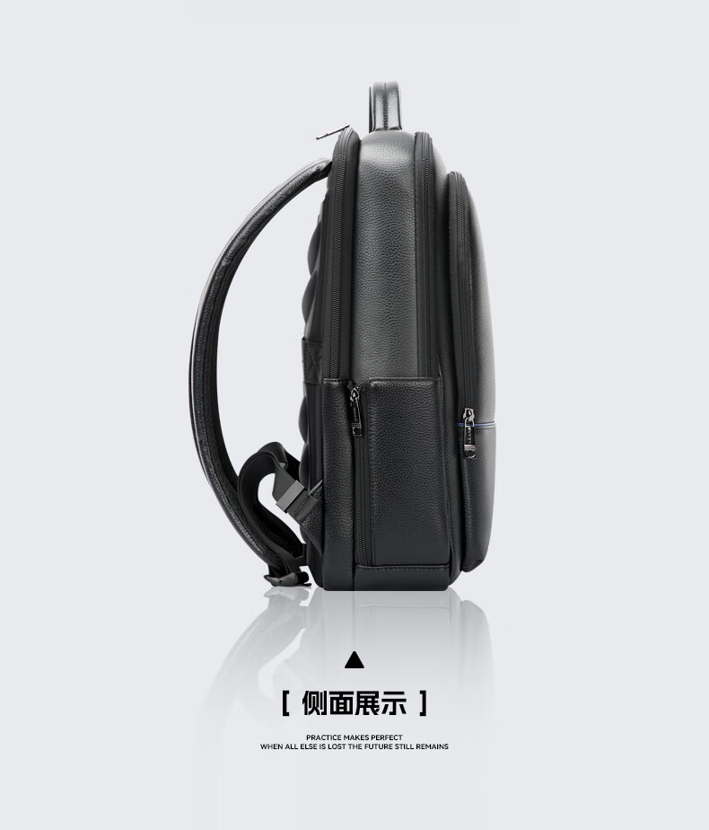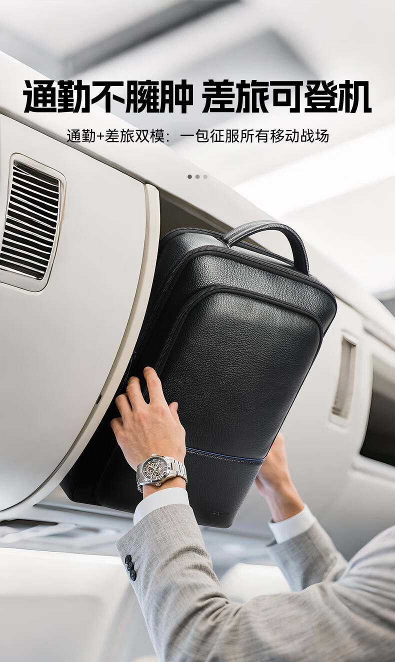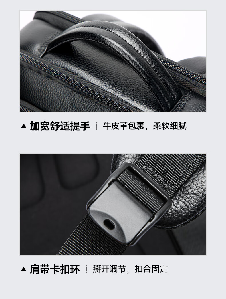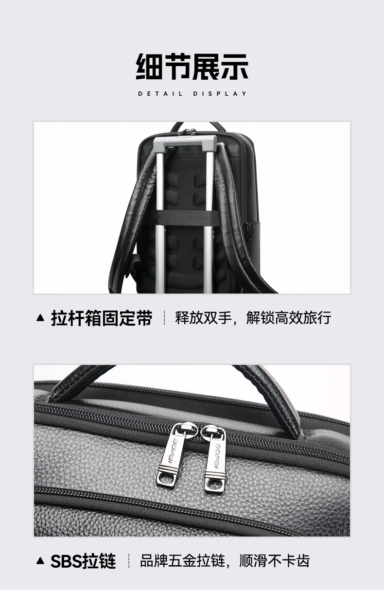 头层牛皮材质,立体有型;独立隐藏水杯位,拉杆固定带;后幅散热设计,抗震减压电脑位