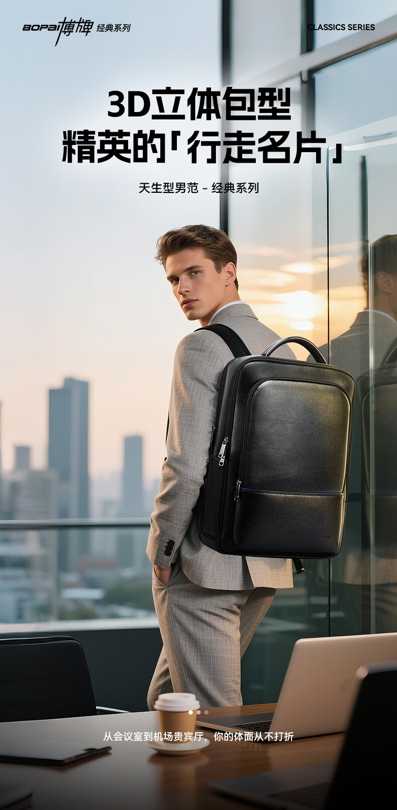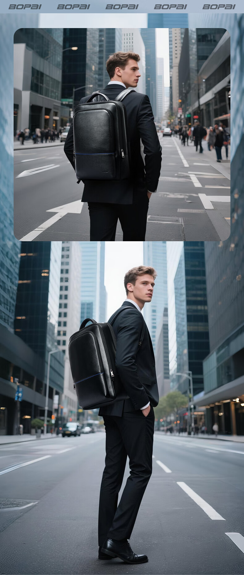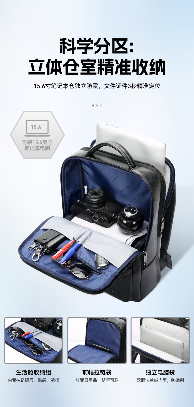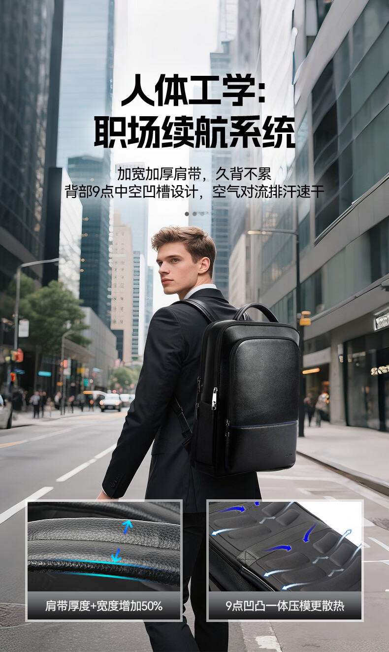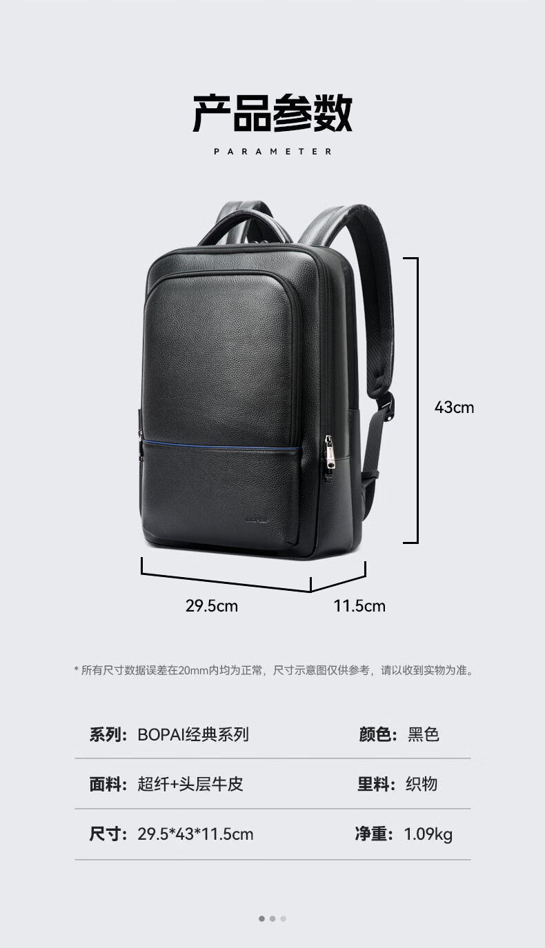 头层牛皮材质,立体有型;独立隐藏水杯位,拉杆固定带;后幅散热设计,抗震减压电脑位