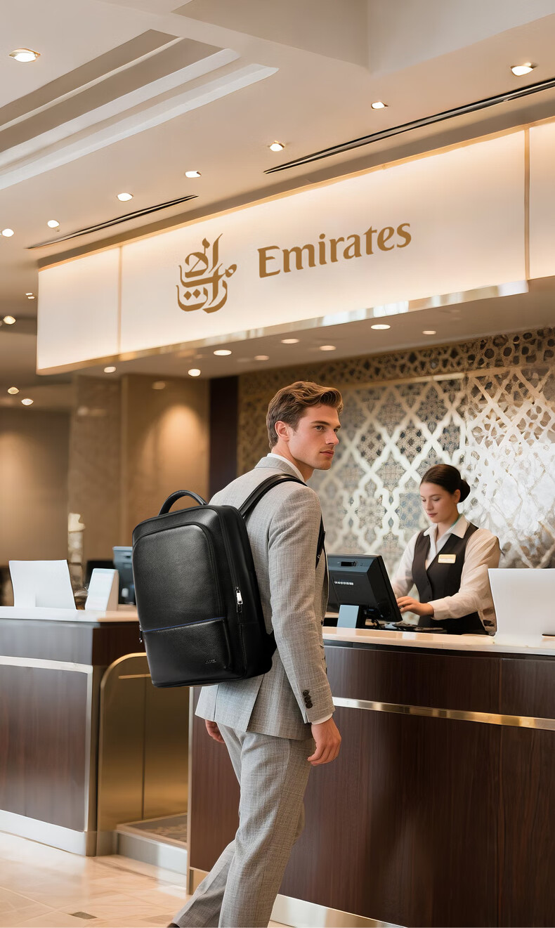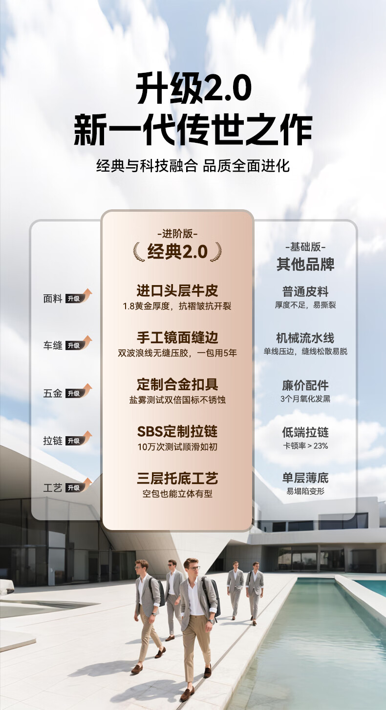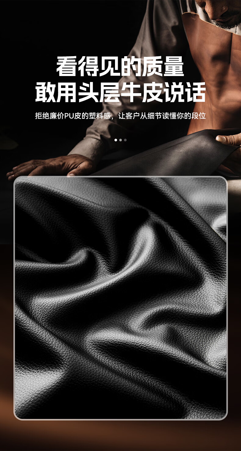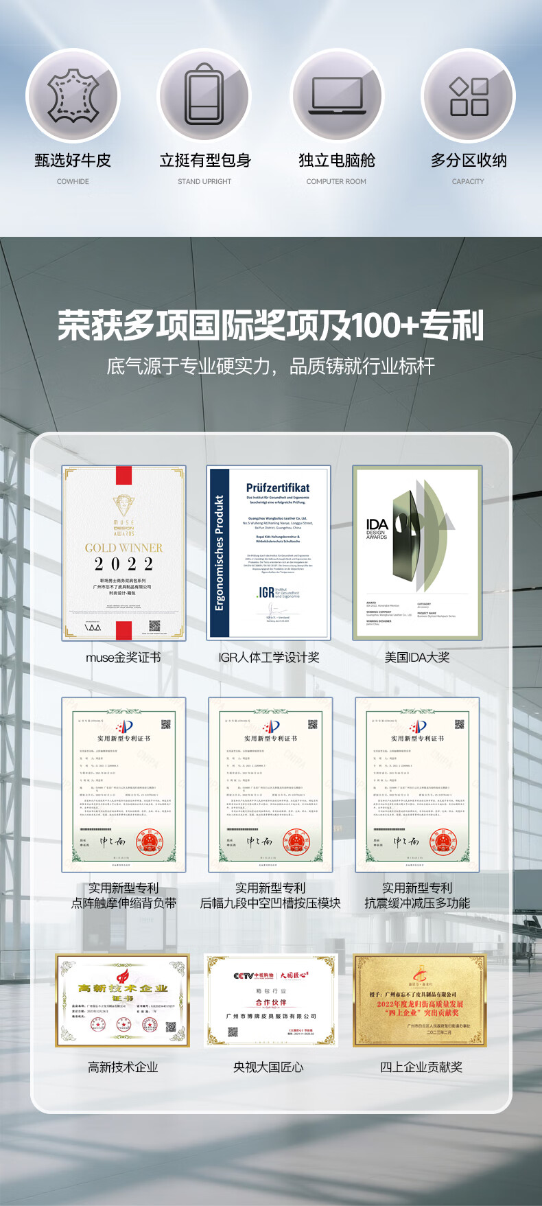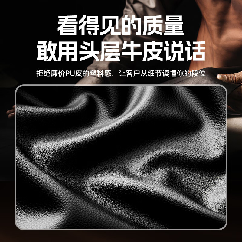 头层牛皮材质,立体有型;独立隐藏水杯位,拉杆固定带;后幅散热设计,抗震减压电脑位