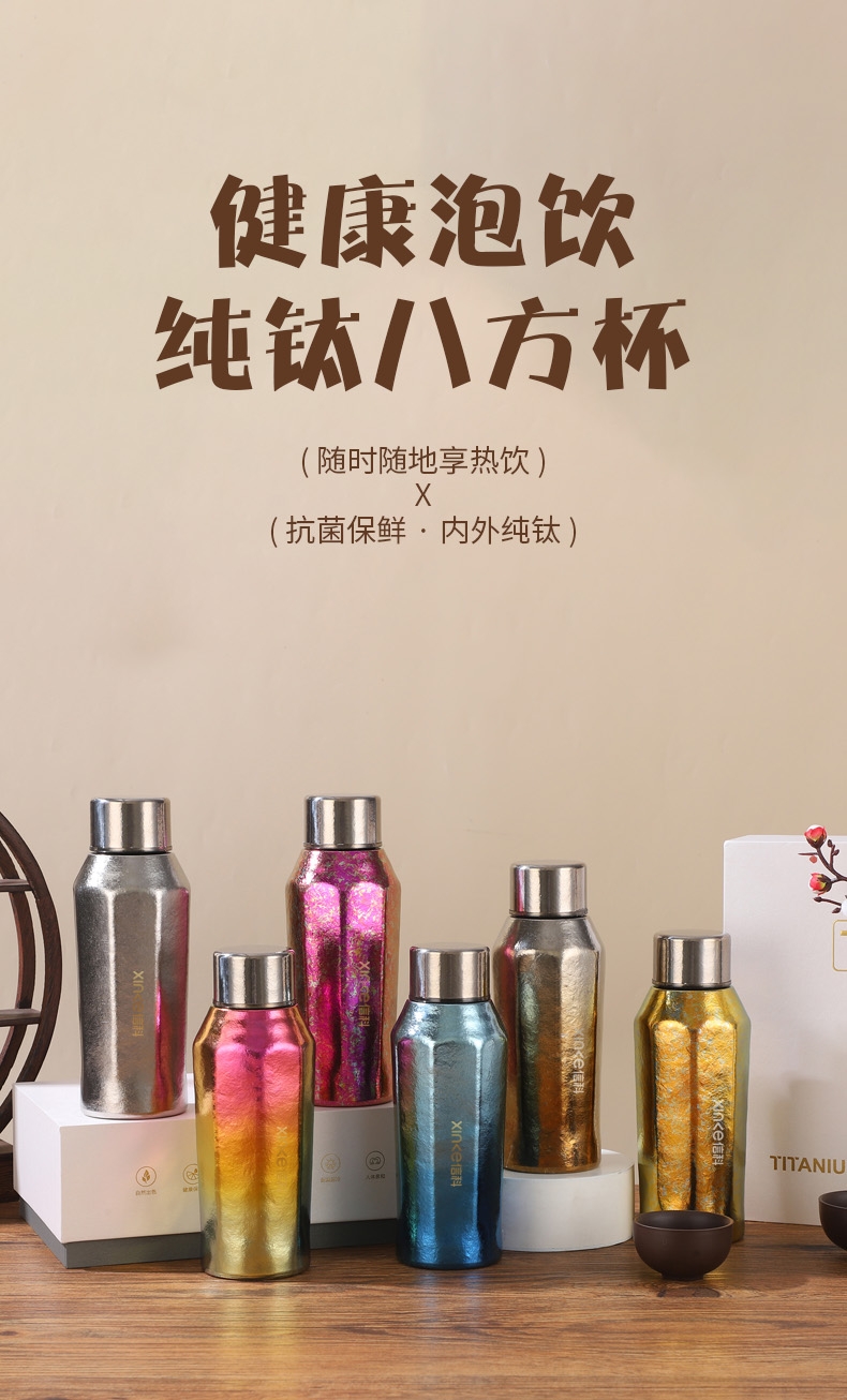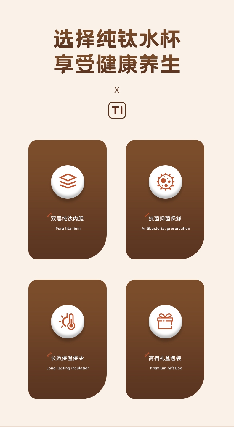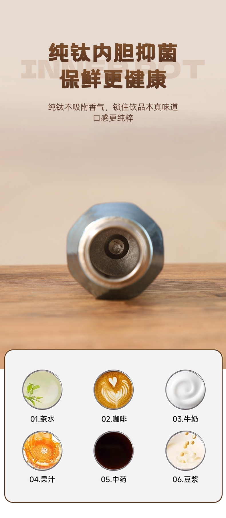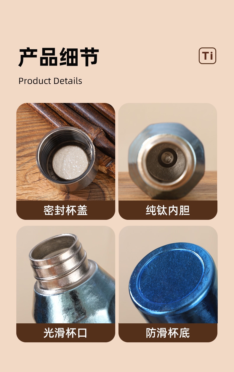 生命金属·守护身体健康耐高低温·尖端航空材料抑菌保;纯钛不吸附香气,锁住饮品本真味道 口感更纯粹;保温保冷 双层真空锁温