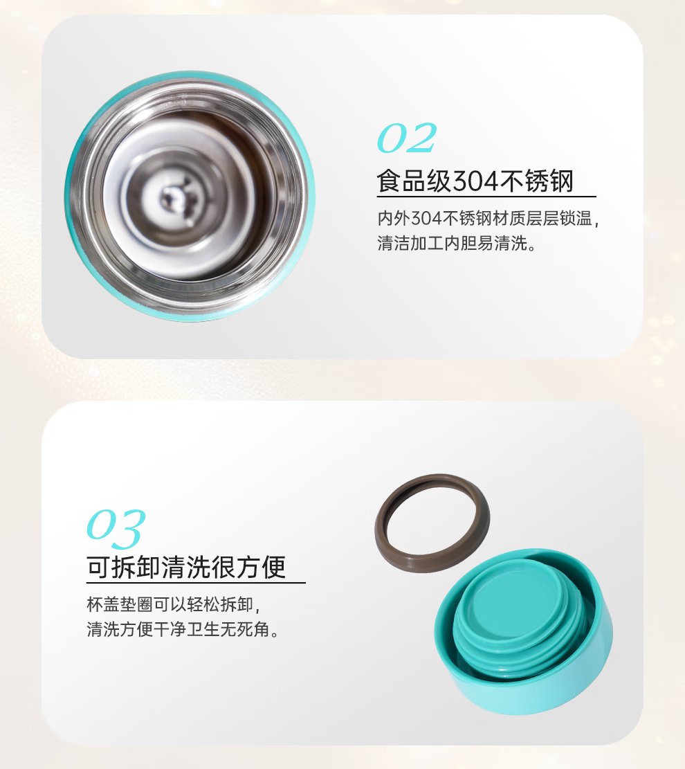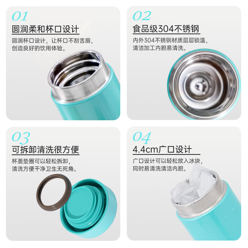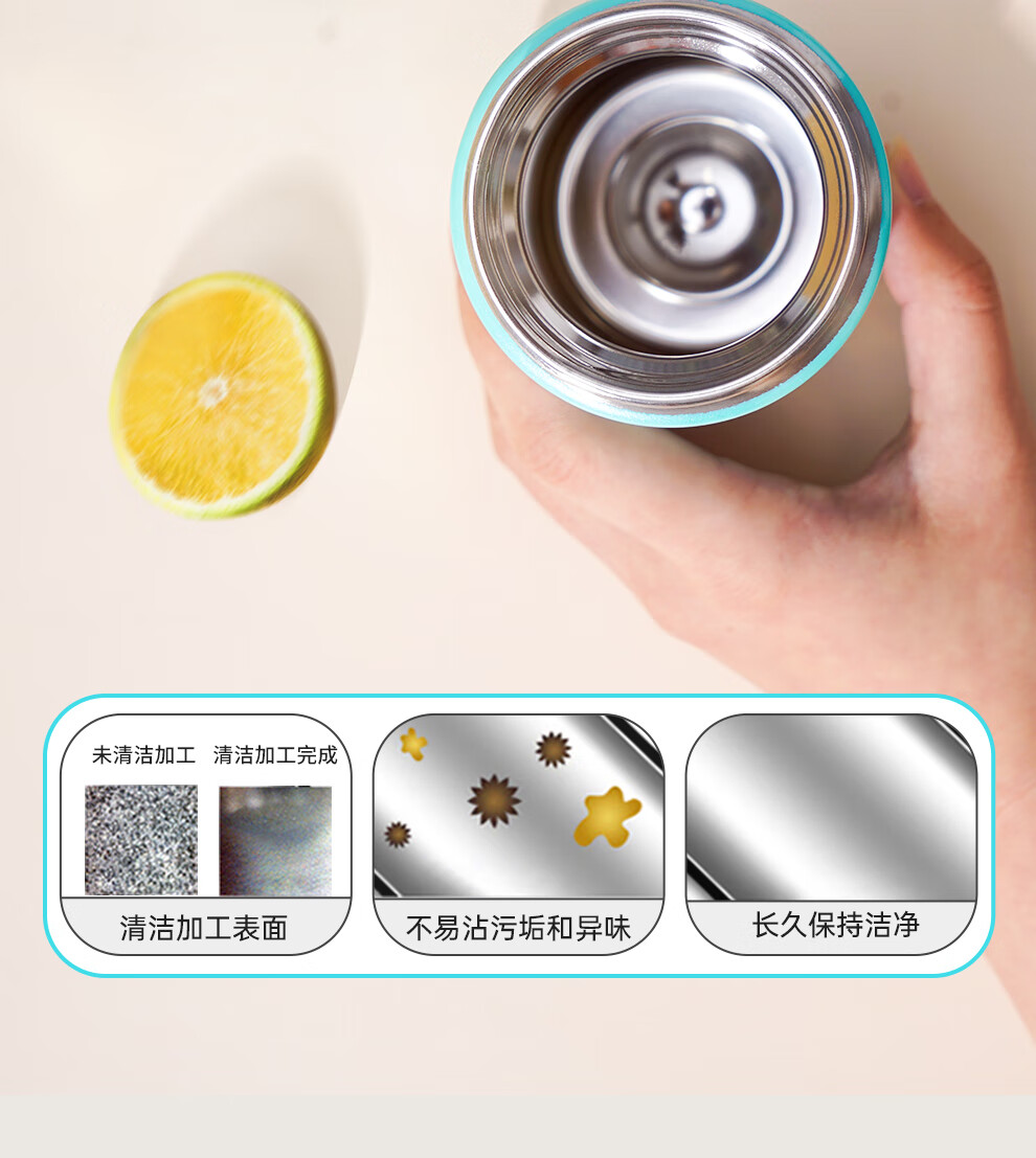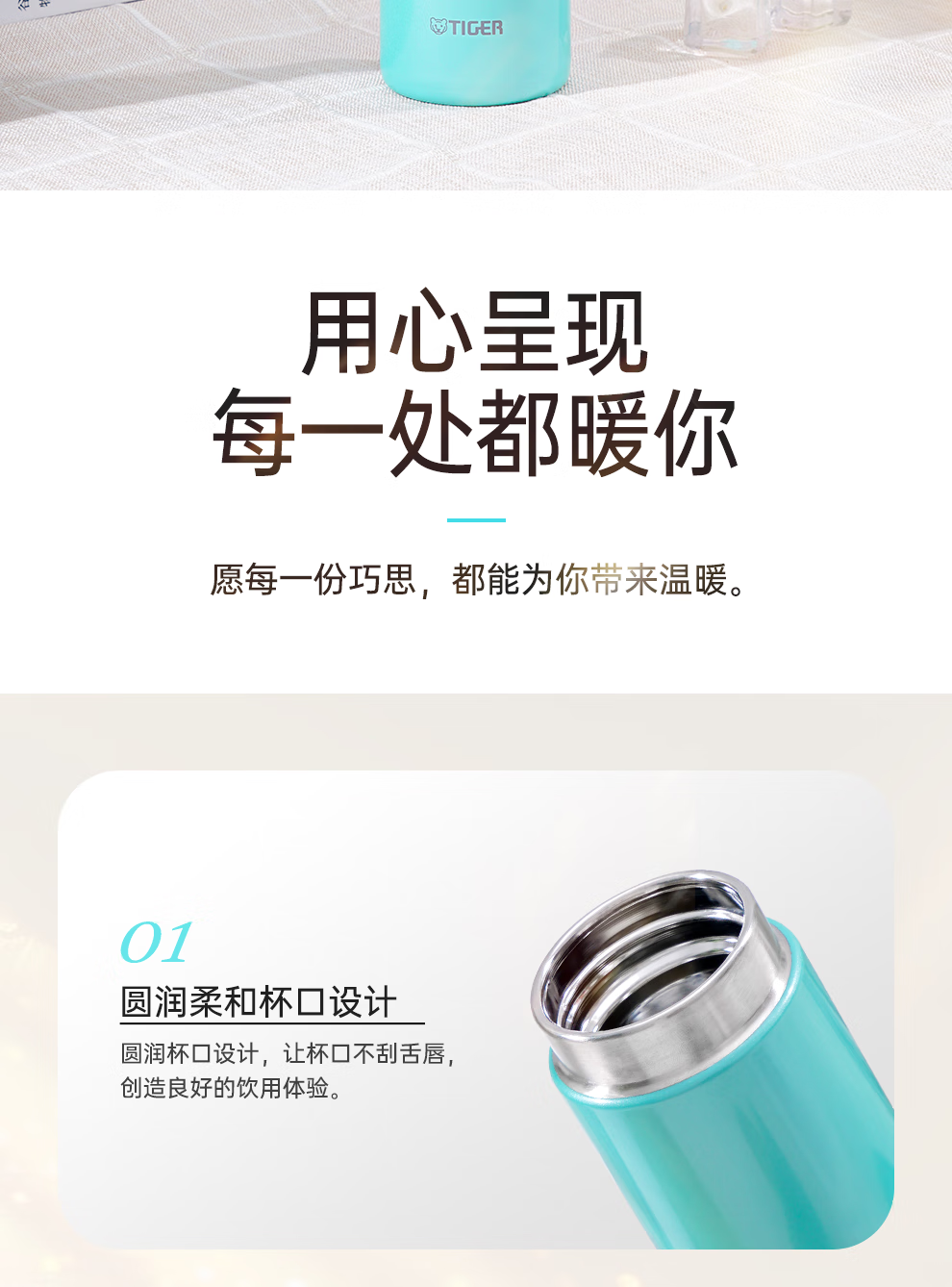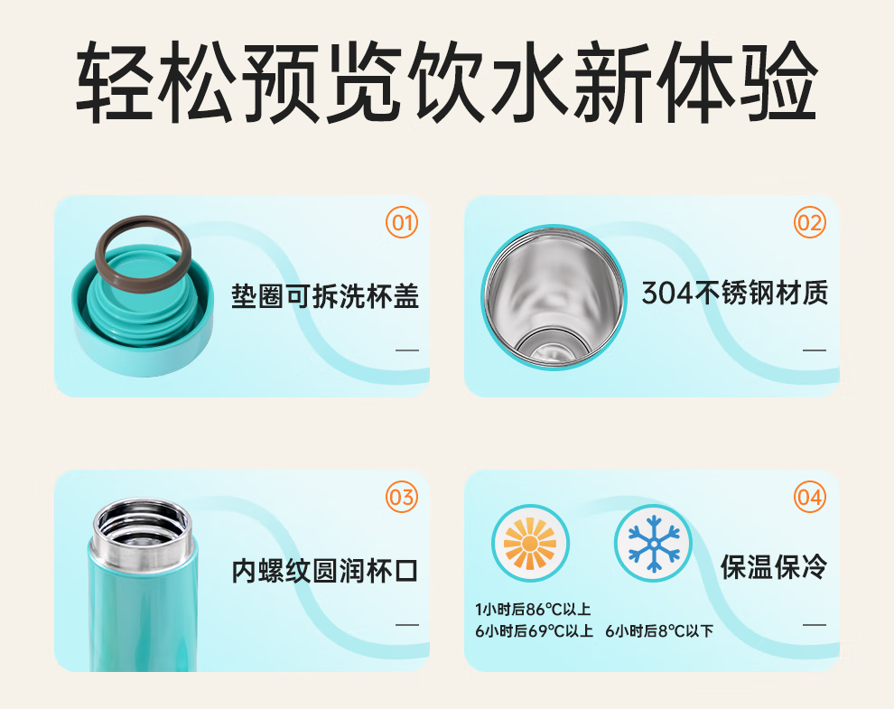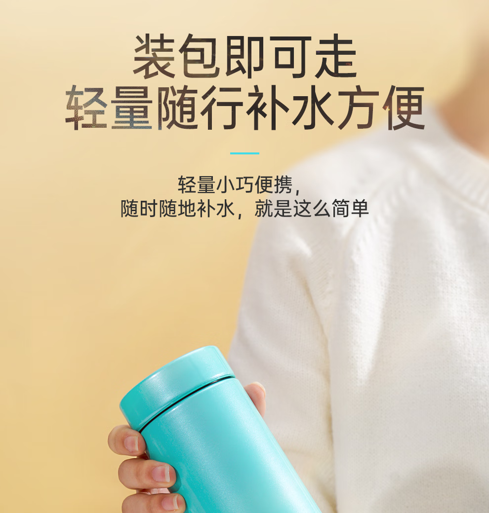 轻盈随身自在出行;360度密封防漏出行自由无担忧;圆润柔和杯口设计