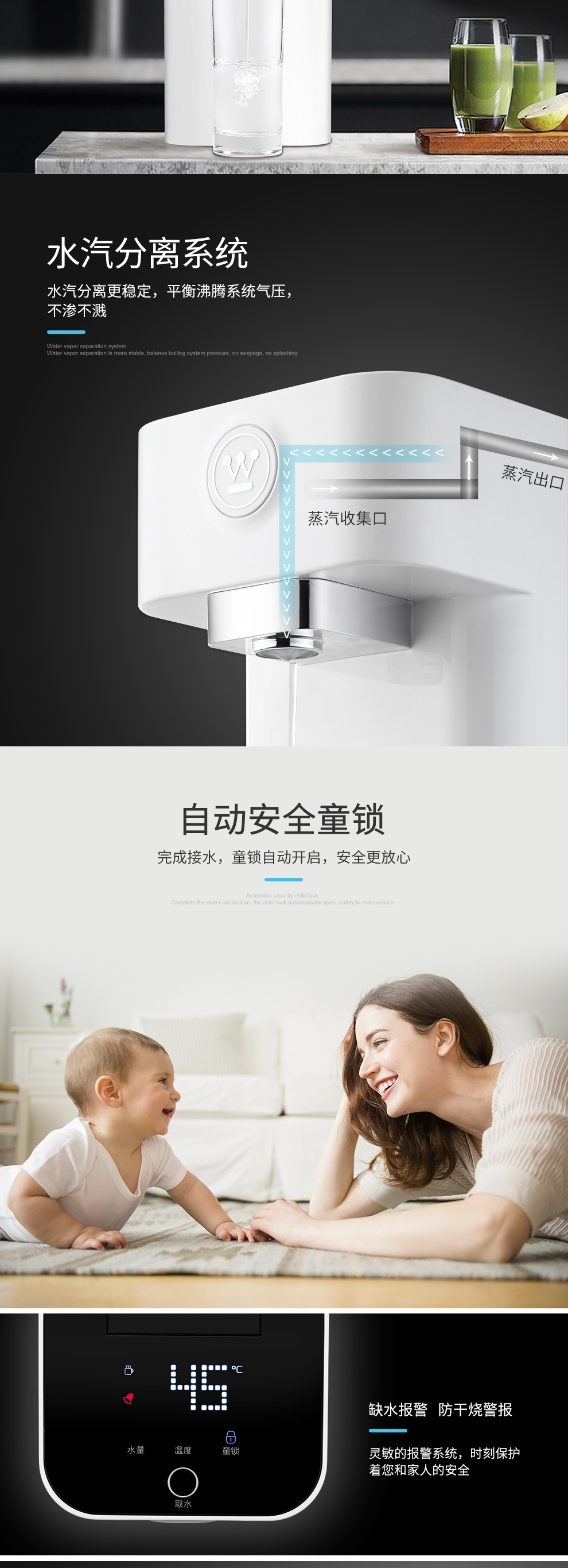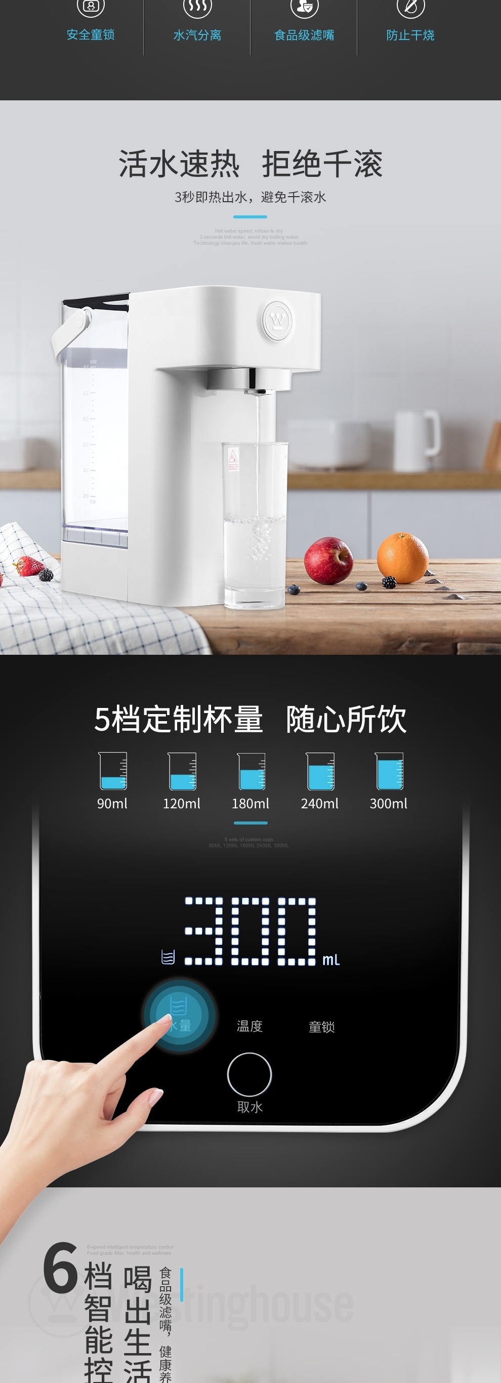 ◆活水速热,拒绝干滚 ;◆六档温度调节,喝出生活的维度;◆五档出水量,多一份安心;◆多一重保护,多一份安心