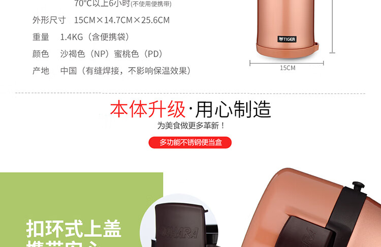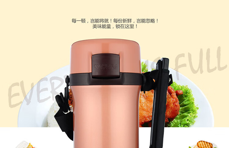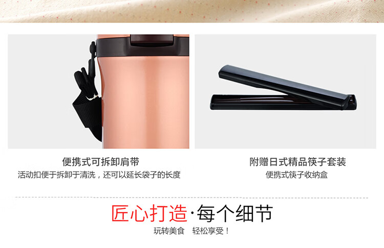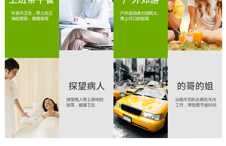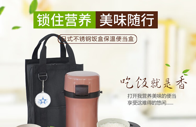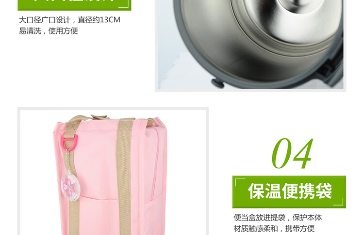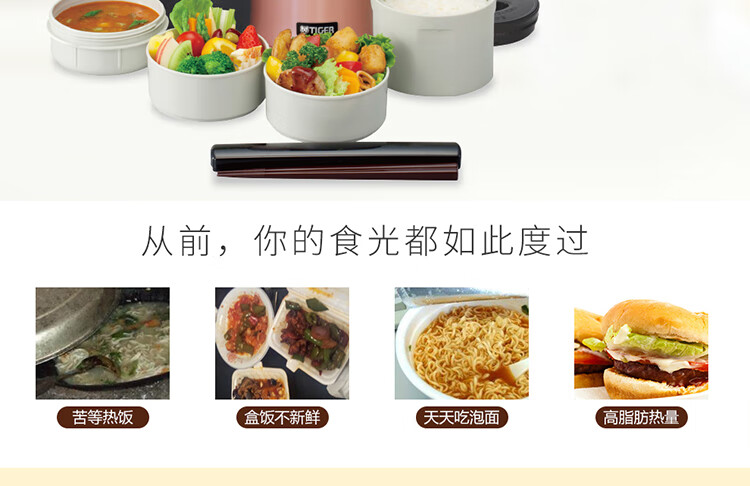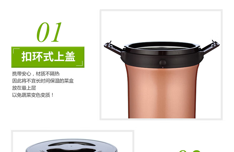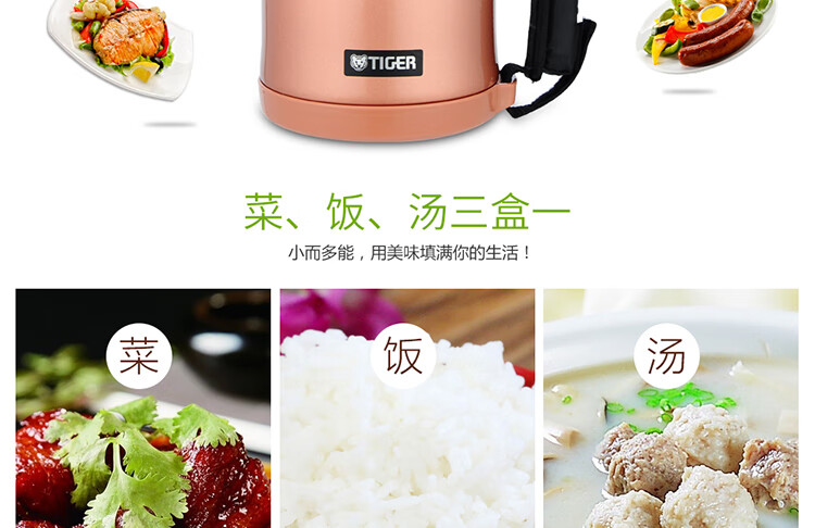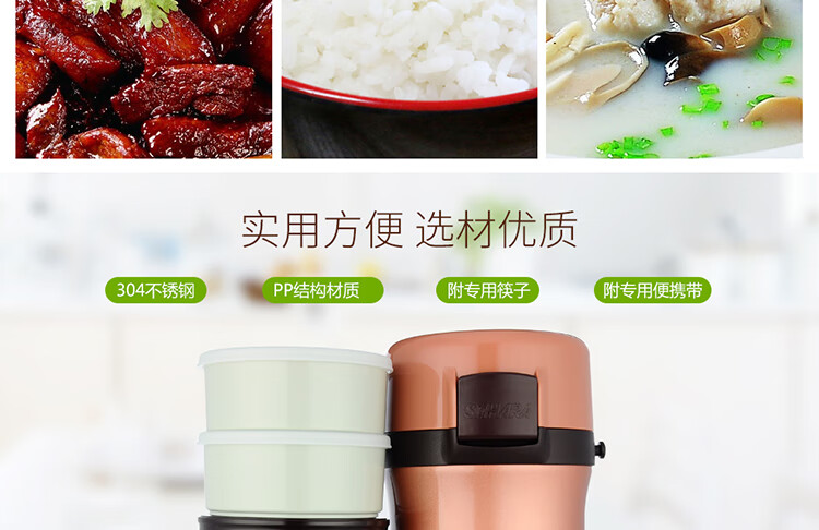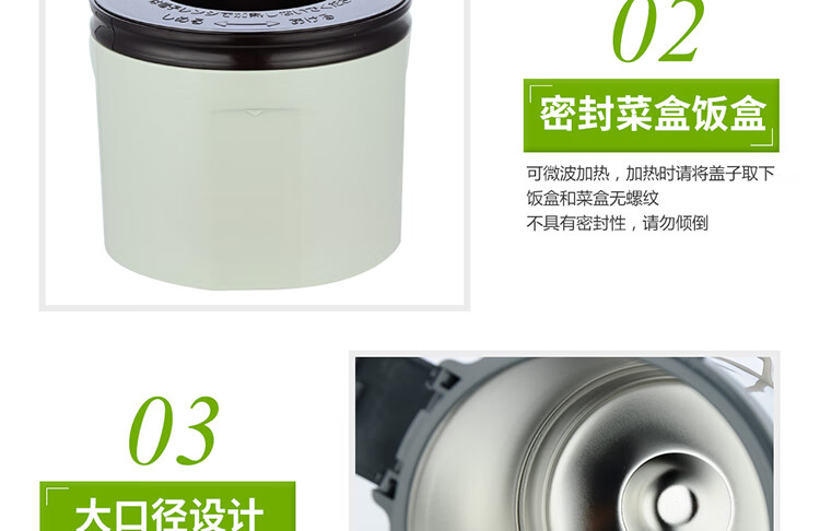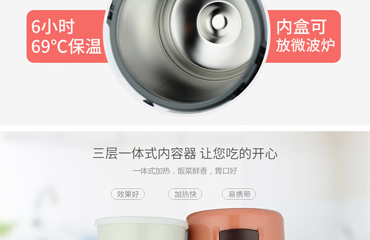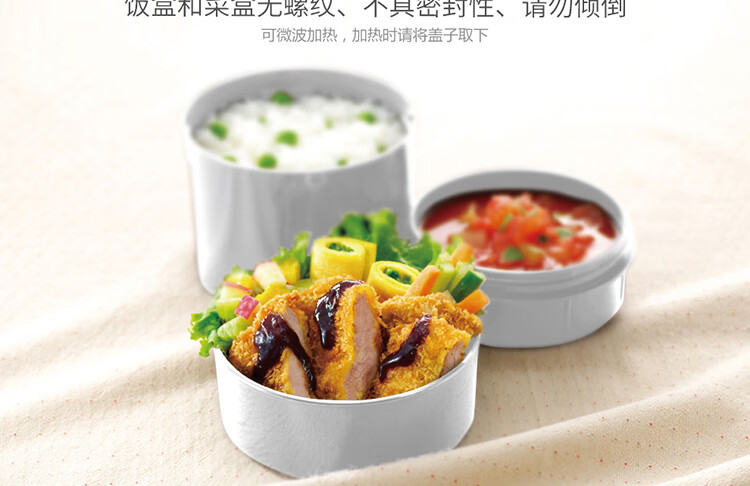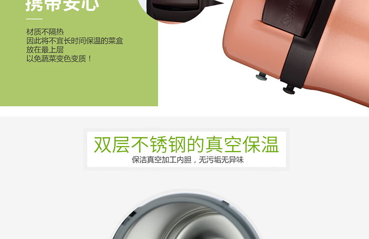 双层不锈钢的真空保温;三层一体式内容器让您吃的开心,一体式加热;饭盒和菜盒无螺纹、不具密封性、请勿倾倒
