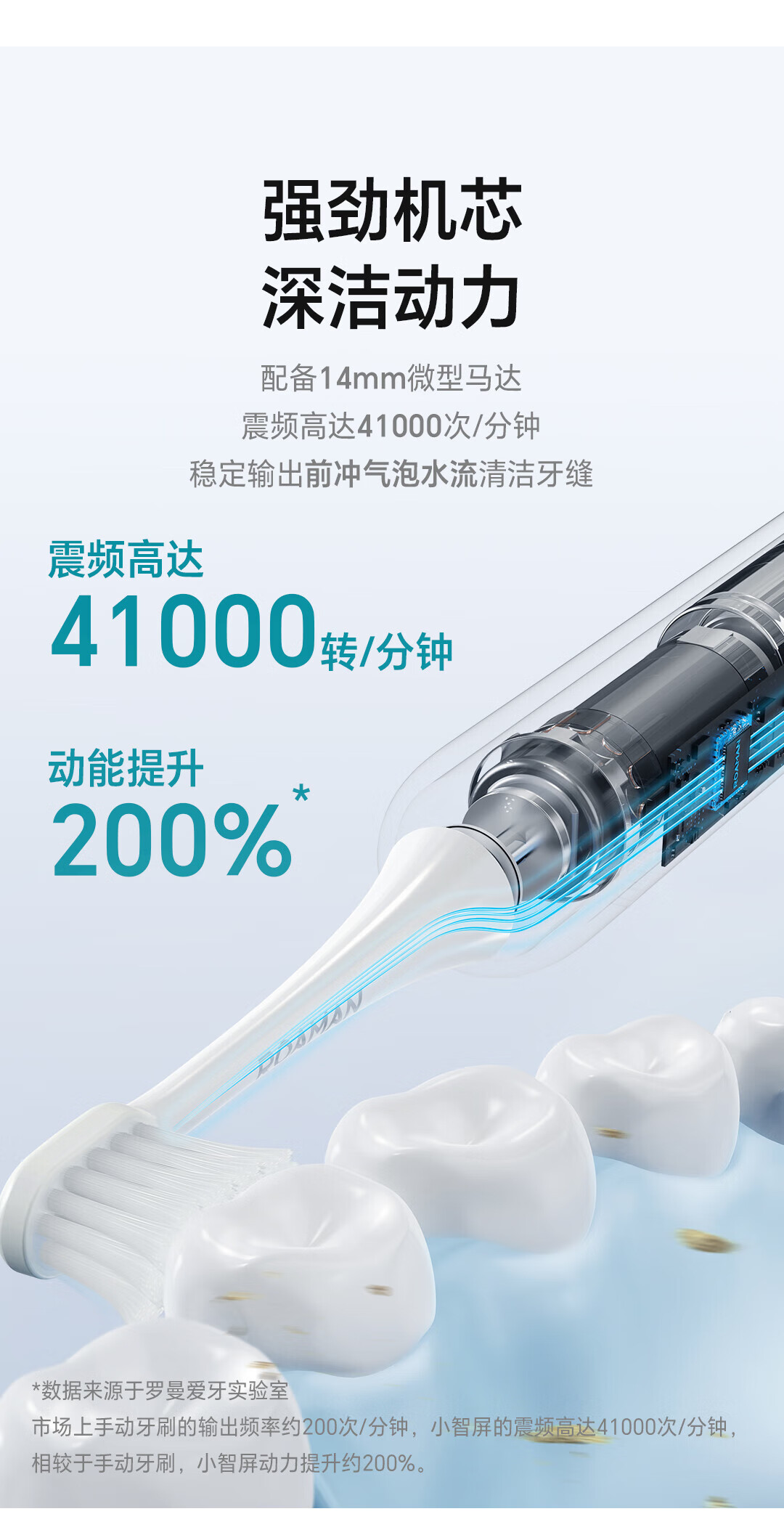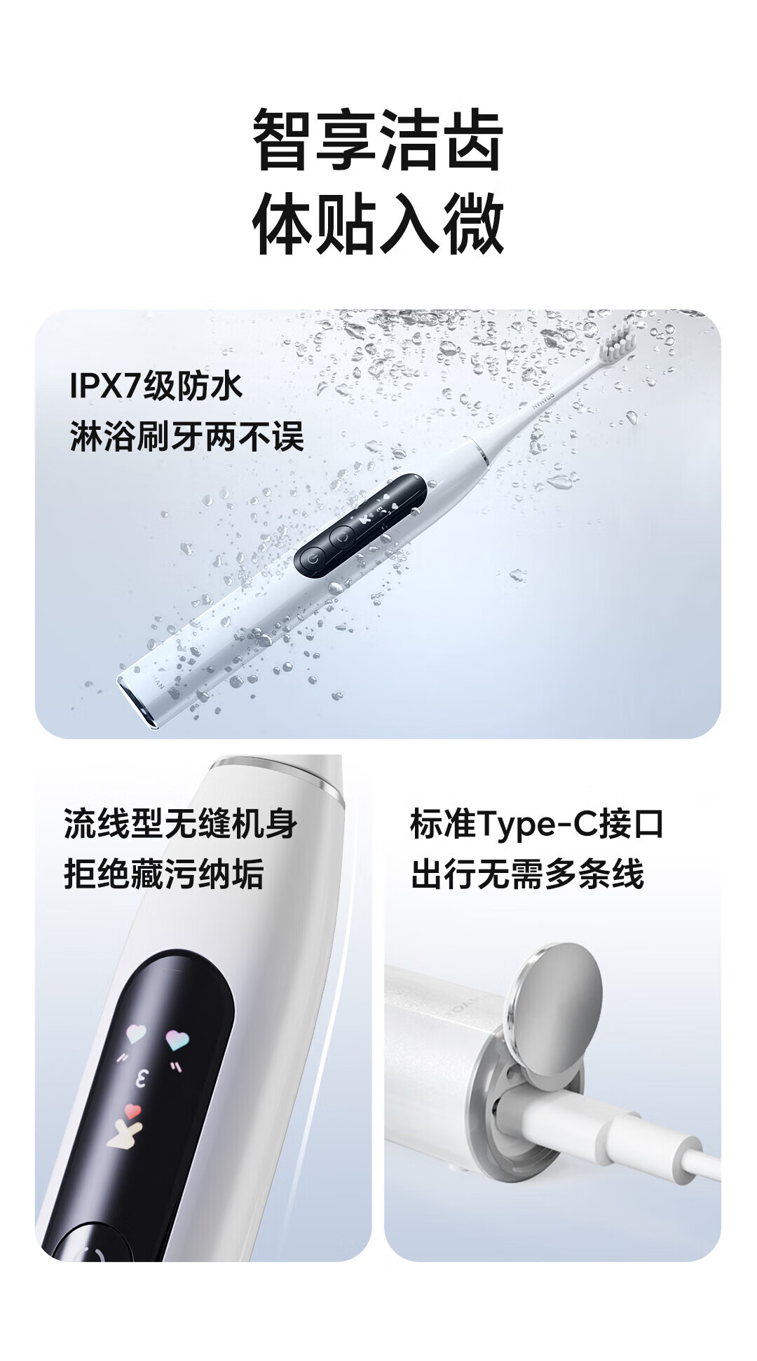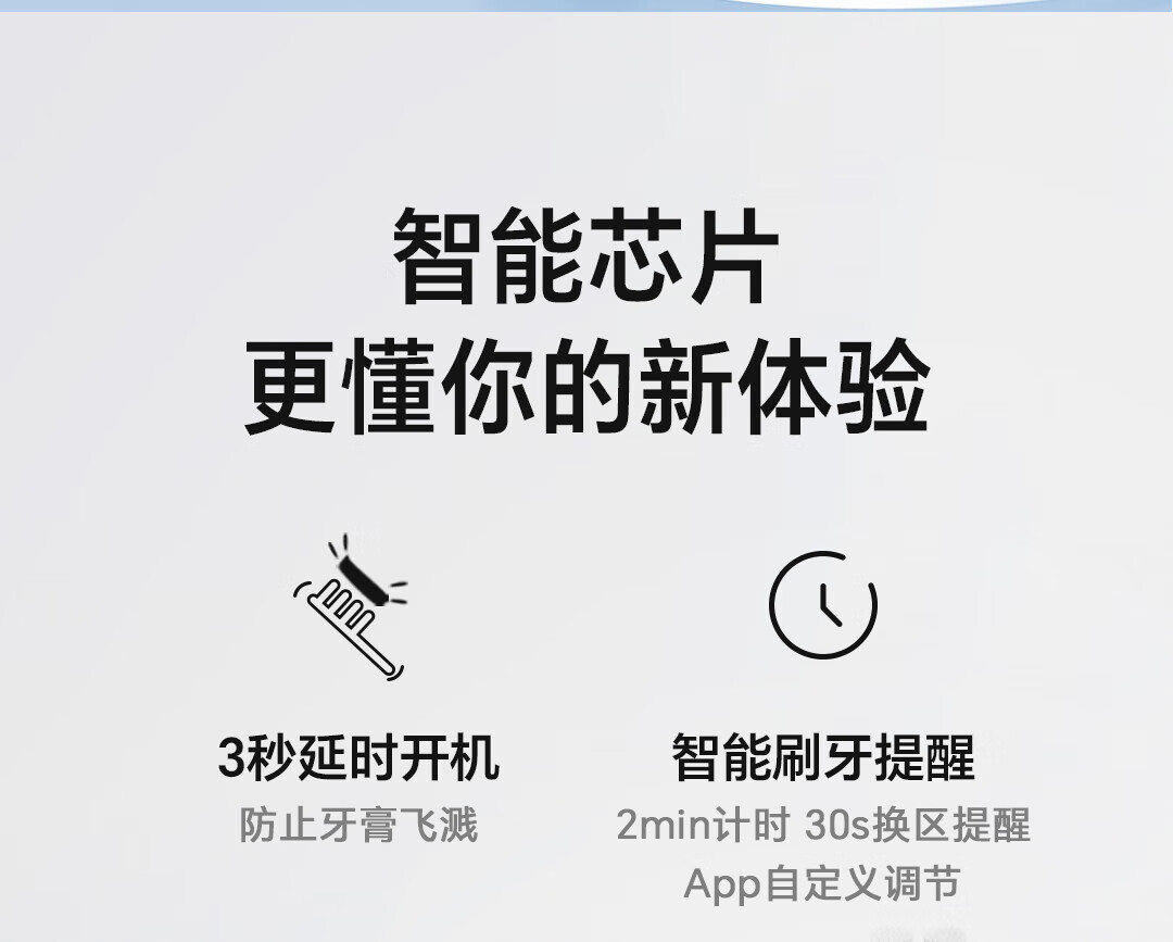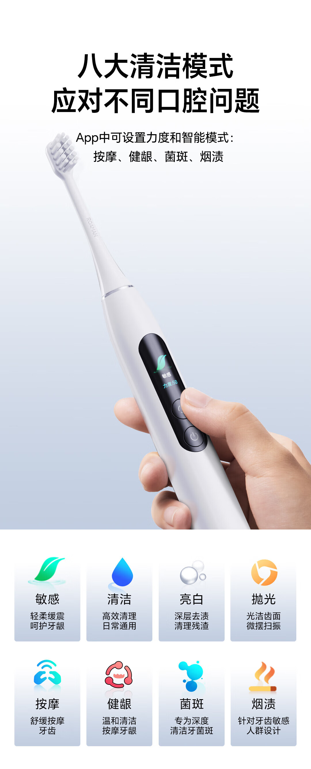 41000次/分钟声波震动;8种清洁模式,应对不同口腔问题;IPX7级全身水洗,可淋浴