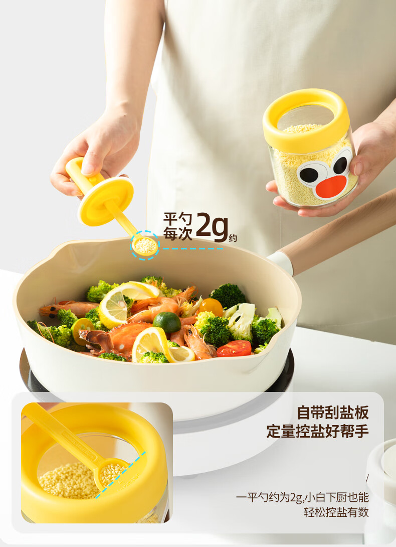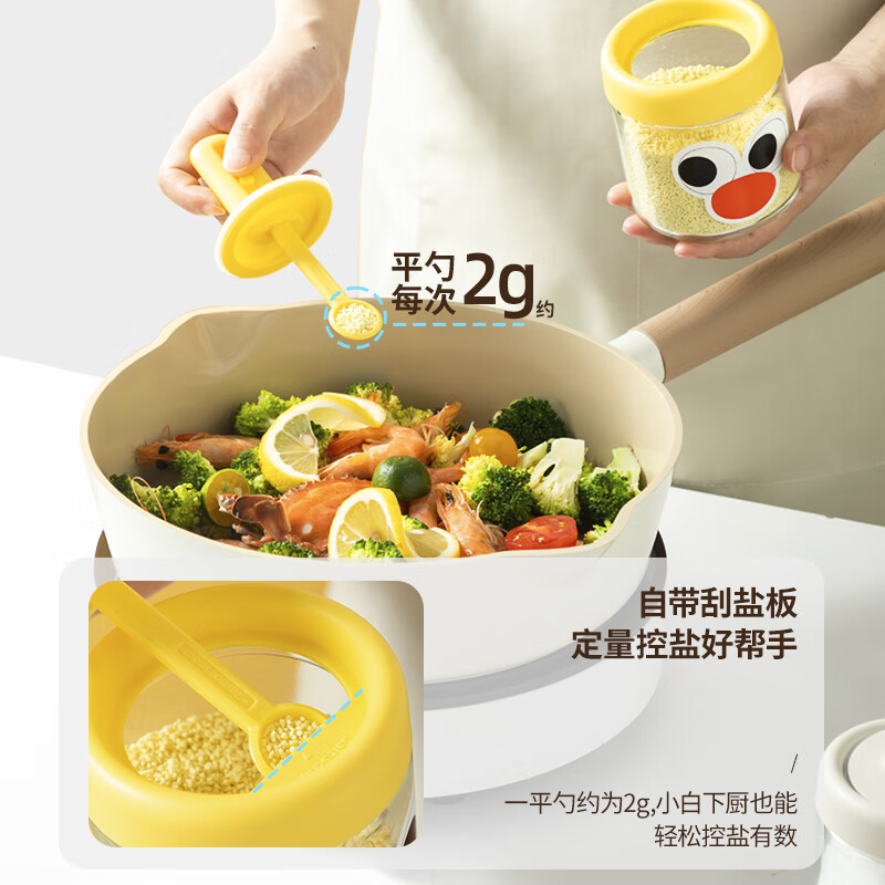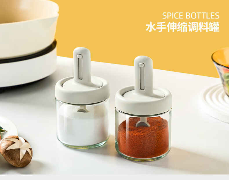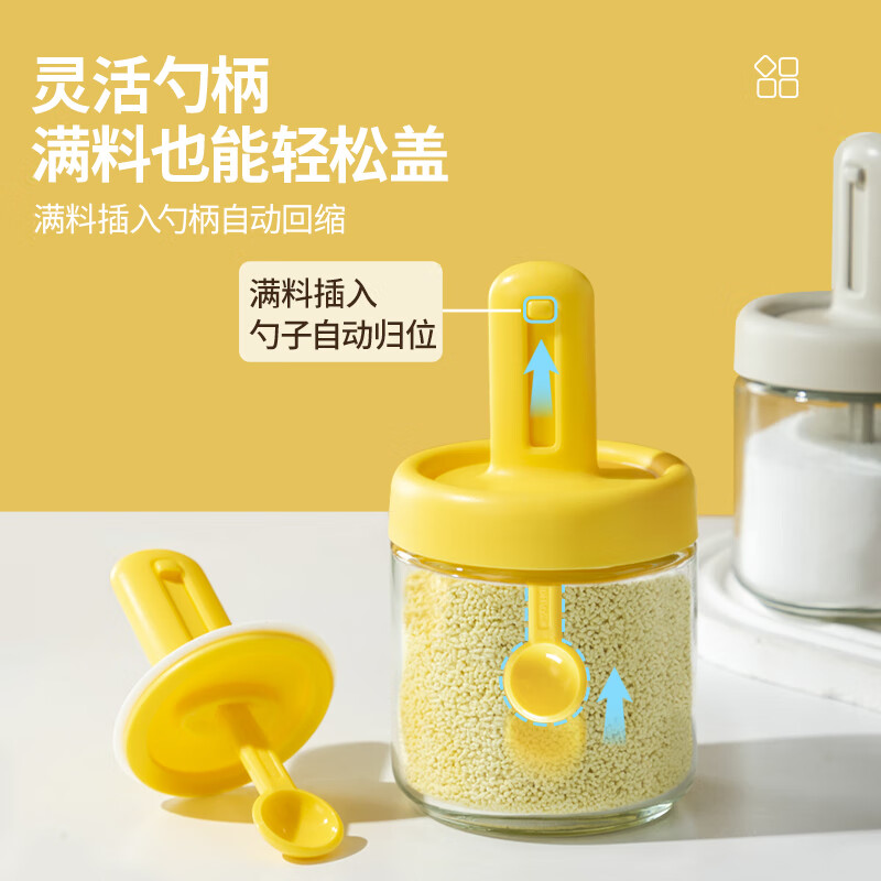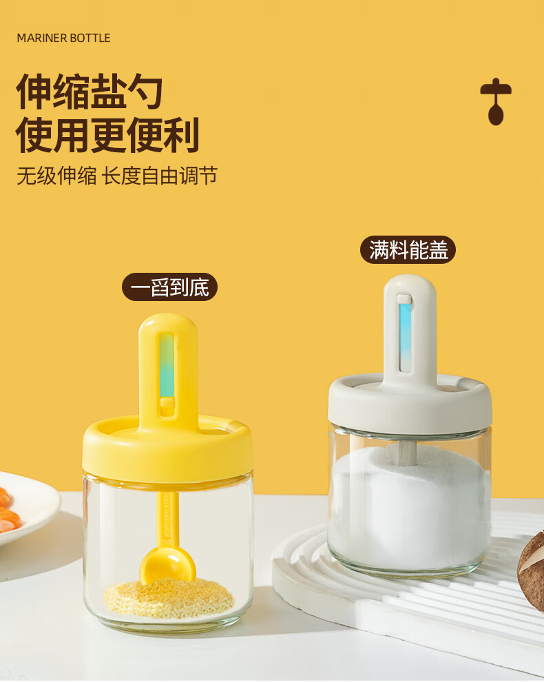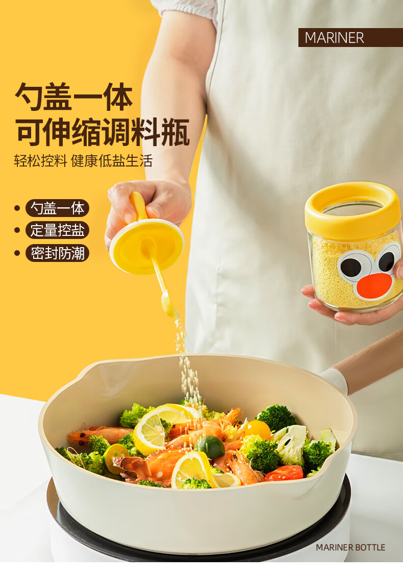 高效密封,调料久置不结块;勺盖一体伸缩设计,调料轻松舀;调料余量看得见,下厨料理更轻松