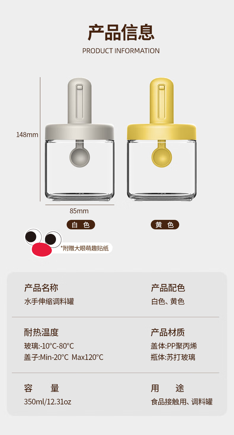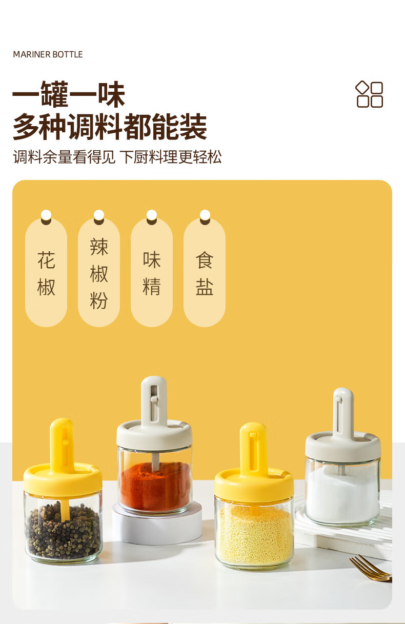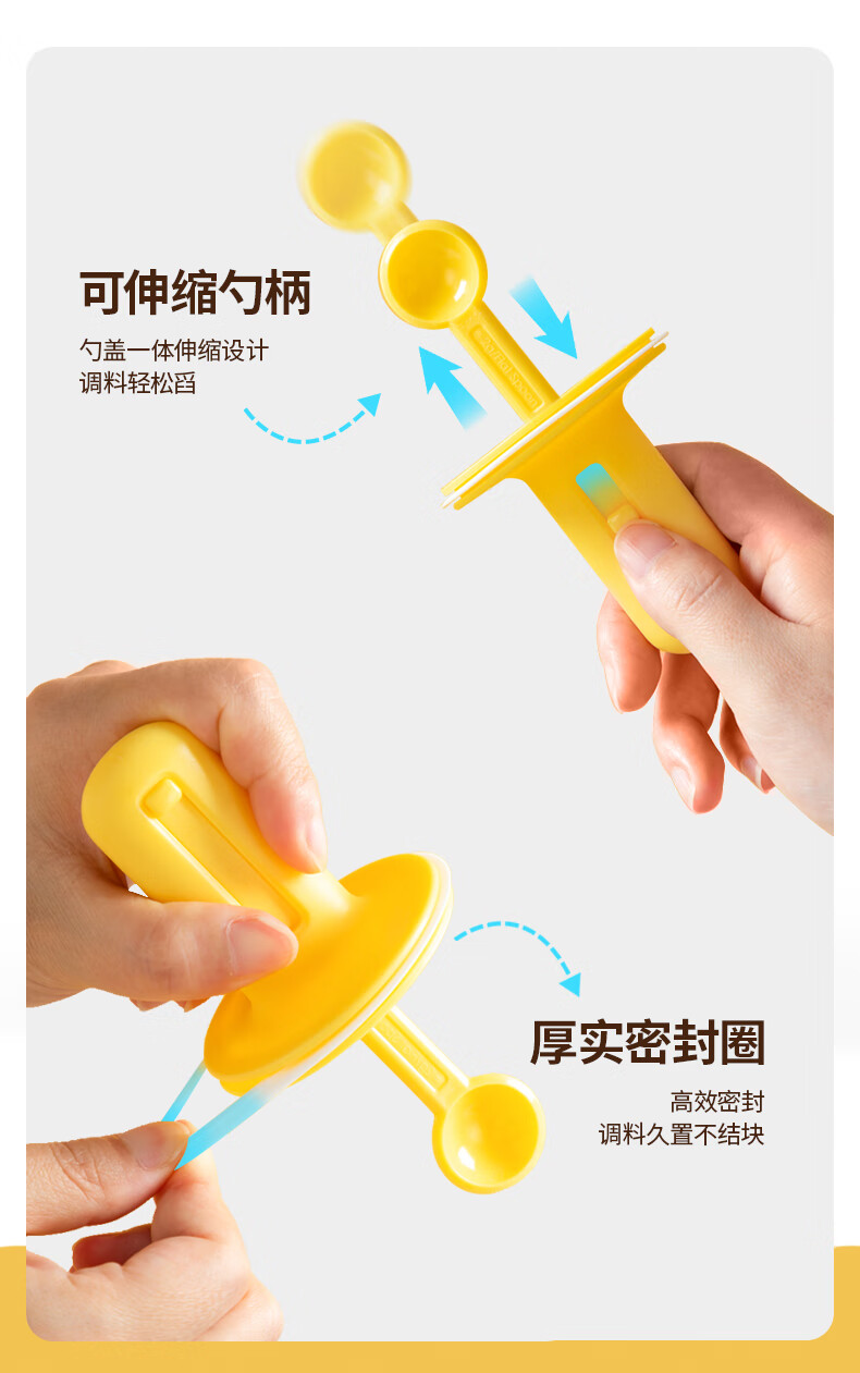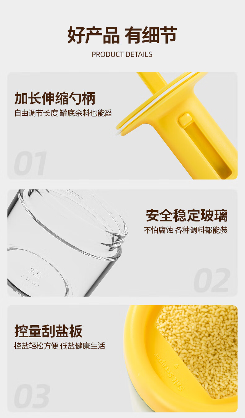 高效密封,调料久置不结块;勺盖一体伸缩设计,调料轻松舀;调料余量看得见,下厨料理更轻松
