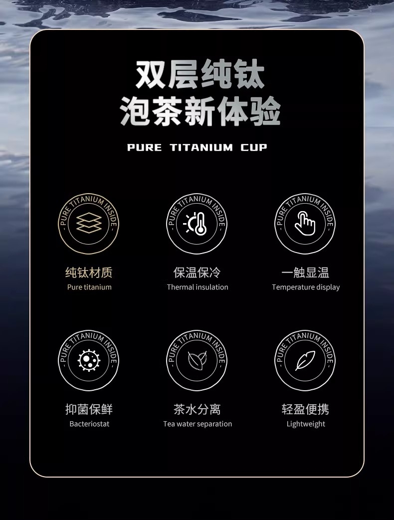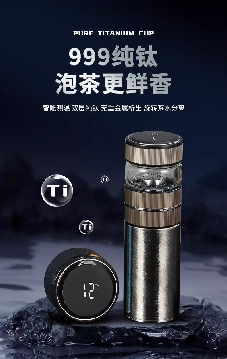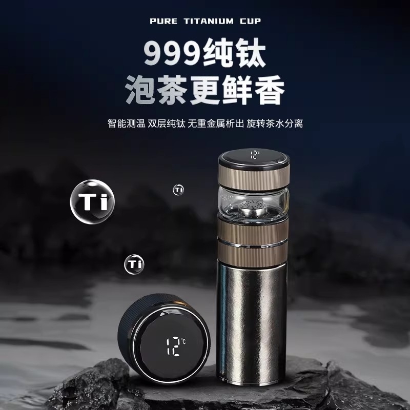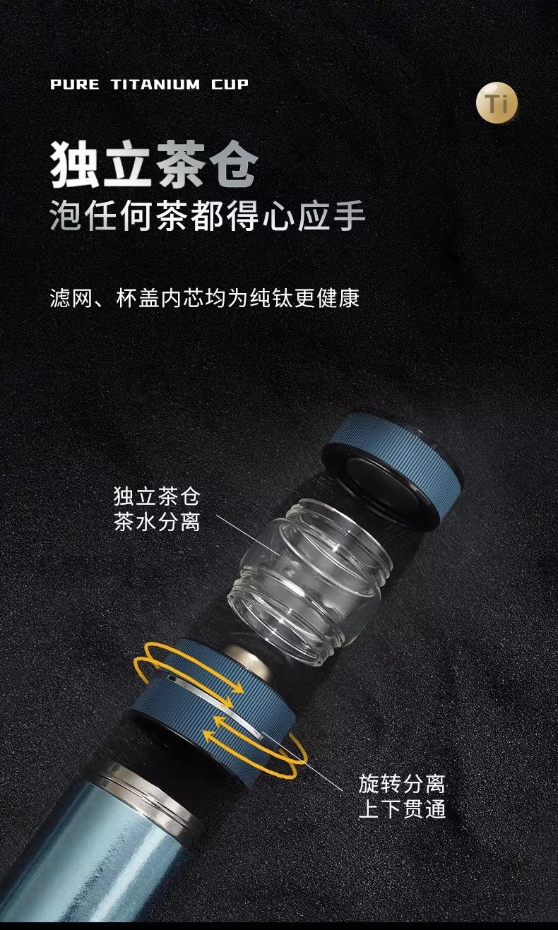999纯钛泡茶更鲜香 智能测温双层纯钛无重金属析出;内外纯钛茶水无异味 鲜香回甘 无重金属析出;独立茶仓泡任何茶都得心应手 滤网、杯盖内芯均为纯钛;密封防漏携带更方便 无论如何颠簸也不漏水,安全出行;便携车载温暖一路同行 出差旅行路上,陪伴与你贴身