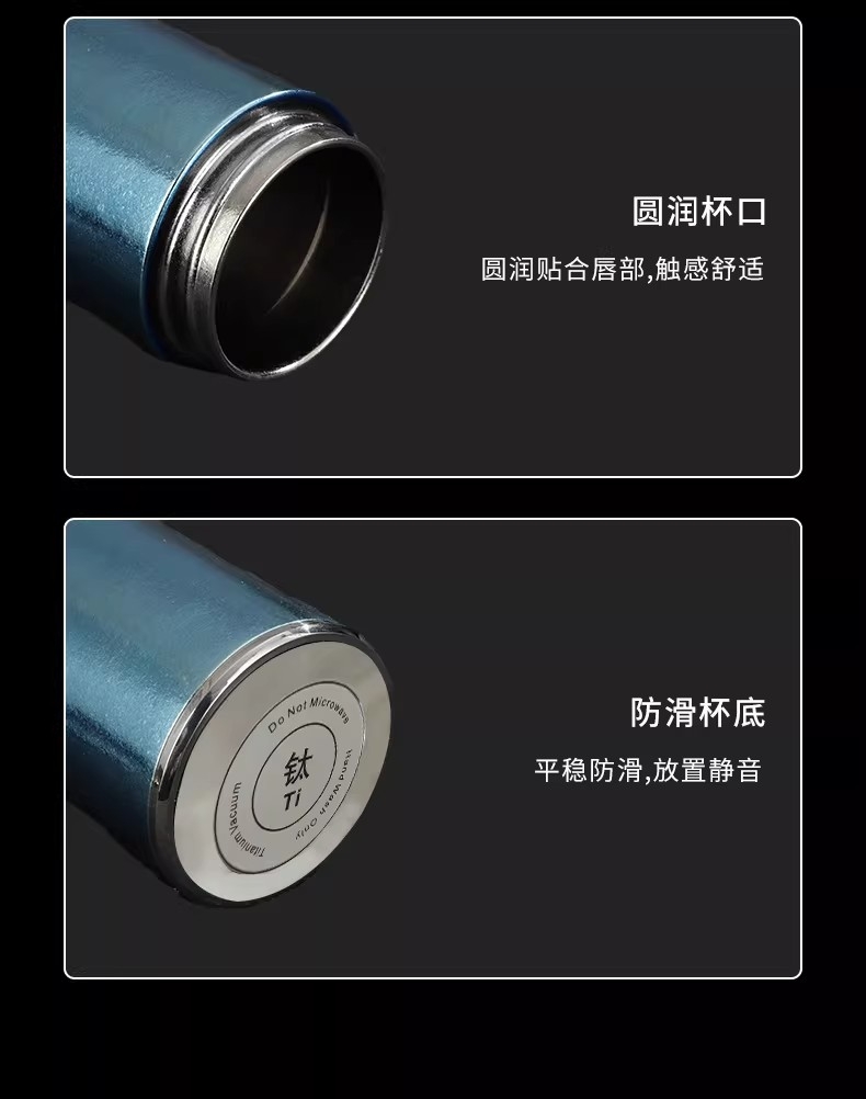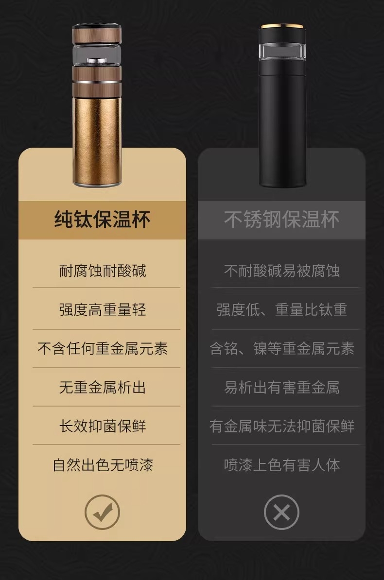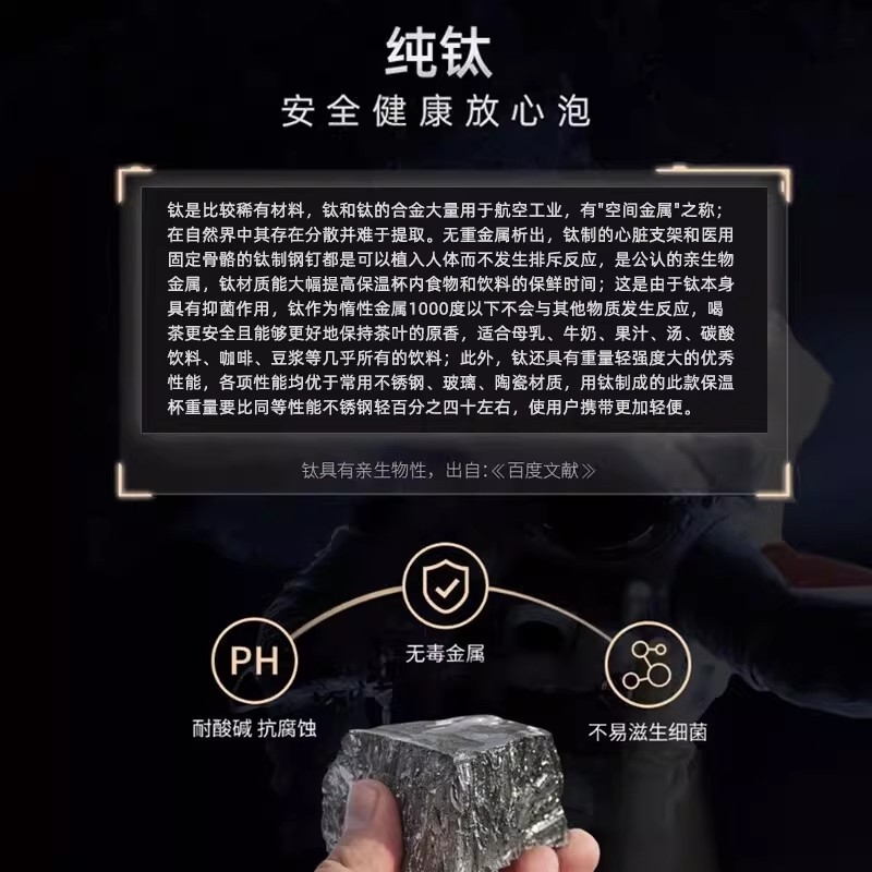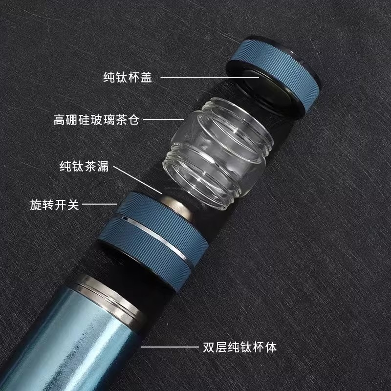 999纯钛泡茶更鲜香 智能测温双层纯钛无重金属析出;内外纯钛茶水无异味 鲜香回甘 无重金属析出;独立茶仓泡任何茶都得心应手 滤网、杯盖内芯均为纯钛;密封防漏携带更方便 无论如何颠簸也不漏水,安全出行;便携车载温暖一路同行 出差旅行路上,陪伴与你贴身