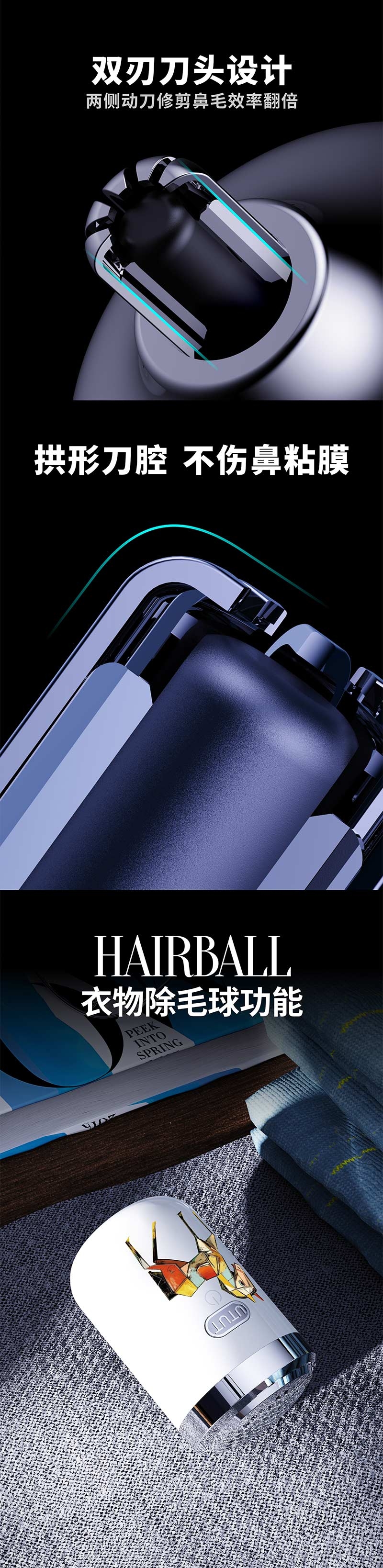 特色功能:磁吸刀头,鬓角修剪,可水洗,浮动刀头,干湿两用式,便携