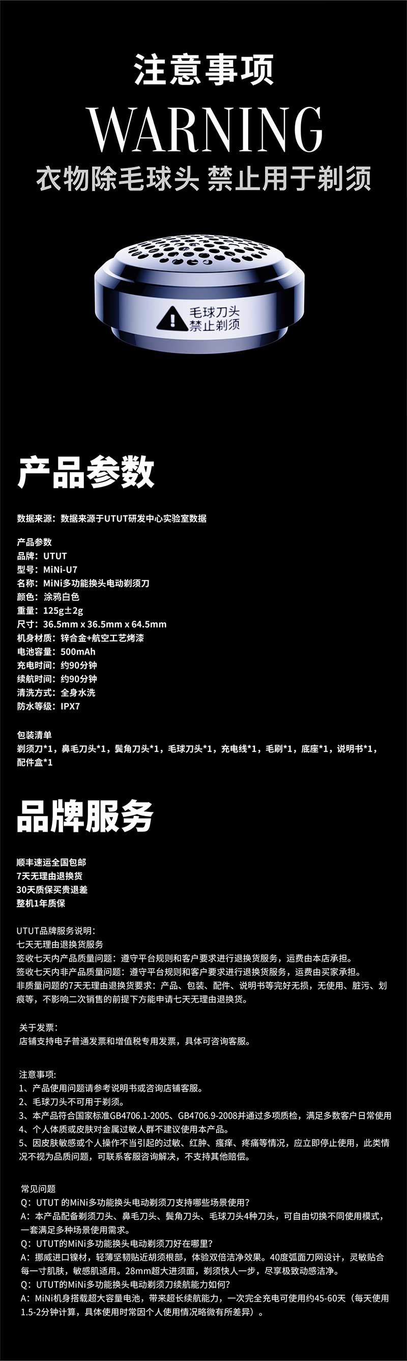 配置清单:剃须刀主体*1 鼻毛刀头*1 须发刀头*1 除毛球刀头*1 放置板*1 充电线*1 毛刷*1 产品使用说明书*1 配件盒*1 包装盒*1 手提袋*1