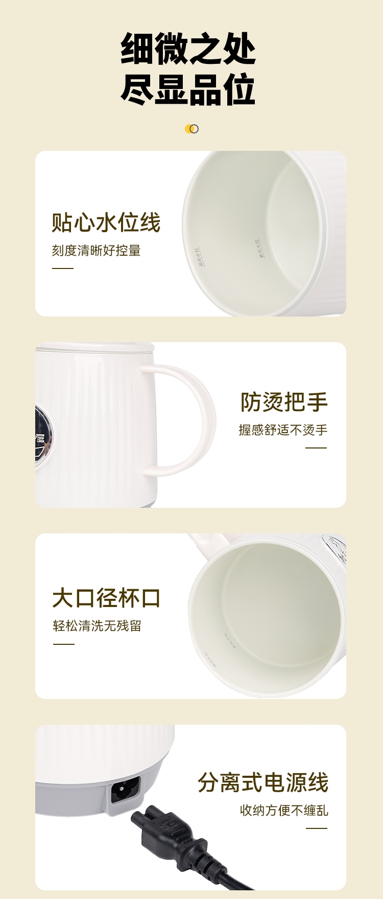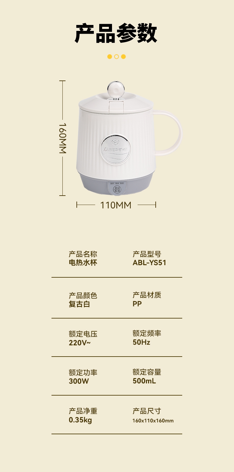 500mL容量,一键快速启动加热,;食品接触PP材质,防烫无异 内置环保不粘涂层,;外观新颖精致,小巧易收纳