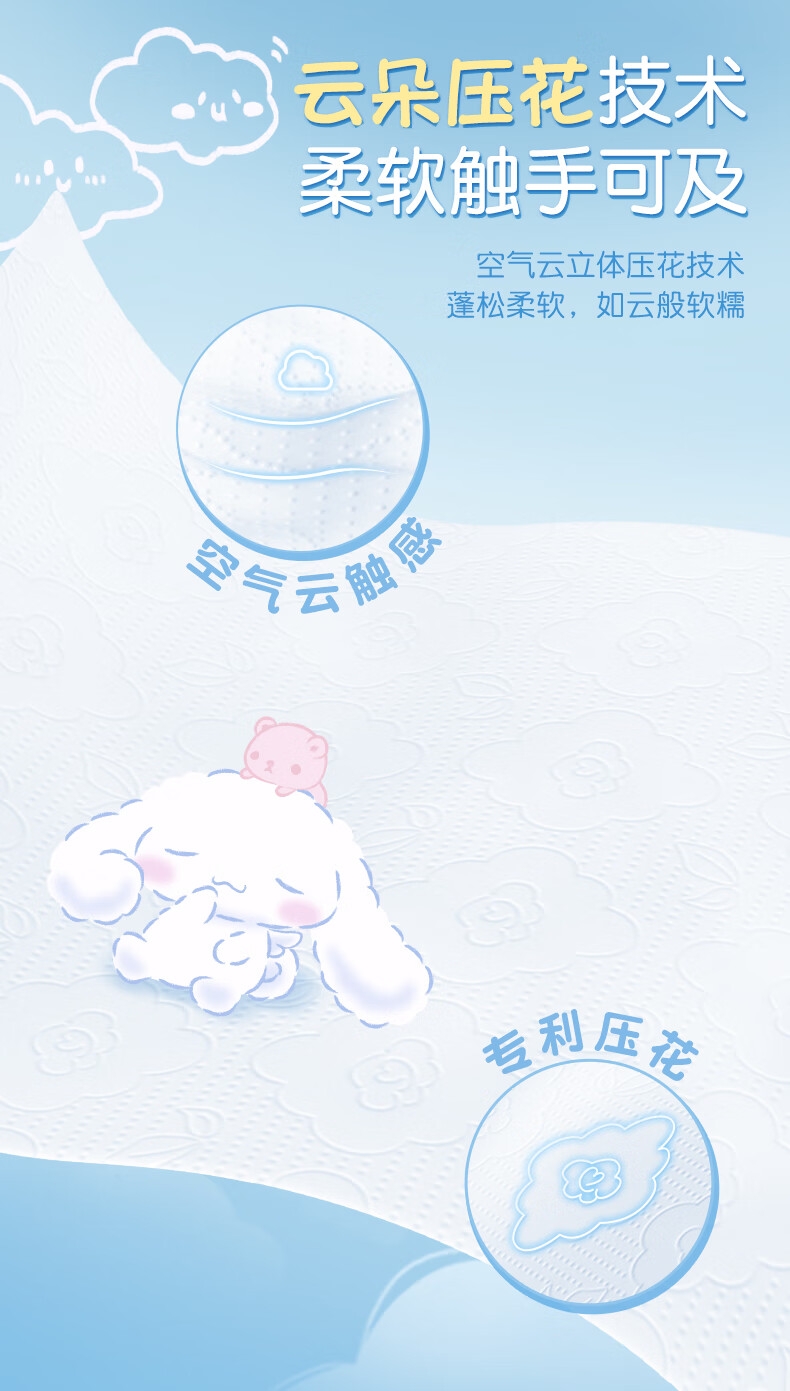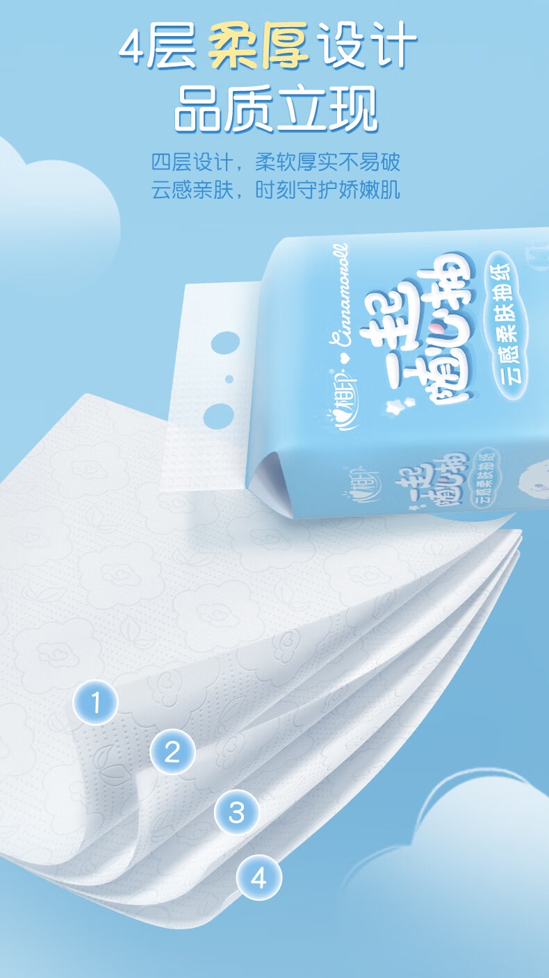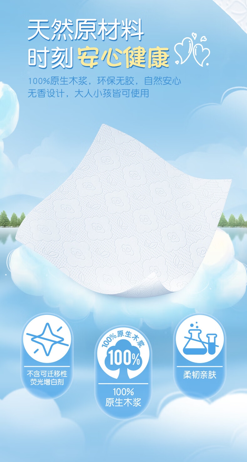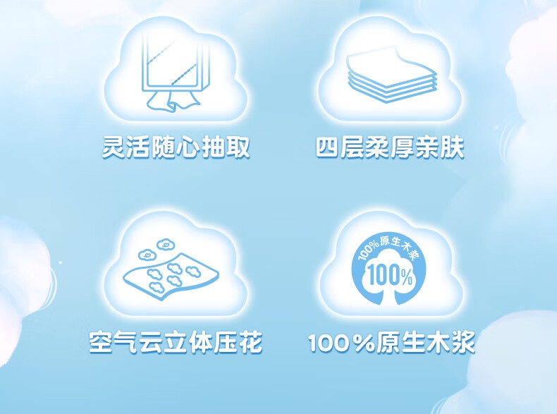 四层柔厚亲肤;空气云立体压花;100%原生木浆