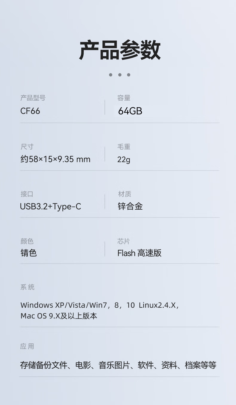双接口均采用USB3.2,广泛兼容和更多设备对口;Flash 芯片高速版;360°旋转保护安全堡垒锖色电镀金属效果,高档大气