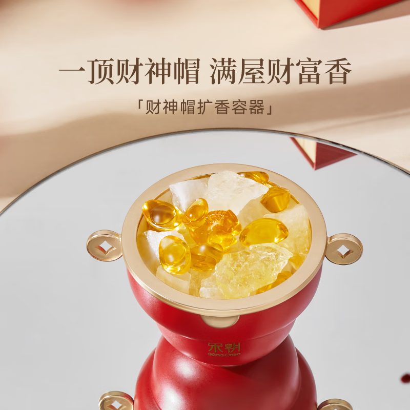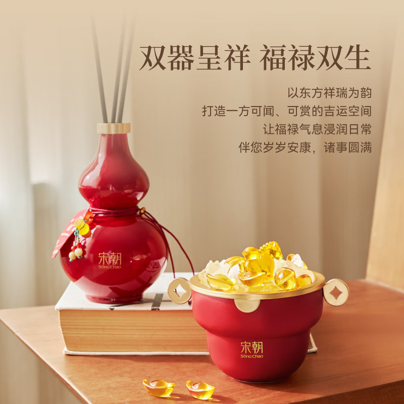 产品内容物:葫芦扩香容器、葫芦珠串佩饰、织唛、无火香薰补充液、扩香棒、财神帽扩香容器、扩香晶石、扩香石精油、琉璃元宝、琉璃小马