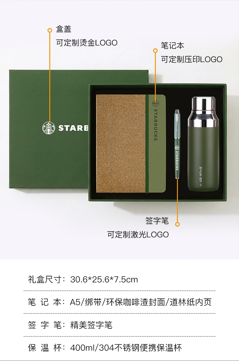 配置清单:天地盖礼盒尺寸30.6*25.6*7.5cm+A5笔记本/绑带/环保咖啡渣封面/道林纸内页+精美签字笔+400ml/304不锈钢保温杯