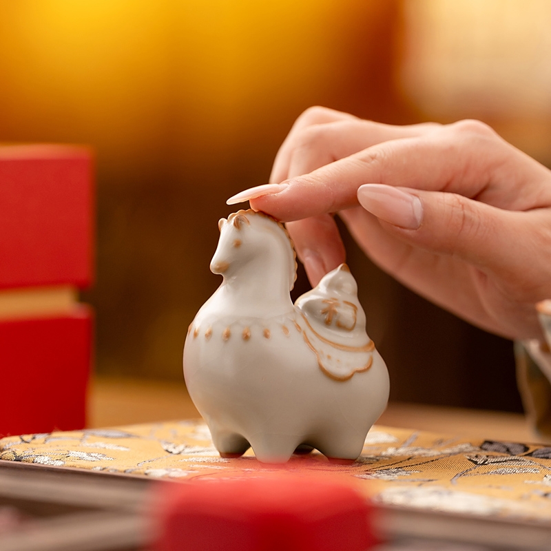 马年开门红礼品,马上有钱杯子摆件套装,亚黄汝瓷;马背上葫芦造型,寓意福禄。玛瑙入釉,蝉翼开片;内外皆有花面,家有千财万贯,不如汝窑一片。独家专利