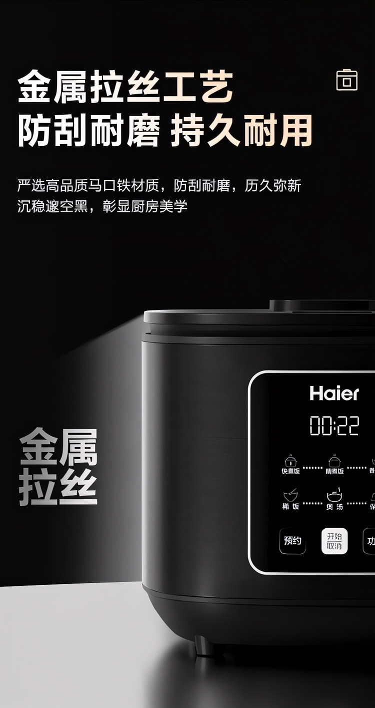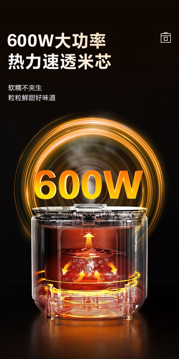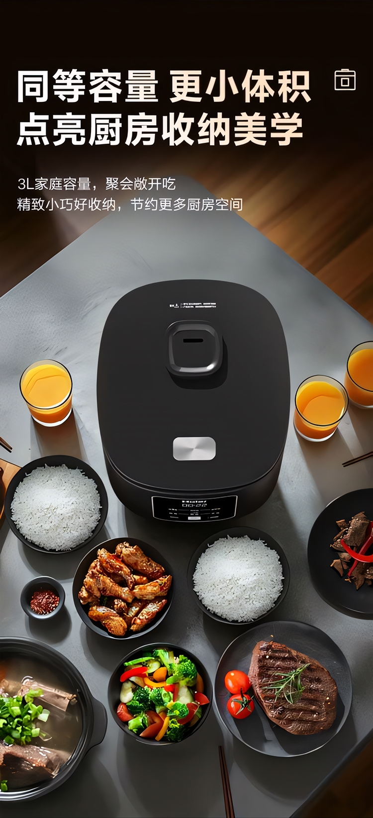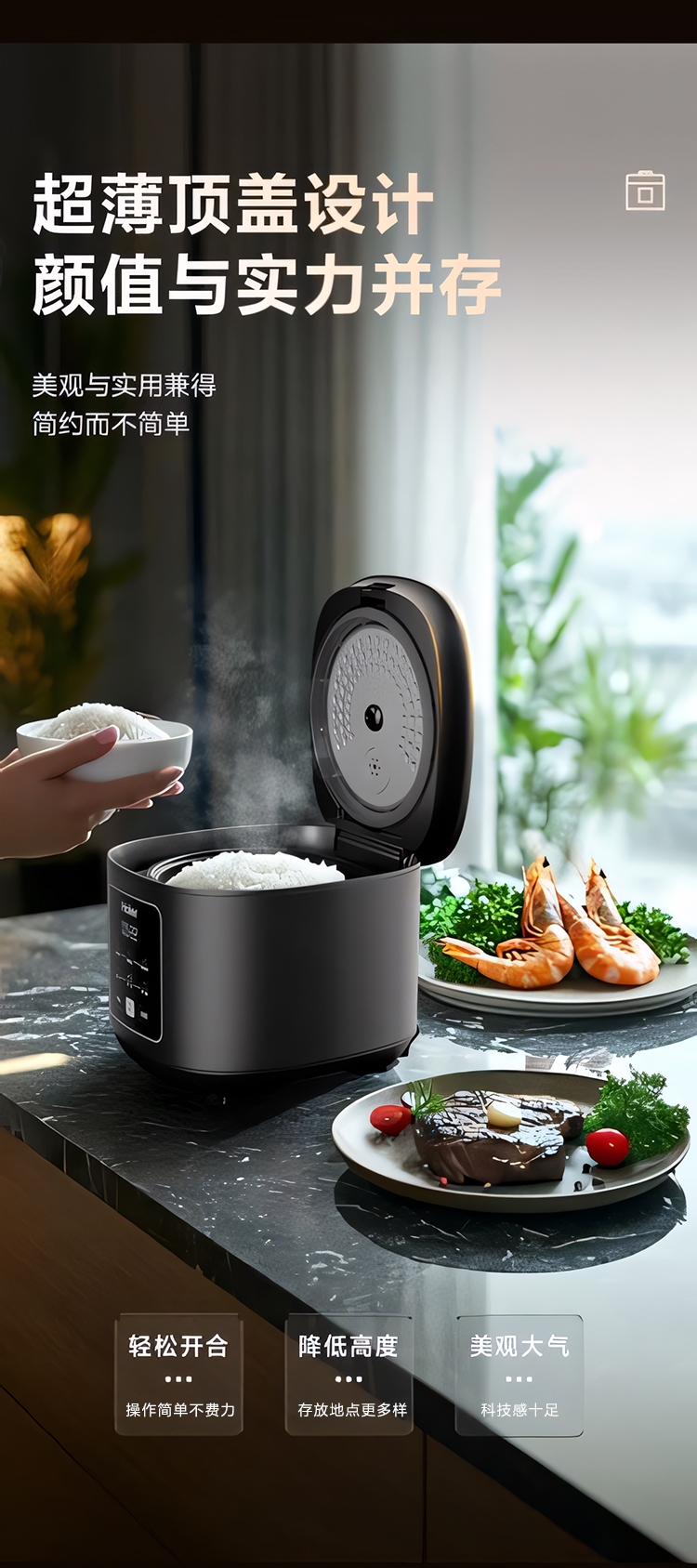 超薄顶盖设计,科技感十足;5大烹饪功能,极简操作;相同容量,更小体积,空间节约