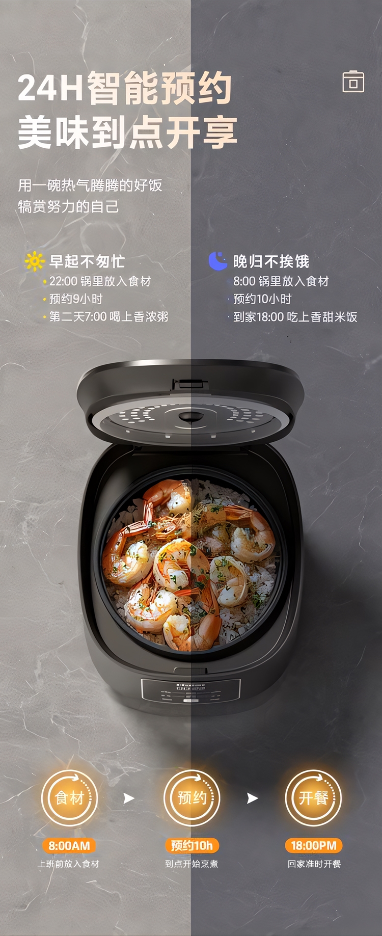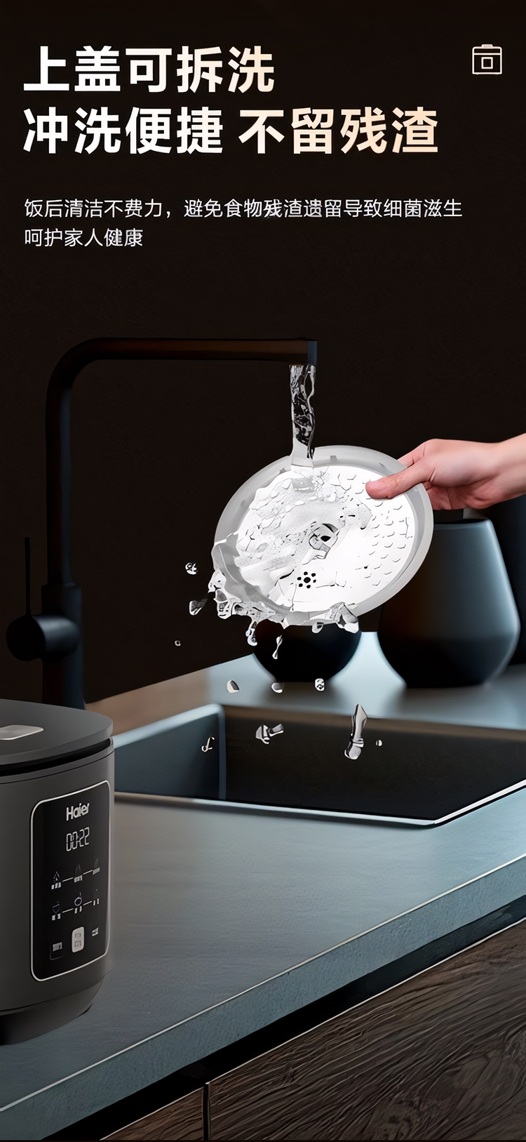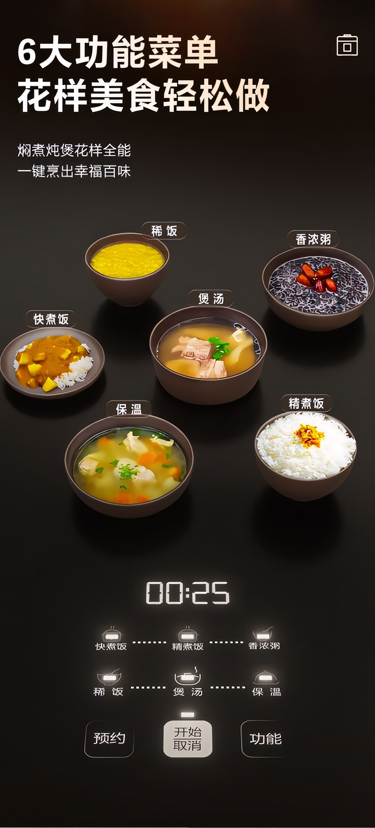 超薄顶盖设计,科技感十足;5大烹饪功能,极简操作;相同容量,更小体积,空间节约