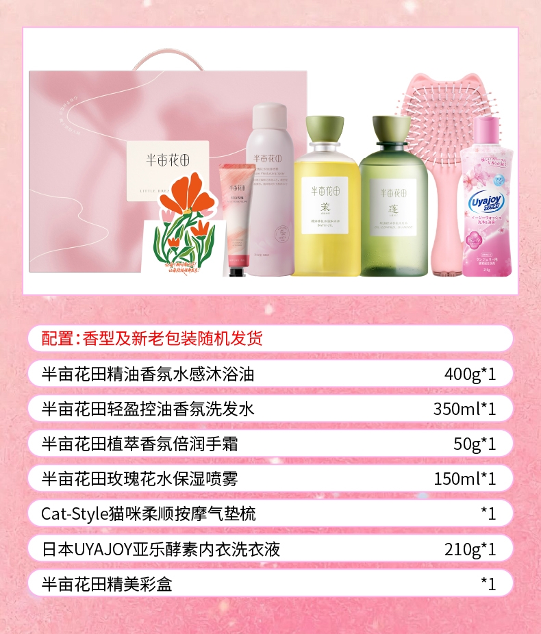 配置清单:半亩花田精油香氛水感沐浴油400g*1 半亩花田轻盈控油香氛洗发水350ml*1 半亩花田氨基酸净润洁面慕斯300g*1 半亩花田植萃香氛倍润手霜50g*1 半亩花田玫瑰花水保湿喷雾150ml*1 英国Kesemake克丝漫内衣内裤专用清洗剂100g*1 精美贺卡*1(量大可定制) 半亩花田精美彩盒ZS205*1