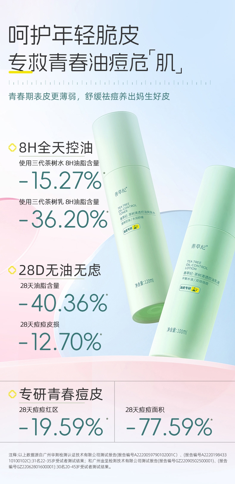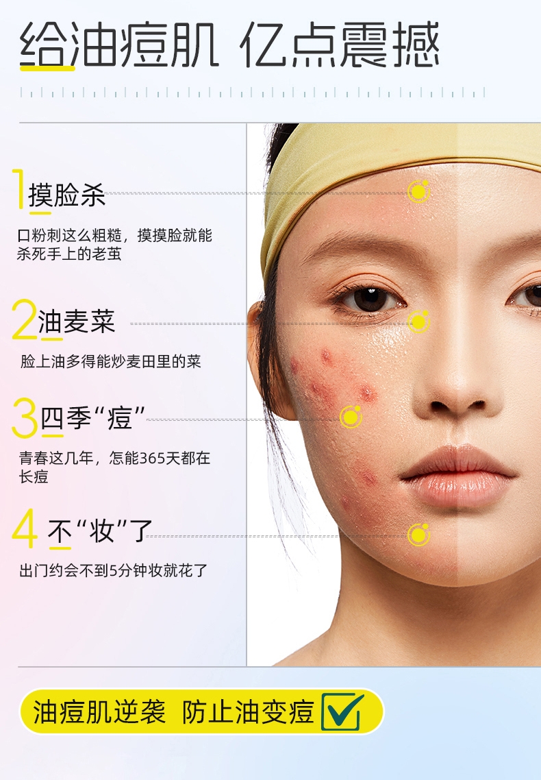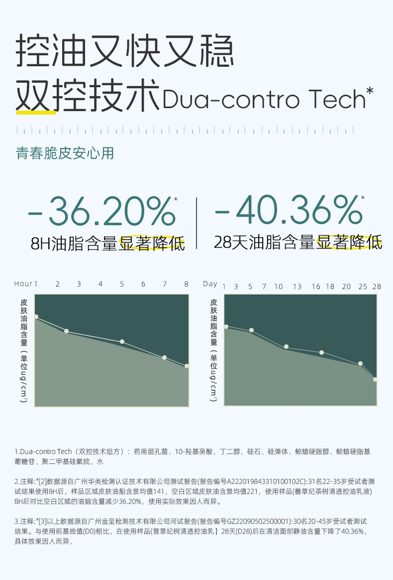 有控油、祛痘、改善痘痘肌等效果;研制三重纯露控油组方;青春脆皮安心用