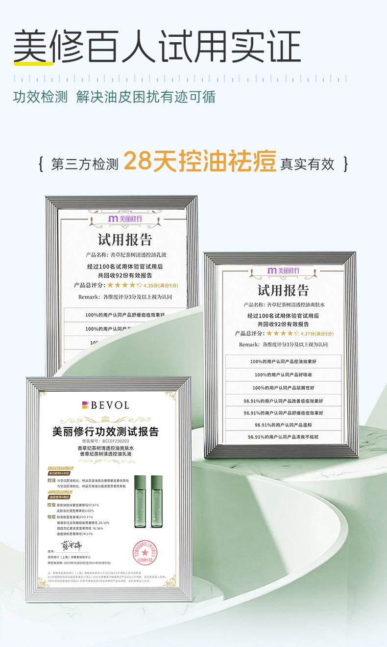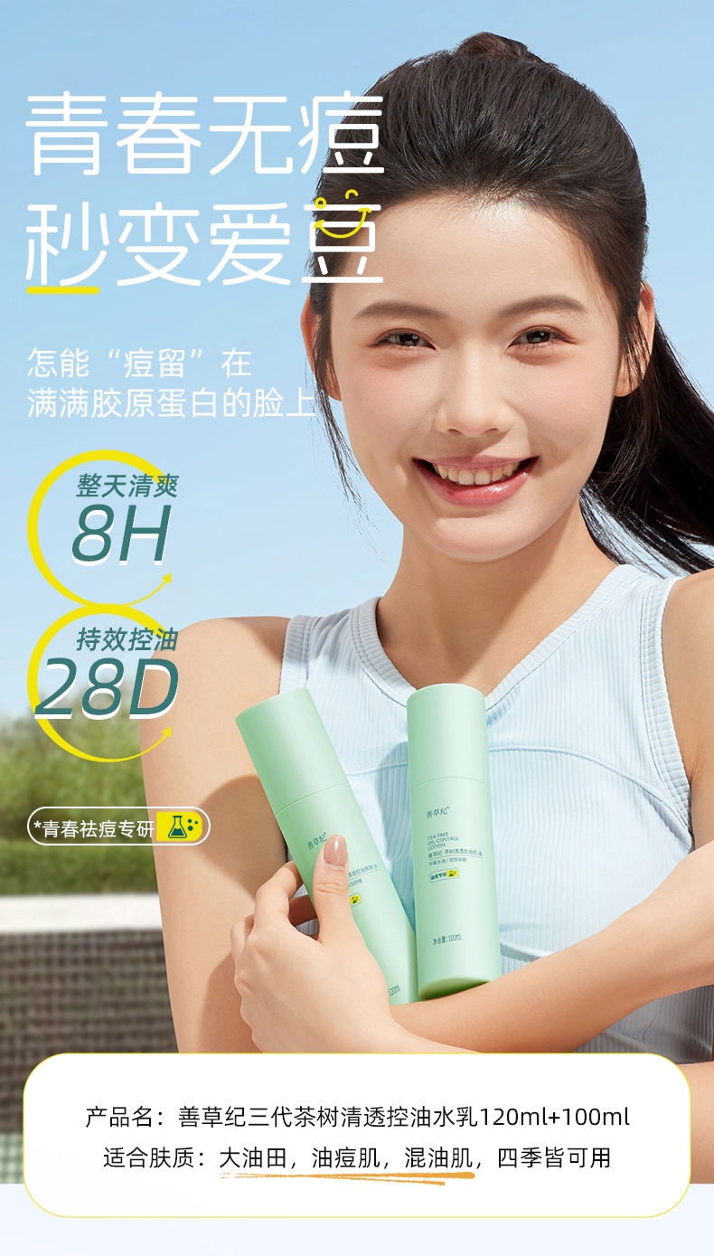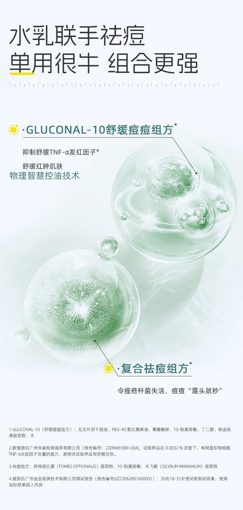 有控油、祛痘、改善痘痘肌等效果;研制三重纯露控油组方;青春脆皮安心用