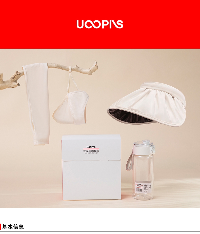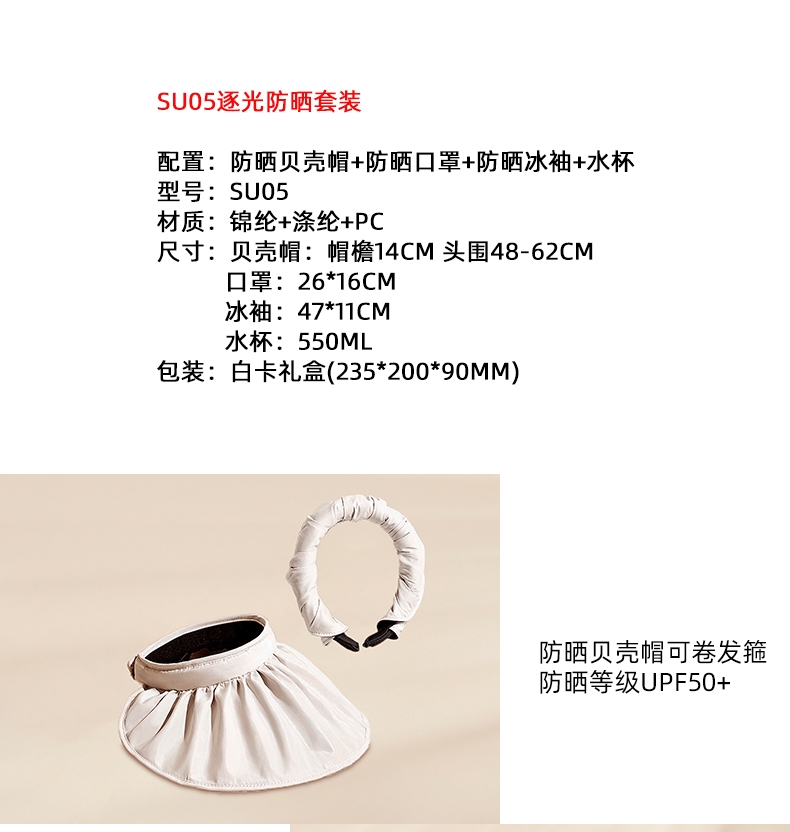 配置:防晒贝壳帽+防晒口罩+防晒冰袖+水杯